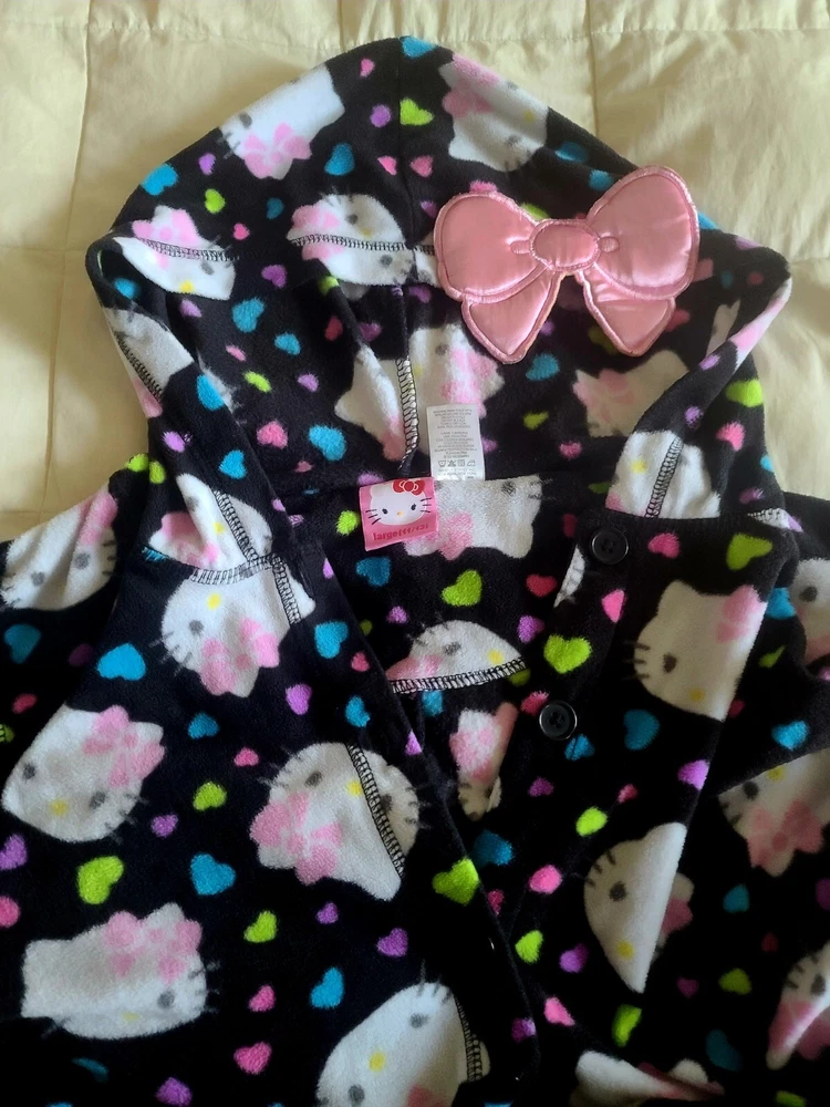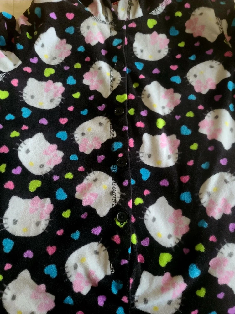 Step into cozy comfort with these Hello Kitty size large (11-13) footed pajamas, perfect for those chilly fall and winter nights. Featuring a playful Hello Kitty pattern in classic black, these pajamas are designed with a hood for extra warmth and a button-front closure for easy wear. The long sleeves and polyester material ensure both comfort and durability, while the cute bow accents add a touch of whimsy. Ideal for any Hello Kitty fan, these pajamas are machine washable for hassle-free care. They're a fun addition to any sleepwear collection, combining both style and functionality. Whether you're lounging at home or settling in for a cozy night's sleep, these footed pajamas are sure to become your new go-to for relaxed evenings.