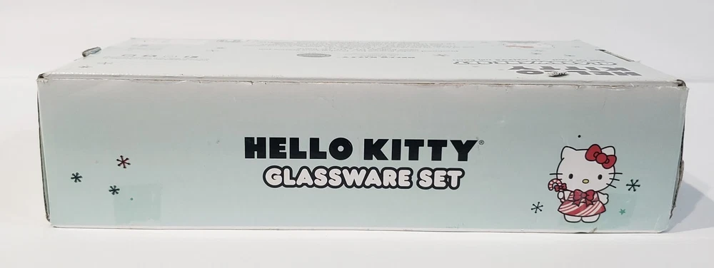 New hello kitty glass set. Box has some wear. Two rips on top of box held by tape. (See pics) Free shipping and handling