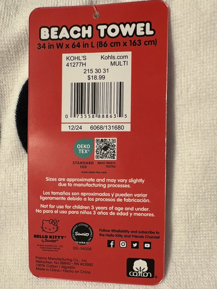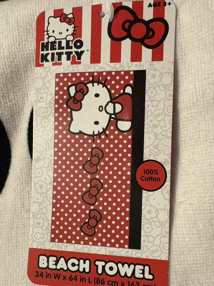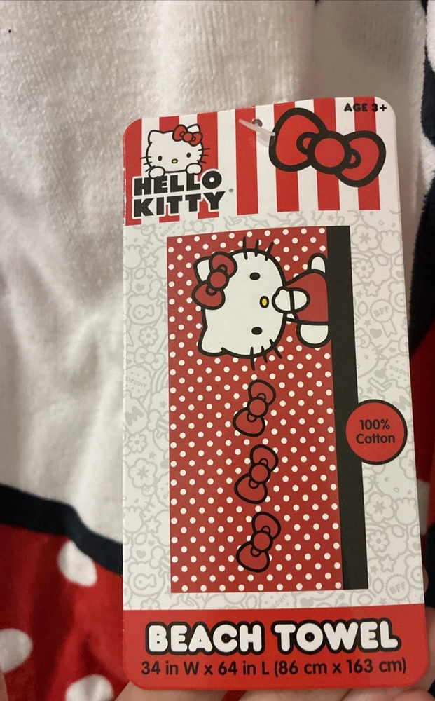 Hello Kitty Bows Beach or Bath Towel FEATURES The towel is lightweight and folds easily to carry when traveling. EASY CARE: You can throw the towel into the washer and dryer without worrying about the colorful pattern fading, making it a fun bathing, swimming and shower accessory. GREAT FOR INDOOR & OUTDOOR USE: This versatile towel brings colorful style and cozy comfort to a bathroom, pool, or beach near you. WHAT'S INCLUDED 34" X 64" X .5" CONSTRUCTION & CARE Cotton Machine wash Imported SKU #55311265 When viewing colors on the computer and your phone. The pictures are for reference only. Actual color tone may vary from monitor to monitor as well as in person. Please note - when ordering ANY item online, colors may be slightly different upon physical delivery. Pattern placement may vary. Please ask all questions before purchase. ANY QUESTIONS PLEASE ASK This item is new. We had a brick and mortar store that we closed and we are listing everything on eBay. If you are looking for anything please ask. If we have we will list it and notify you first. Please CLICK ON the link below to go to MY EBAY STORE: https://www.ebay.com/str/Longaberger-Vera-Bradley-Coach-ETC To see many more items. We have lots of items not yet listed. So if you are looking for something and can’t find it then send an email and we will let you know if we have it and then we will get it listed. You can scroll down the left side of the page to find the items that you want to look at. We have: Dinnerware ~~ Longaberger, Pfaltzgraff, and Corelle. Purses and Travel items in Vera Bradley, Longaberger, and Coach Baking items -- Longaberger, Pfaltzgraff, and Pyrex Clothing items and Shoes Lots of Collectibles and Christmas items -- Dept 56, Fenton, Thomas Kinkade, Peter Max, Andrew Warden, Boyds Bears, Ty Beanie Babies & more We have Dinnerware ~~ Longaberger, Pfaltzgraff, and Corelle. TERMS: FOR BUY IT NOW: Immediate Payment FOR AUCTIONS: Payment must be received within 24 hours after auction close. If no payment is received, We will request refund from eBay for our fees; eBay will record a strike against you; The item will be re-auctioned. SHIPPING: We can only ship to the address that the payment tells us to ship to. We cannot change the shipping address after you have paid for the item . Please make sure you are listing the correct phone number as the carrier may call you if they have a problem delivering your item We use online FedEx or UPS for heavy or large items. We reserve the right to choose the one that is picking up at the time that we have your package ready to ship. Items marked as free ship with FedEx or UPS can only be shipped in the continental United States must ship to a street address. Contact us if you want this shipped to Alaska, Hawaii or a Post Office Box REFUNDS: If you return items then they must be returned in the same condition that it was shipped. For instance. If the leather purses had protective covering then it must be returned in the same condition. If an item had a box then the original box must be returned without damage. Factory sealed items eligible for return will be accepted if still sealed. But Factory sealed items returned open for any reason will be refunded 50% of the original purchase price. If the item is not returned in the same condition then we have the option of deducting fees up to 50% If an item is returned with that had FREE SHIPPING, then the original shipping amount will be deducted from the refund amount plus you will pay shipping for the return of the item.