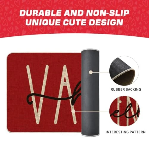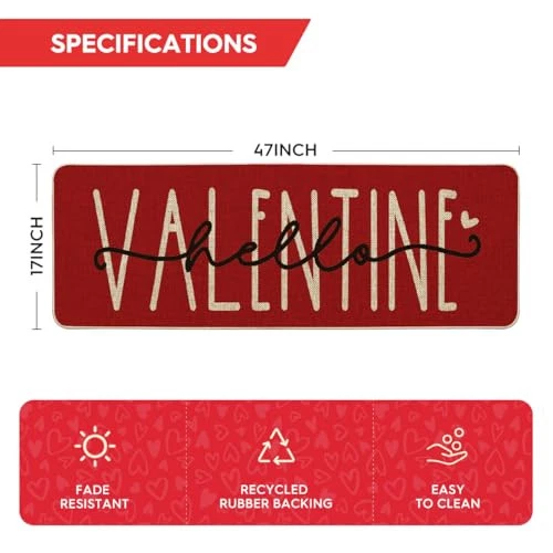 30 Days Return Policy Fast Delivery Trusted seller Hello Valentine Red Valentine's Doormat, Anniversary Wedding Home Decor Low-Profile Rug Switch Mat for Indoor Outdoor 17x47 Inch Product Description PERFECT FOR HOME DECOR : Welcome guests to your home with this unique, seasonal doormat. Perfect for any deck, patio, porch, veranda, and entryway and extend a warm welcome to all who enter your home DURABLE AND NON-SLIP : Backed with non-slip recycled rubber and topped with polyester felt that is low-profile to reduce chances of tripping, high-quality durable construction that is stain resistant LOW-PROFILE DESIGN : Measures 17" x 47" and features 0.25" slim, making it just the right size for every entryway. Our stylish doormats make a beautiful addition to your entryways, craft rooms, and office spaces EASY TO CLEAN : No scrubbing needed. Doormats are quick and easy to clean, just spray off with a hose or use a sponge and mild detergent to clean off dirt or yard debris. Material: 5% Polyester 95% Rubber. Imported, Country of origin: China UNIQUE CUTE DESIGN : Doormat tops were printed with unique and stylish patterns. A beautiful and creative way to decor your home when keeping clean Shipping Returns Payment Shipping Shipping is FREE to all addresses other than APO/PO boxes in the lower 48 states. All our stock ships from US-based warehouses. Shipped via USPS or UPS (depending on location and package weight) Unless stated otherwise, all orders will ship within 24-72 hours of your payment being processed. Check our feedback to see the great reviews of FAST shipping we offer. Returns As our valued customer, we will do our best to make sure the product you receive arrives to you on time and as expected. If you are not satisfied with your purchase, please contact us within 30 days of receiving your order to process a return. Payment We currently accept payment via eBay managed payments only. Once payment is cleared, we will dispatch your shipment within 1-3 business days. Please refer to the "Shipping" tab for more information regarding shipping speed to your destination.
