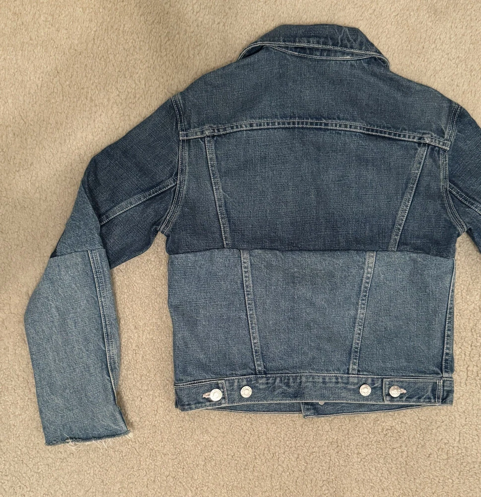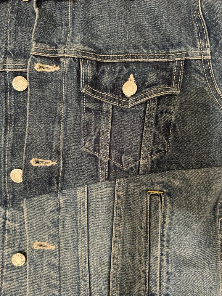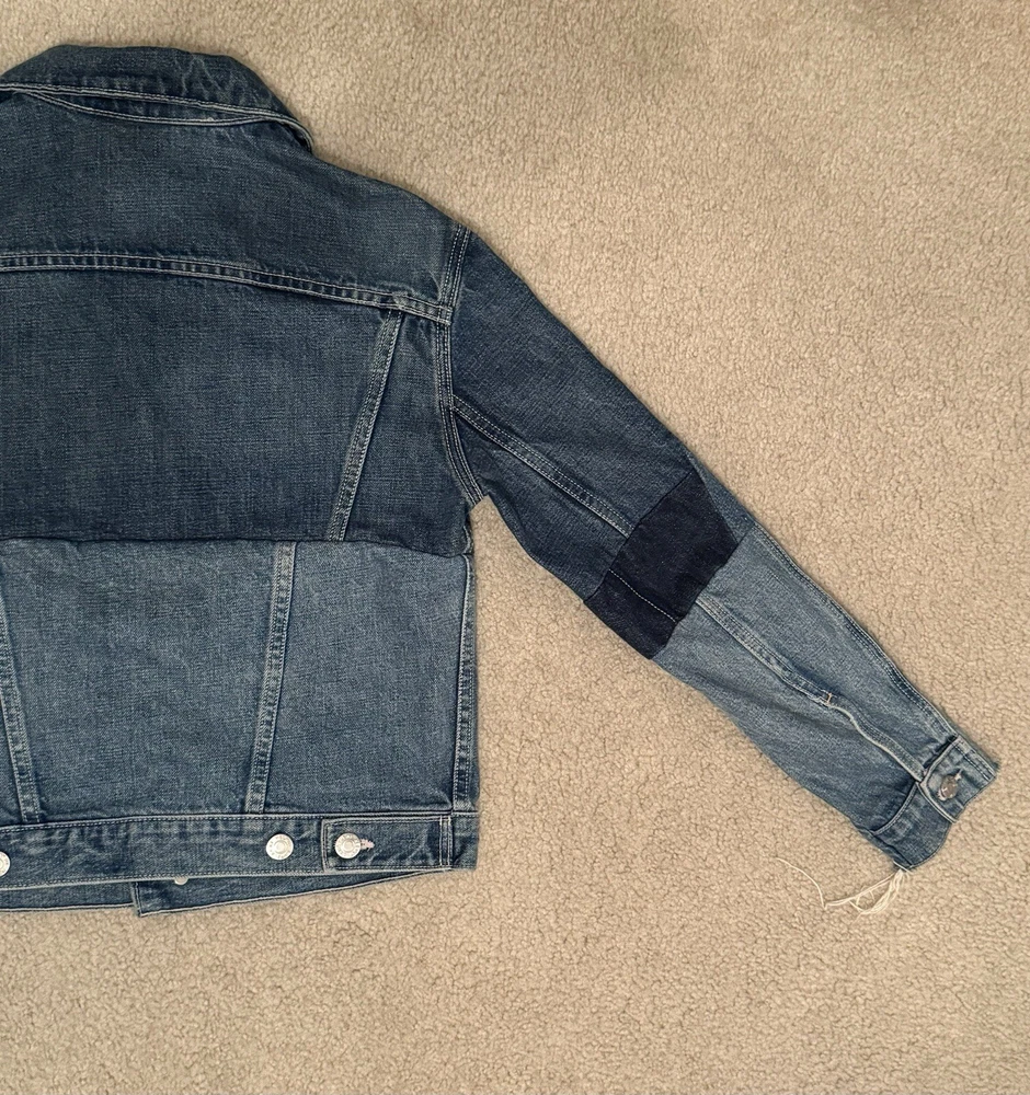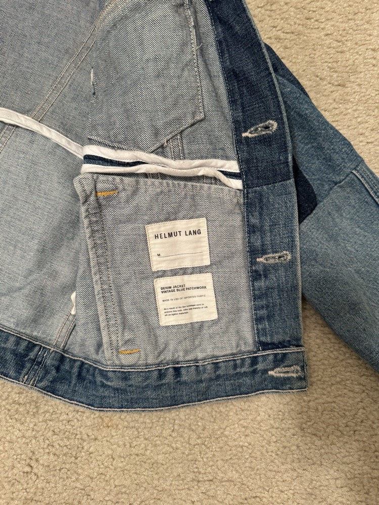 Helmut lang denim vintage blue patchwork jacket Size: M Worn about 2 times and just didn’t like the fit on myself Sleeve length from inner pit: (unfolded) 18 in Length from shoulder to waist: 18 in Width from pit to pit: 18 in