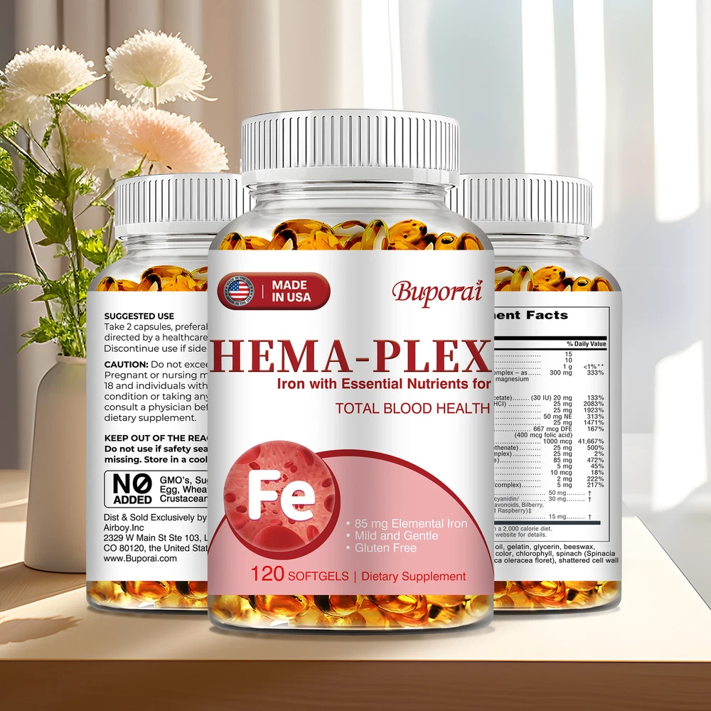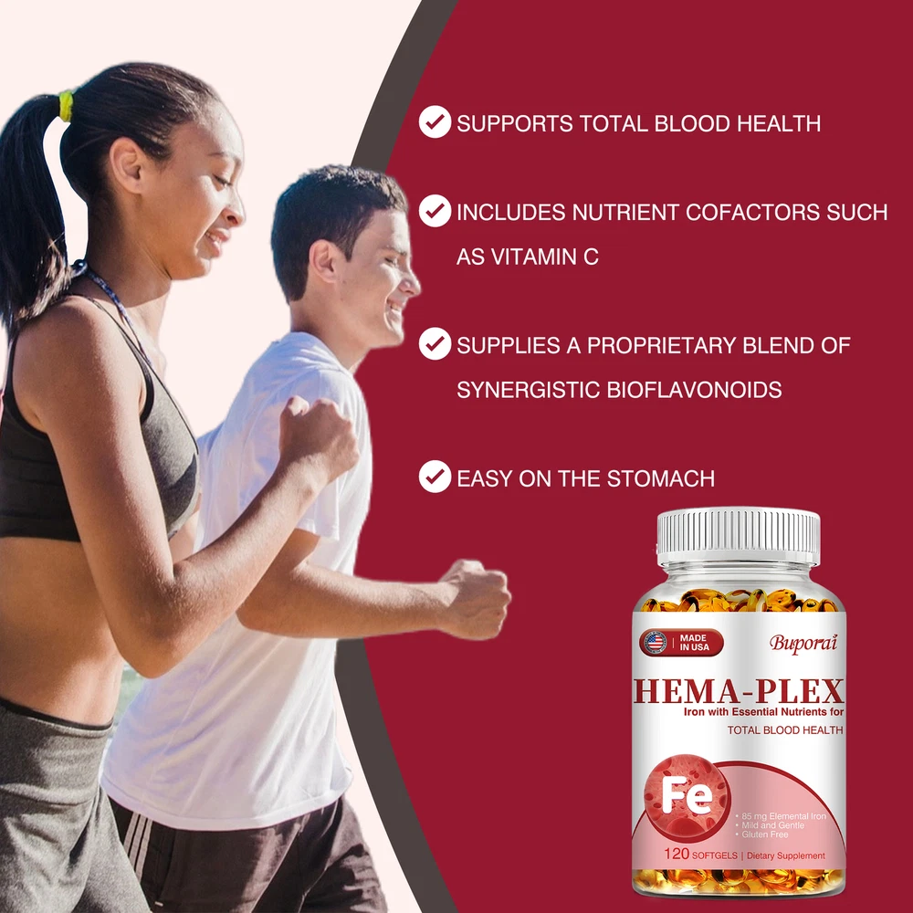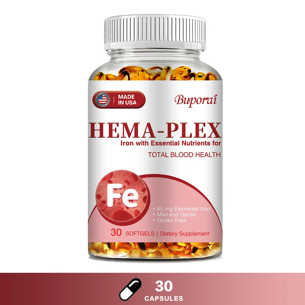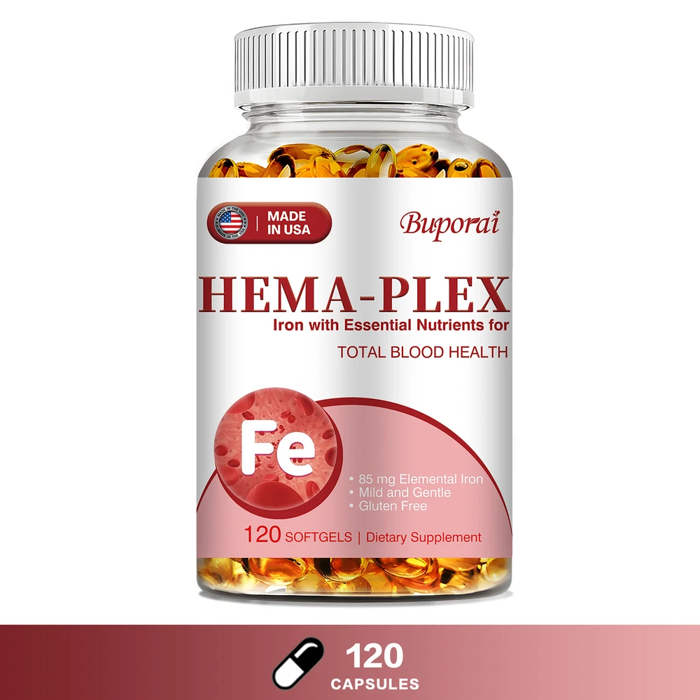 Effects: Erythropoiesis,Cardiovascular Health,Relieve Anemia Ingredients: Multivitamin, Iron Directions: Take 1-2 softgels twice a day after meals. Shipping: Ships within 48 hours on working days. Shelf life: 2 years Description: Hema-Plex Iron combines iron with powerful blood-health cofactors to support healthy red blood cells. Each capsule contains 85 mg of elemental iron to help maintain focus and overall health. It can safely increase your hemoglobin levels. Essential for energy and cognitive function, a strong immune system, reproductive health and red blood cell formation. Hema-Plex Iron mild and easily absorbed. So you can rejuvenate with highly absorbent, our Hema-Plex Iron softgels support healthy aging, cardiovascular health, and blood health. It helps reduce fatigue and anemic dysfunction caused by low iron. Our Hema-Plex Iron softgels are non-GMO, gluten-free, vegan, manufactured in a GMP certified facility and contain no artificial colors, preservatives, wheat, peanuts and soy. Document