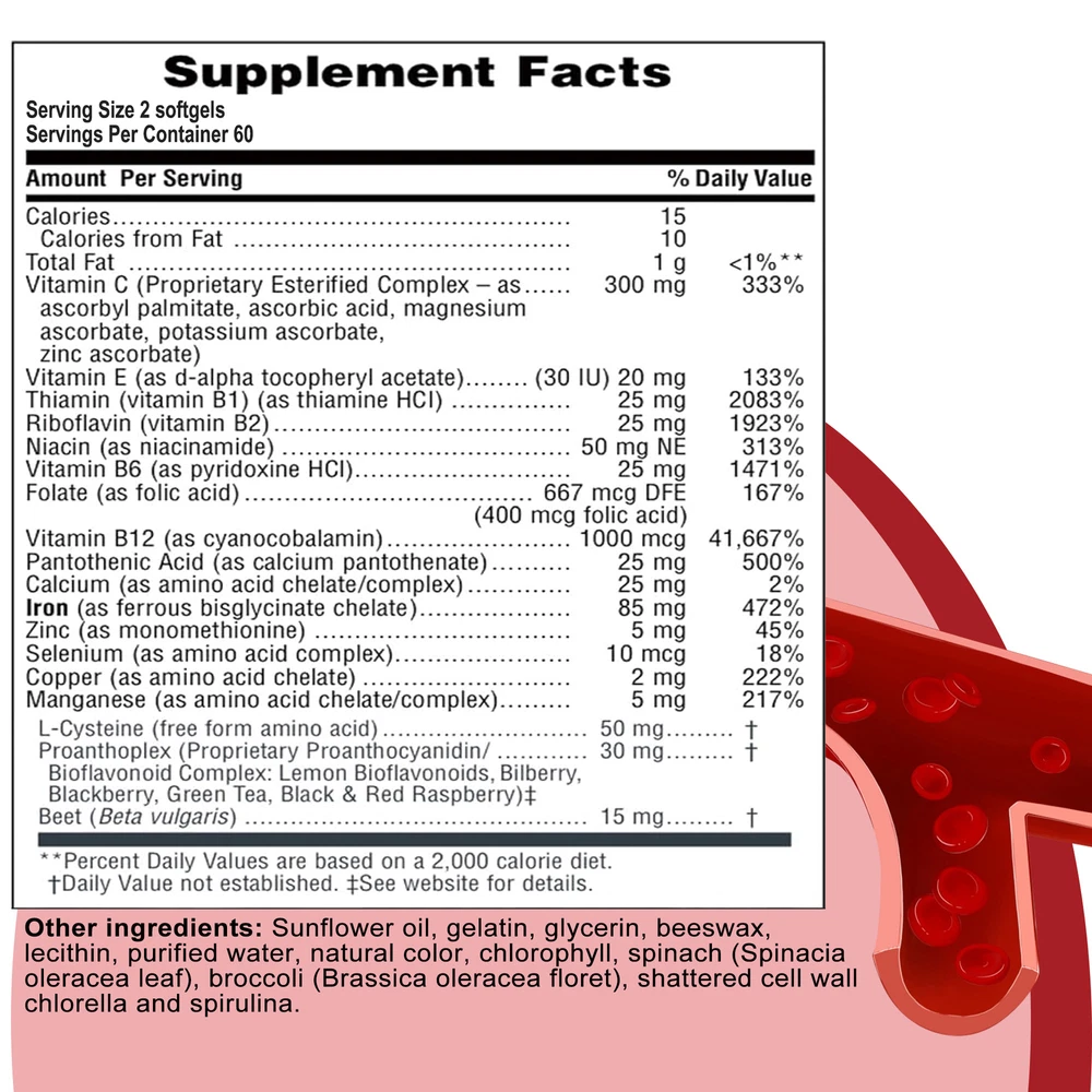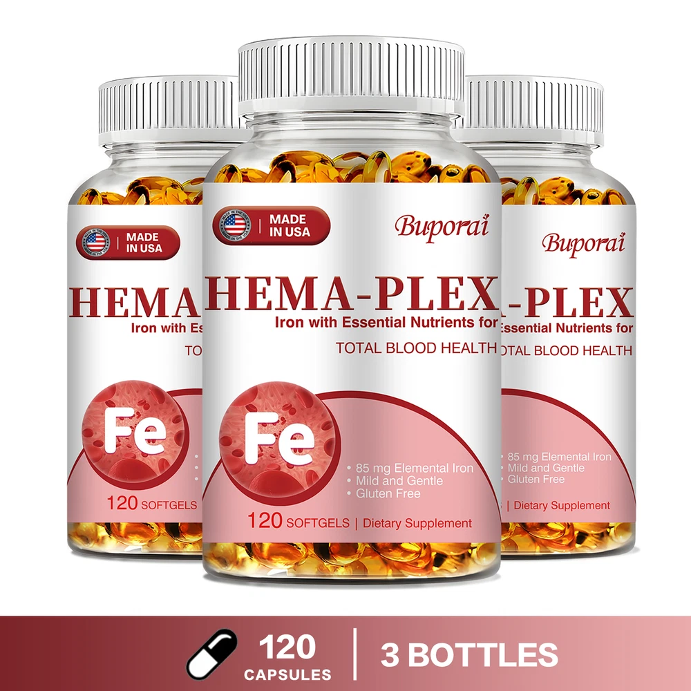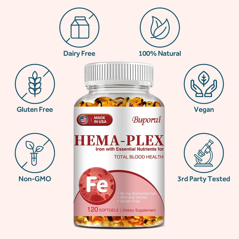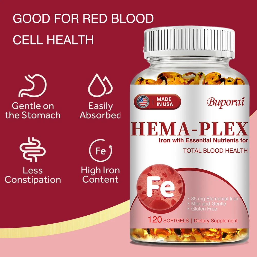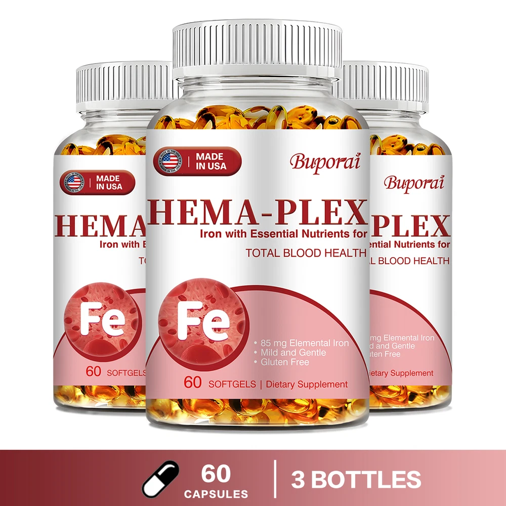 Effects: Erythropoiesis,Cardiovascular Health,Relieve Anemia Ingredients: Multivitamin, Iron Directions: Take 1-2 softgels twice a day after meals. Shipping: Ships within 48 hours on working days. Shelf life: 2 years Description: Hema-Plex Iron combines iron with powerful blood-health cofactors to support healthy red blood cells. Each capsule contains 85 mg of elemental iron to help maintain focus and overall health. It can safely increase your hemoglobin levels. Essential for energy and cognitive function, a strong immune system, reproductive health and red blood cell formation. Hema-Plex Iron mild and easily absorbed. So you can rejuvenate with highly absorbent, our Hema-Plex Iron softgels support healthy aging, cardiovascular health, and blood health. It helps reduce fatigue and anemic dysfunction caused by low iron. Our Hema-Plex Iron softgels are non-GMO, gluten-free, vegan, manufactured in a GMP certified facility and contain no artificial colors, preservatives, wheat, peanuts and soy. Document
