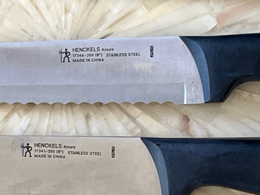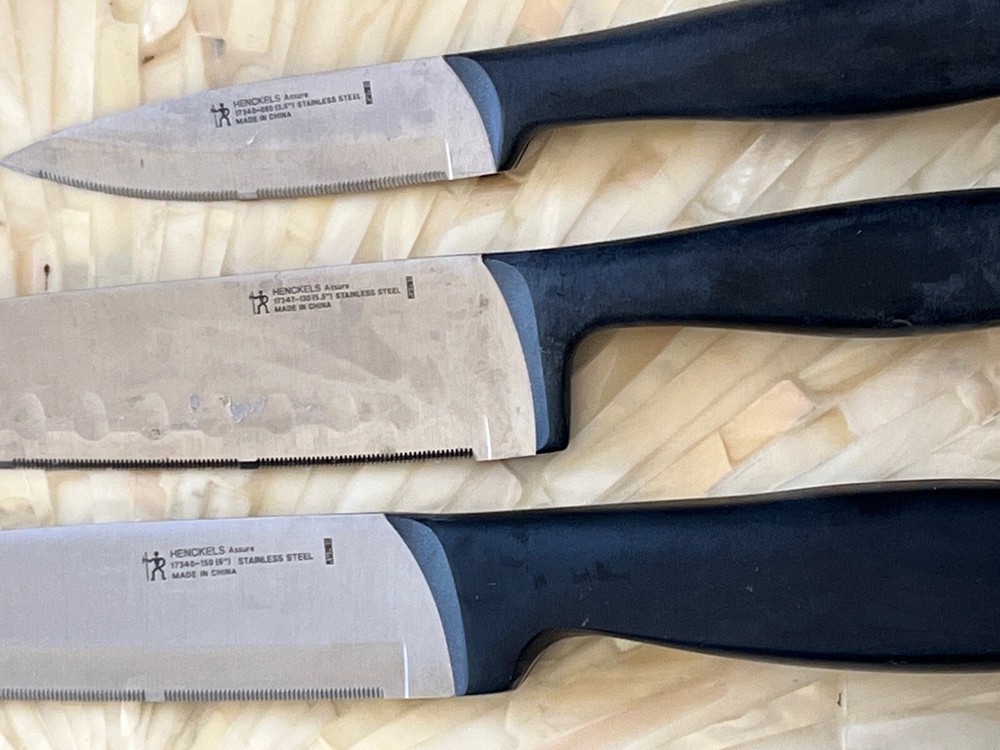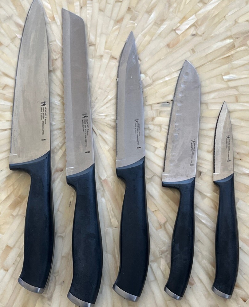 Henckels Assure Knife Set 5 Piece Knives Serrated Stainless Steel Black Handle with Henckels logo on end 17341-200 8” Serrated Chef Knife, 17346-200 8” Serrated Bread Knife, 17347-130 5.5” Hallow edge Santoku, 17340-150 6”serrated knife, 17340-80 3.5” paring knife