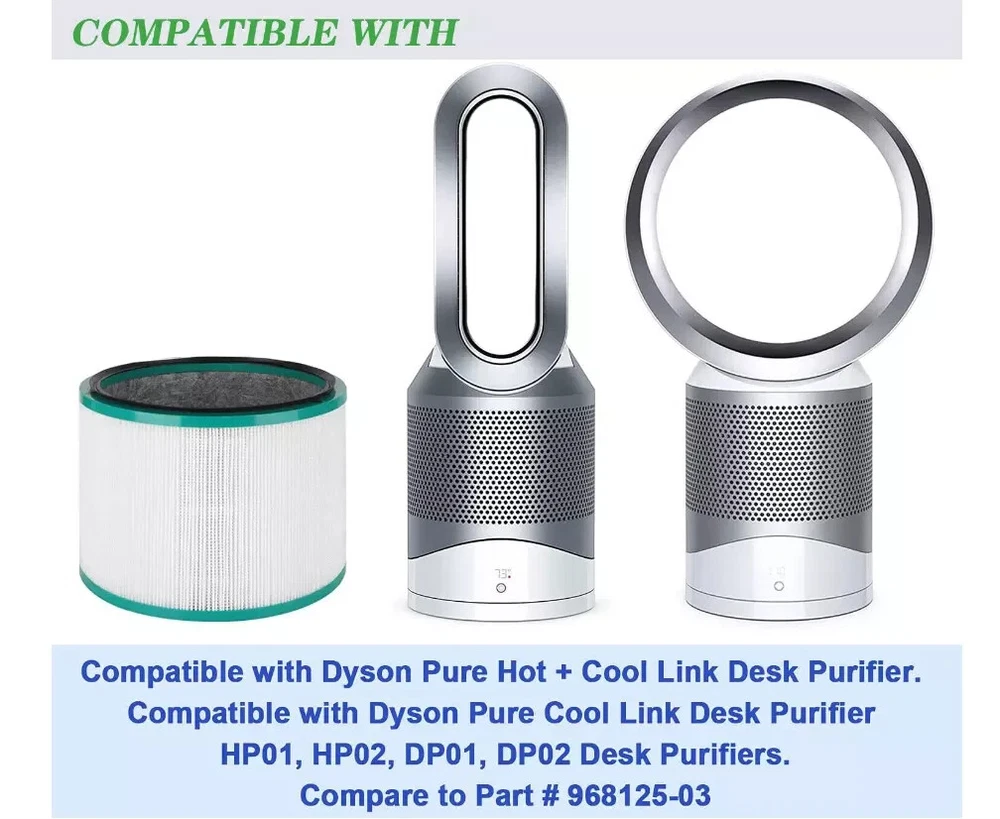 Hepa Filter For Dyson DP01 DP02 DP03 HP00 HP01 HP02 Pure Cool Link Air Purifier Product Description Compatible with Dyson pure hot + cool link HP00 HP01 HP02 HP03 and first generation purifying heaters Pure Hot + Cool Link (part Compatible with Dyson pure cool link desk purifier DP01 DP02 DP03 and first generation Dyson desk purifiers Dyson Pure Cool Link Desk (part numbers: 305214-01, 308033-01, 308034-01, 309423-01, 308404-01). Replace part # 968125-03. 360° HEPA filter captures up to 99.97% of pollutants as small as 0.3 microns in size from your indoor air such as mold spores, pollen, lint, household dust, pets dander and more The inner activated carbon layer is designed to remove unwanted gases caused by smoke, smog, food, pets, diesel fuel and more, it won't re-release particles or odors back into the air Size 5.9" H x 8.3" D. Recommended to replace the filter on average 12 months or depend on usage. Package include: 1x Hepa Filter Shipping: Item will be shipped within 1 business day after clear payment received. We ship from the US.We also provide tracking number for every order so you don't worry about where it is. Shipping is always free to the lower 48 states. Please make sure your ship-to address is correct. We do not ship to PO or APO boxes. Please inquire about shipping to Hawaii, Puerto Rico, Alaska, VI as we do not generally ship items to these locations. There may be an extra shipping charge. RETURNS: We offer free returns with a 30 day return policy.