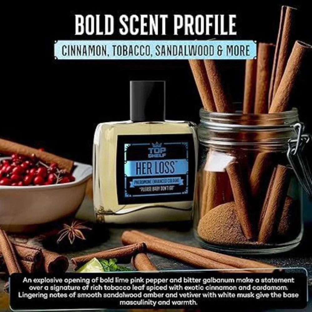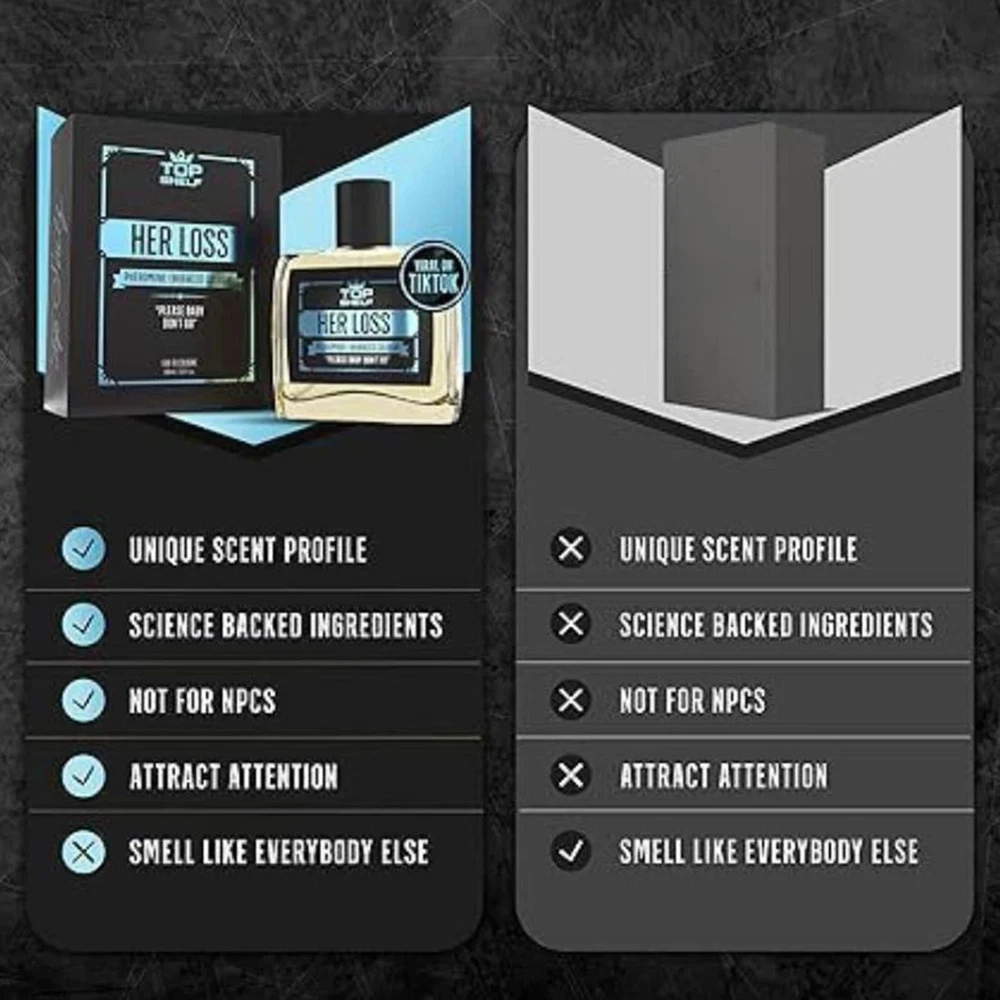 "Her Loss - Pheromone Cologne for Men" is a men's perfume designed to enhance attraction and confidence. With a bold fragrance name of "Pheromone" and a long-lasting formulation, this 50ml spray is a powerful tool for making a statement. Ideal for those looking to leave a lasting impression, this cologne is sure to be a key ingredient in any man's arsenal.