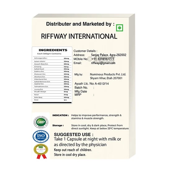 Administration: Oral MPN: NA When to Take: As directed by the healthcare professional. Country/Region of Manufacture: India Number of Pills: 10 Brand: Riffway Features: Natural, Organic Department: Women Expiration Date: Comes with latest exp date Dosage: As directed by the healthcare professional. Type: Herb UPC: Does not apply Scent: Herbal Active Ingredients: Ashwagandha, Ginseng, Safed Musli, Kavach Beej, Gokhru, Shudh Shilajit Type of Diet: Ayurvedic, Herbal Formulation: Capsule Main Purpose: Energy & Endurance, Immune Support, Men's Health, enhance libido gtin13: Does not apply Ingredients: Ashwagandha, Ginseng, Shatavari (Asparagus Racemosus), Safed Musli, Salam Mishri, Kavach Beej, Gokhru, Shatavari, Akarkara, Shudh Shilajit, Kesar Item Weight: NA