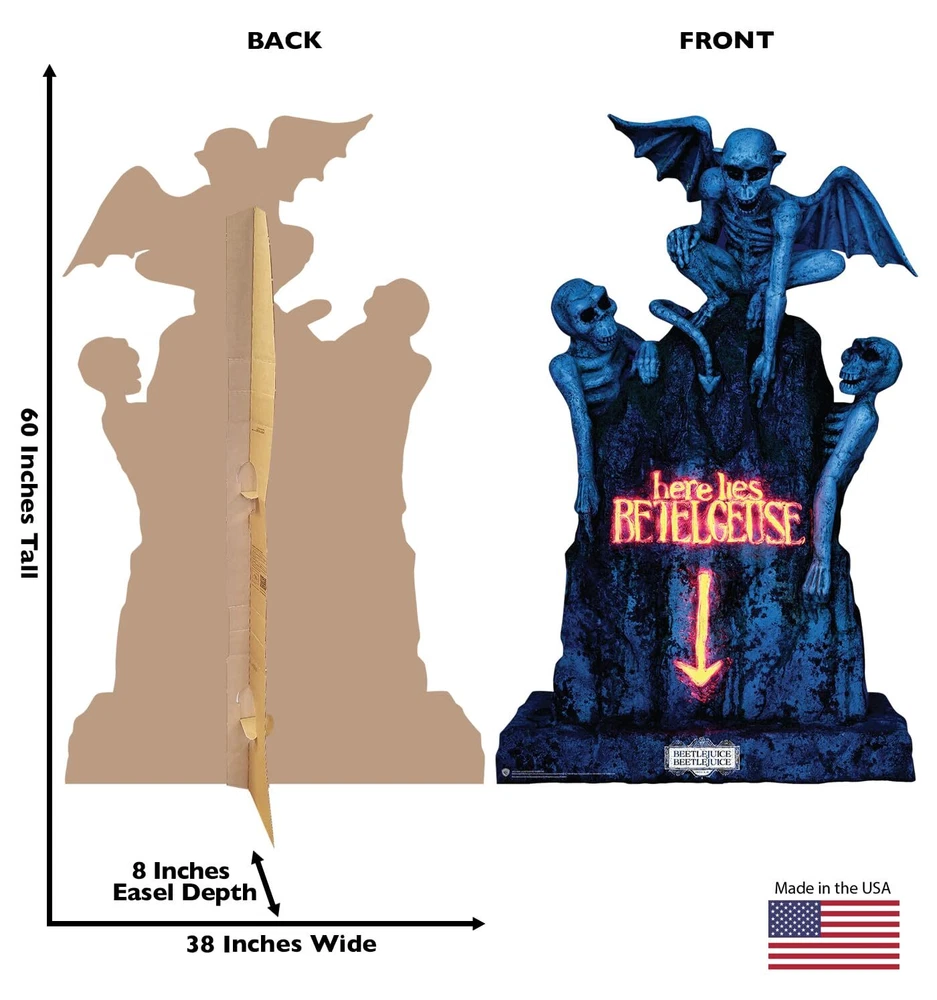 Here Lies Betelgeuse Headstone Life Size Cardboard Cutout Standup - Beetlejuice This is a cardboard cutout of Here Lies Betelgeuse Headstone from the new movie Beetlejuice 2. Easy to set up, it features a single-sided, high-quality print on cardboard with an easel on the back so that it can stand on its own. Cardboard stand-ups make great decor for parties, photo ops, and events. Order yours today! Features Cardboard Standee Details: Standing size is 60" x 38". Cardboard cutouts are shipped flat and come with pre-scored lines and fold-out flaps, making assembly easy and quick. Durable and Reusable: Made from high-quality, sturdy cardboard, our cutouts are built to last. They can easily be stored and reused for countless occasions, ensuring long-lasting enjoyment. When not in use, cardboard cutouts can be conveniently stored flat to save space. This allows them to be reused for future occasions and events. Versatile and Portable Dcor: Lightweight and easy to move, our cutouts effortlessly fit into any space, making them perfect as party decorations, promotional displays, point-of-sale marketing tools, event backdrops and photo booth props. They are also favored by fans for adding a touch of fandom to their living spaces. Their blend of artistry, convenience, and versatility makes them a beloved choice for fans, marketers, and event planners alike. Memorable Moments: Create memorable moments with family and friends as you pose with life-size representations of your beloved icons. Capture unforgettable photos for your social media posts and reels to share with friends, family, customers and followers. Made in America: Proudly manufactured in the USA. Family owned and operated since 1984. Details Free Shipping All items are shipped from our US-based warehouses via FedEx, USPS, or UPS, depending on the destination and package weight. We aim to dispatch most orders within 24 hours of payment from Monday through Friday. Payment We accept payments through PayPal and major credit cards. Please complete your payment as soon as possible after purchase to expedite the shipping process. 60-day Money-Back Guarantee Your satisfaction is our priority. If you are not satisfied with your purchase for any reason, you may return it within 60 days for a full refund or replacement.