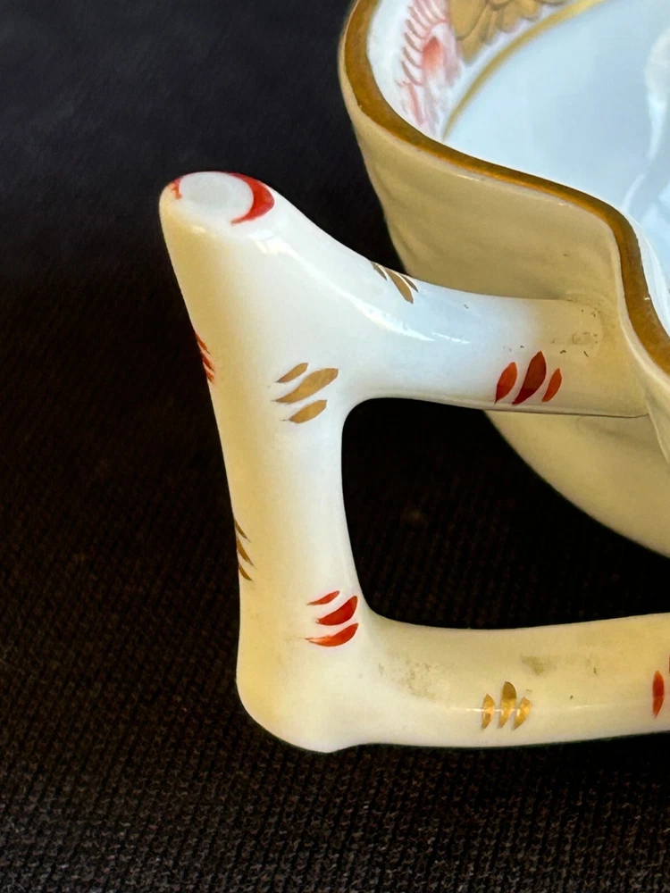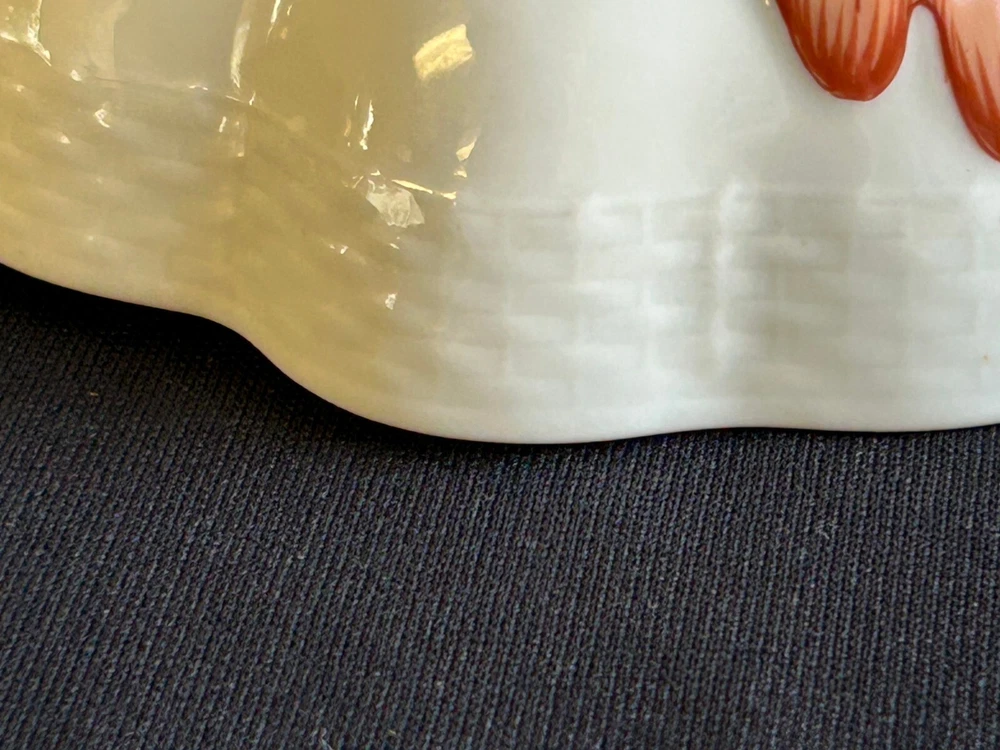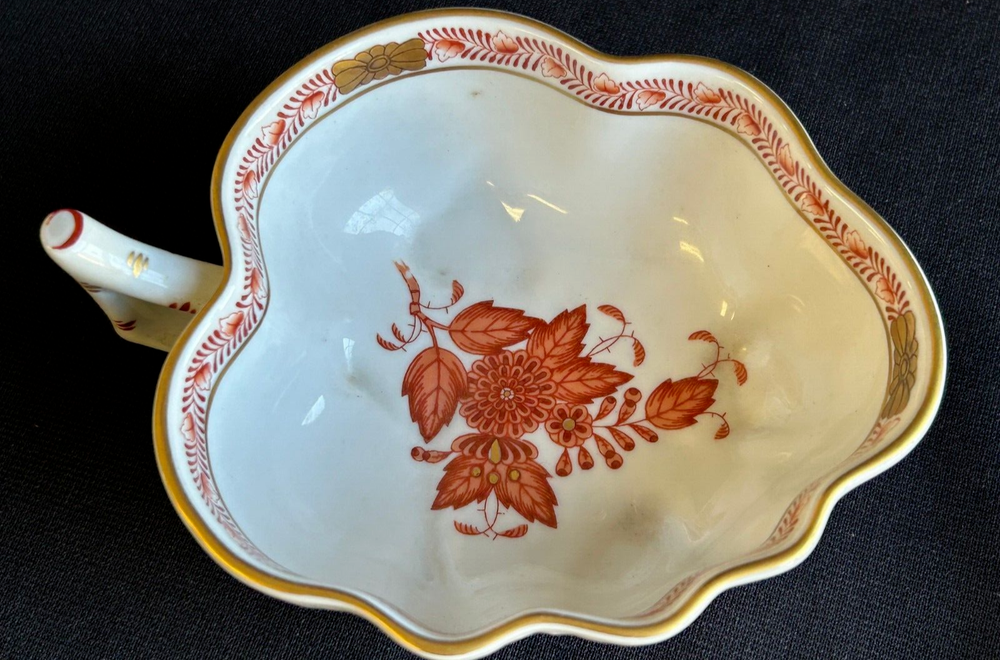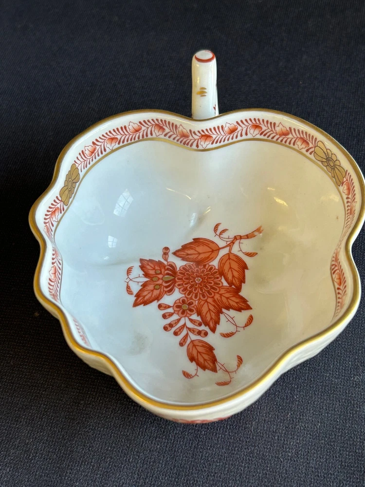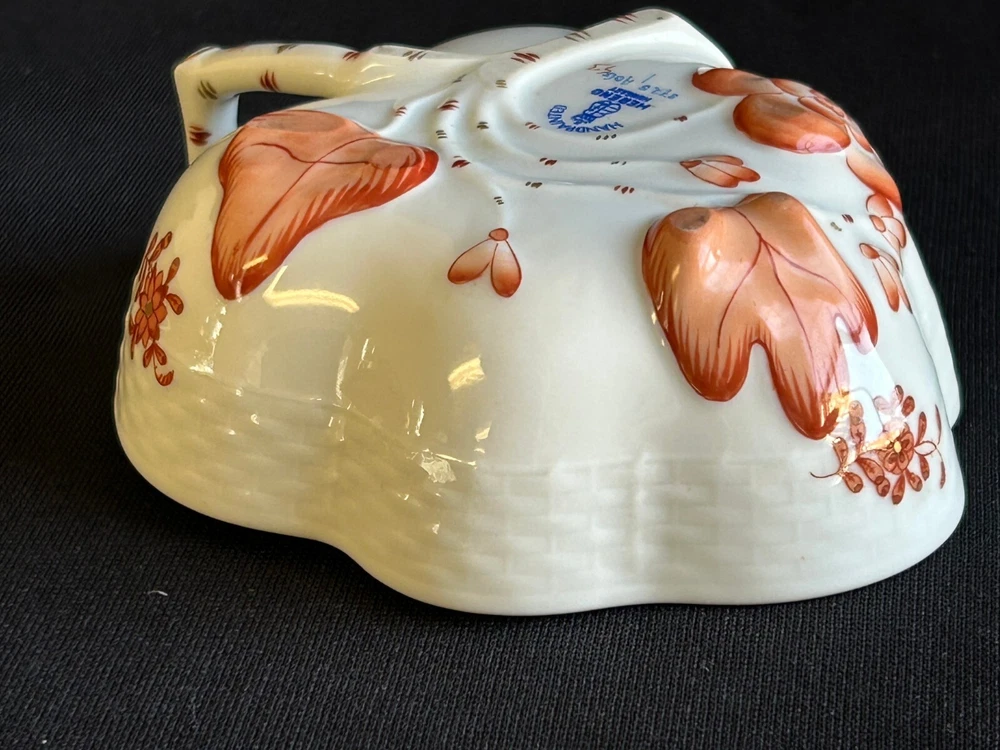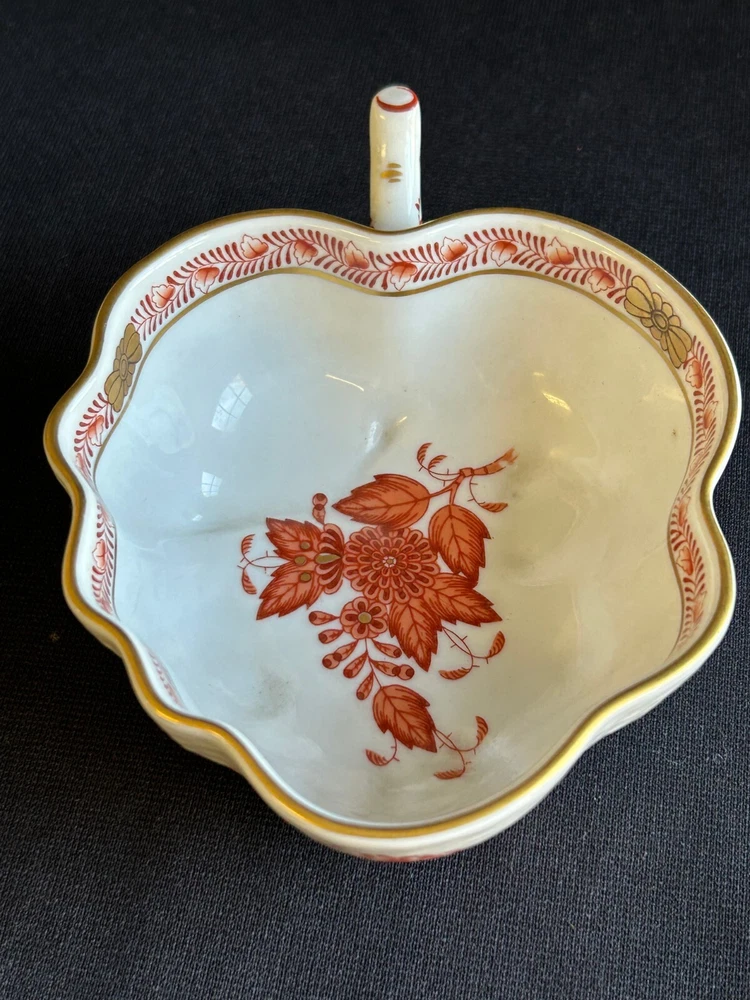 Brick House Antiques of Lewisburg, WV is pleased to offer a Herend Porcelain Lead Dish Small leaf shaped dish with handpainted orange and gold decoration. Basket weave texture on outside rim. Great as a display piece. BUYER PAYS SHIPPING AND HANDLING. WE COMBINE SHIPPING. Local pick up is always welcome!