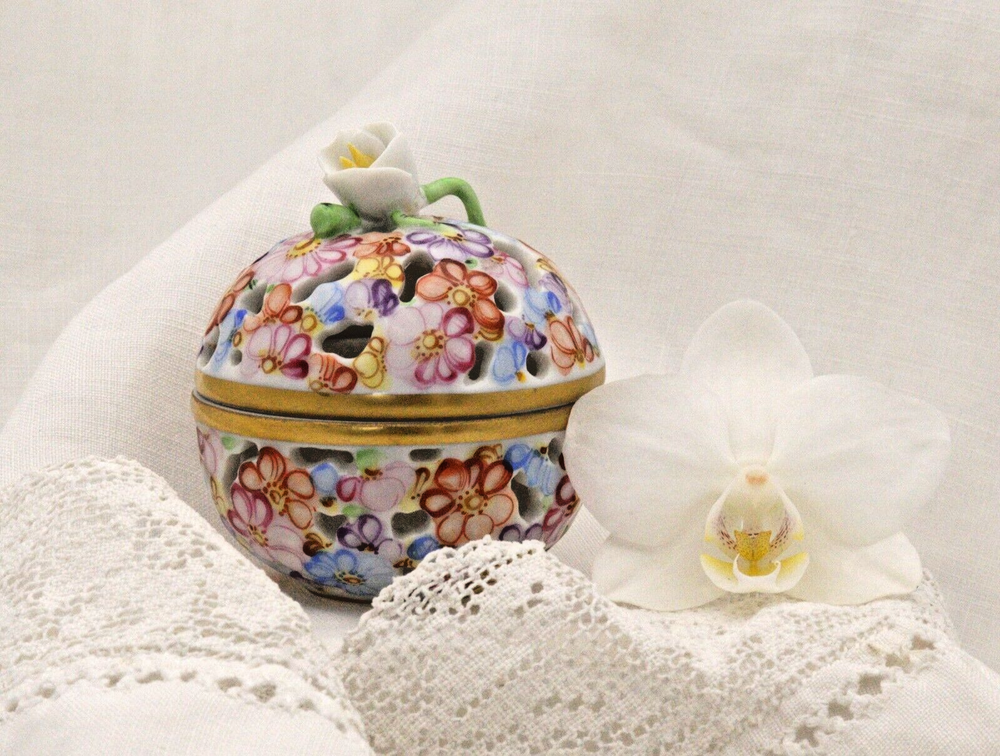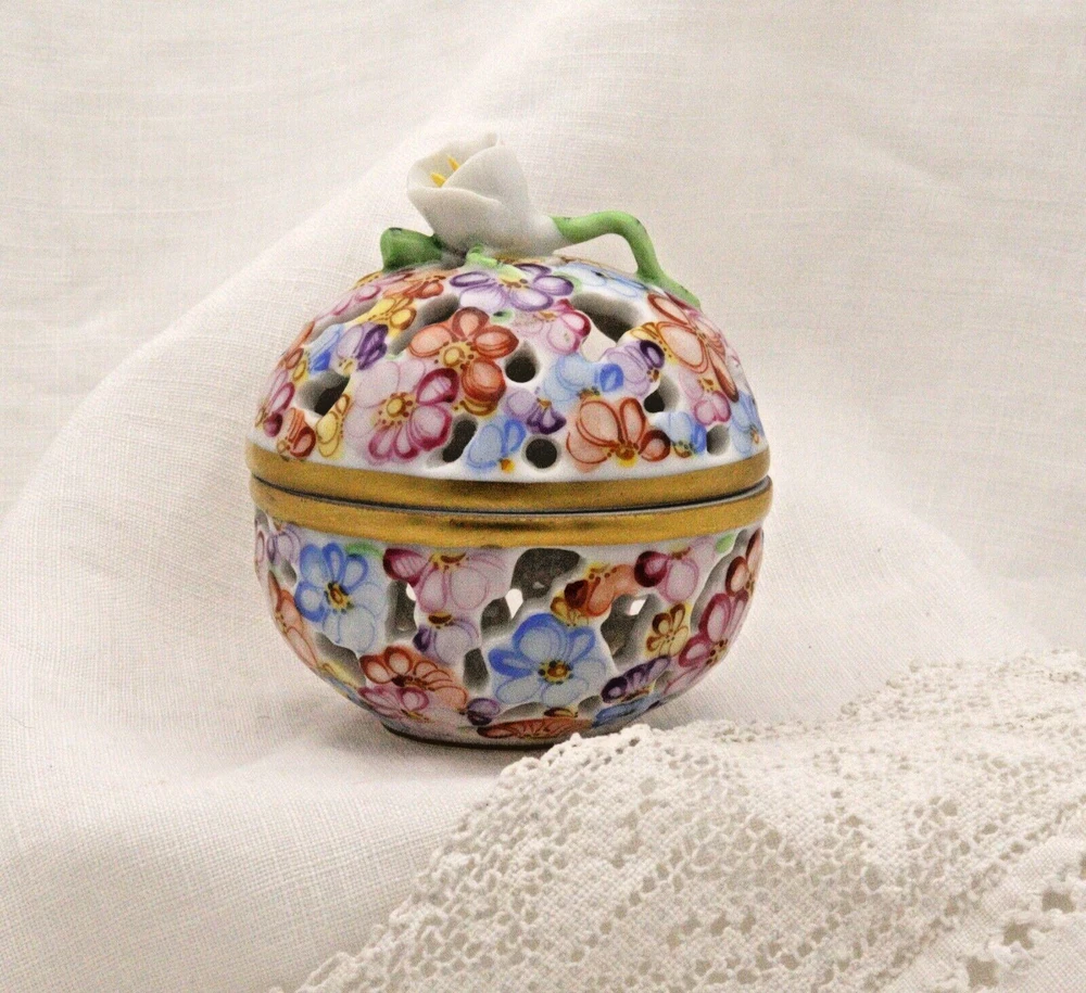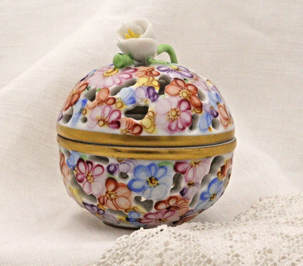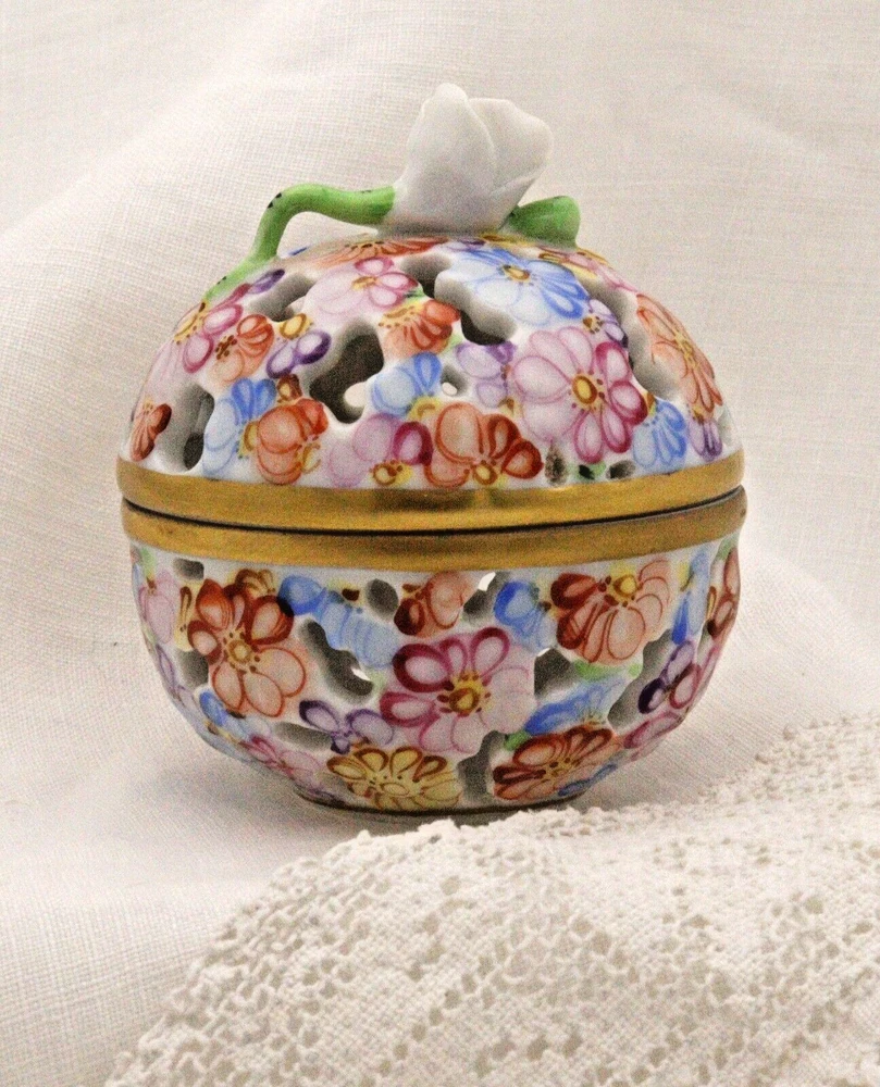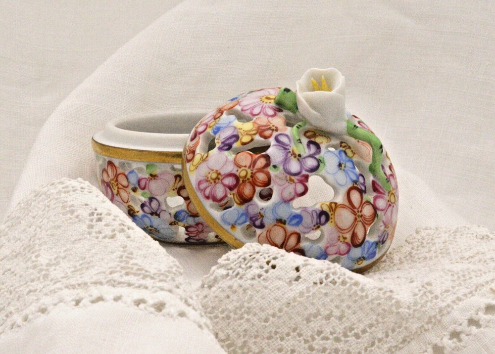 This Herend trinket box is a small round porcelain box featuring a beautiful cut out hand-painted multi-color flower design. The box is adorned with a Lilly finial on the lid, adding a touch of elegance to its Victorian style. Made in Hungary, this collectible piece is part of the Love, Romance collection by Herend and is individually numbered, showcasing its craftsmanship and uniqueness. Perfect for storing small treasures, potpourri, or as a decorative accent, this trinket box combines artistry with functionality in a very charming way. 3" H x 2" W Gorgeous Condition