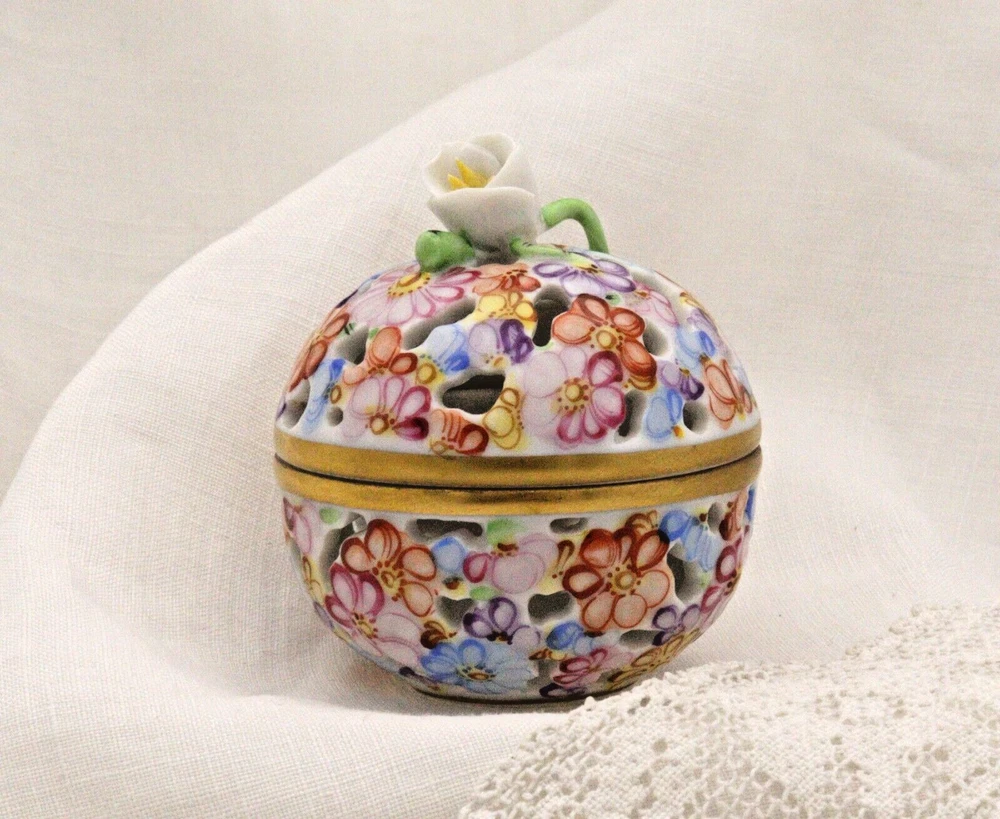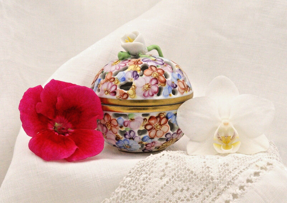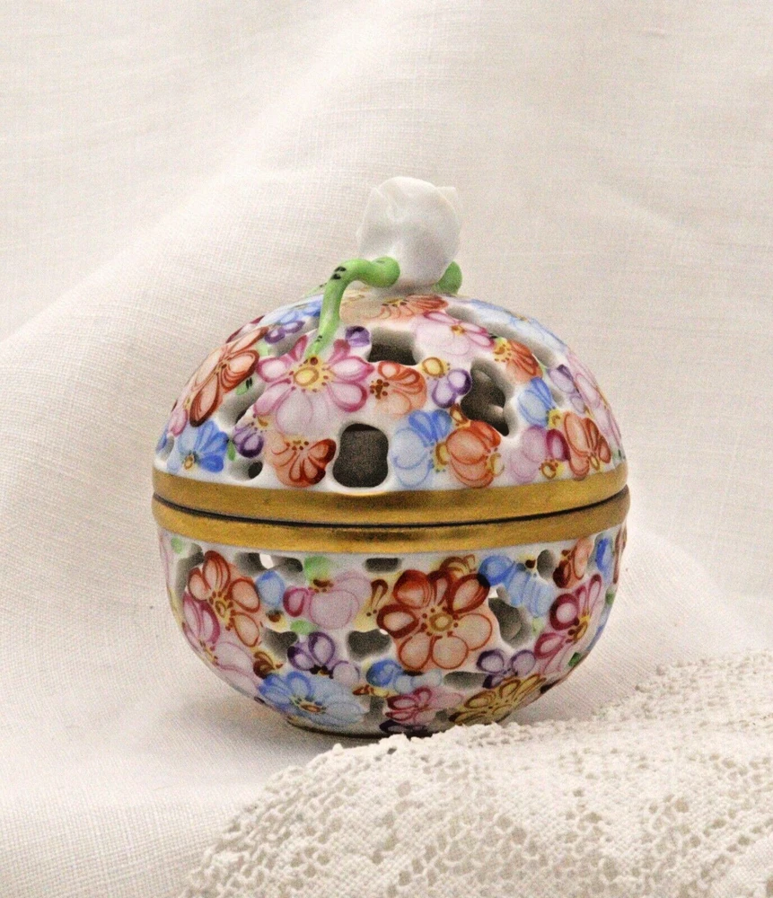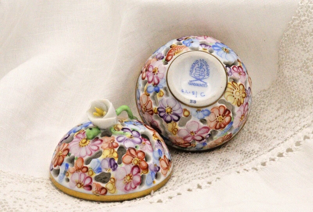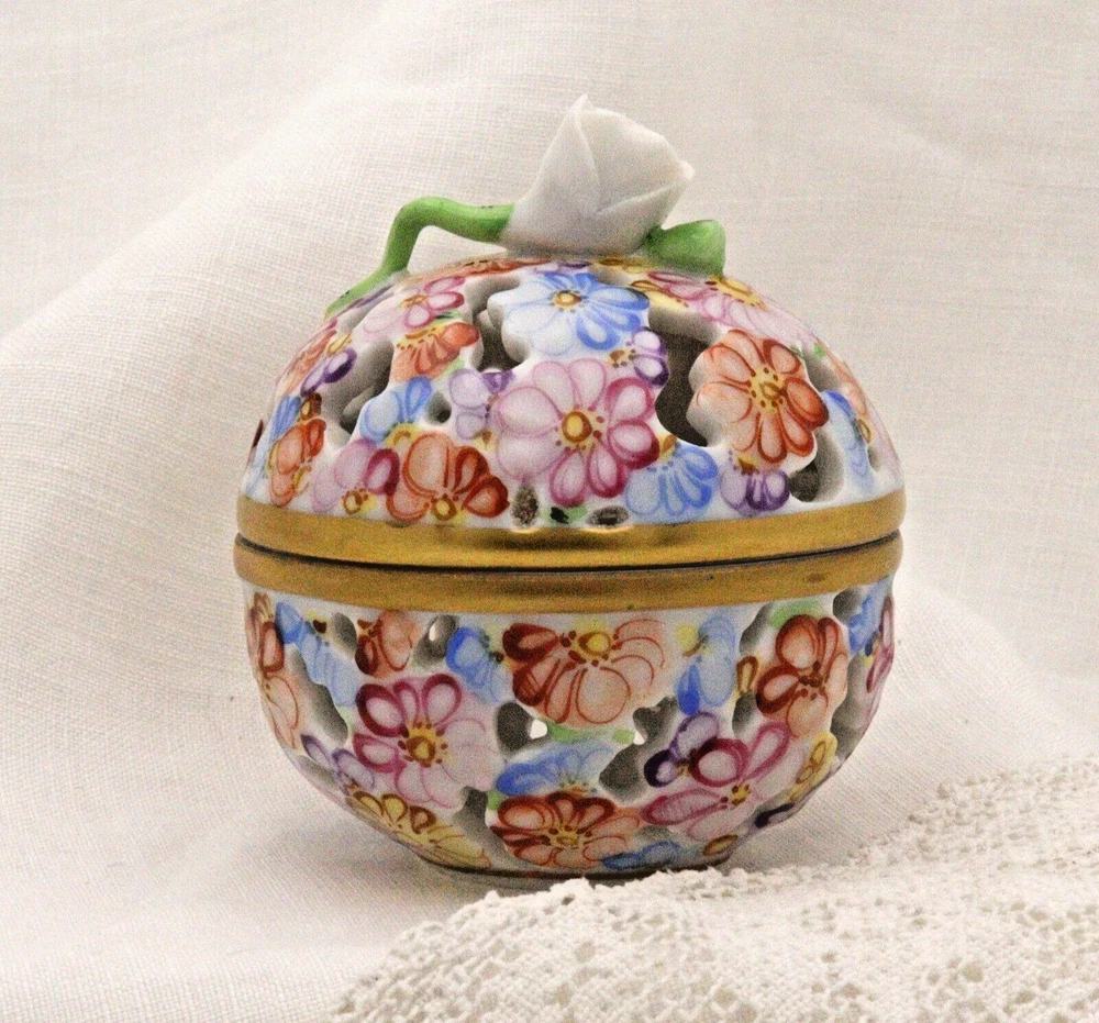This Herend trinket box is a small round porcelain box featuring a beautiful cut out hand-painted multi-color flower design. The box is adorned with a Lilly finial on the lid, adding a touch of elegance to its Victorian style. Made in Hungary, this collectible piece is part of the Love, Romance collection by Herend and is individually numbered, showcasing its craftsmanship and uniqueness. Perfect for storing small treasures, potpourri, or as a decorative accent, this trinket box combines artistry with functionality in a very charming way. 3" H x 2" W Gorgeous Condition