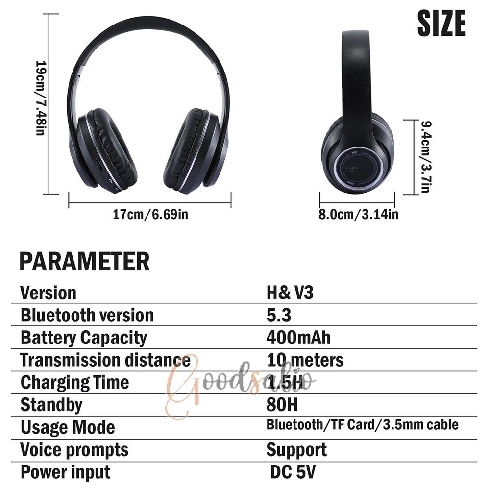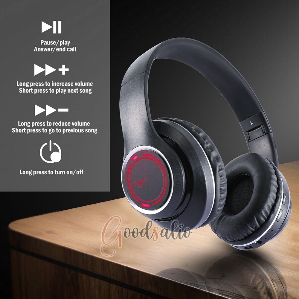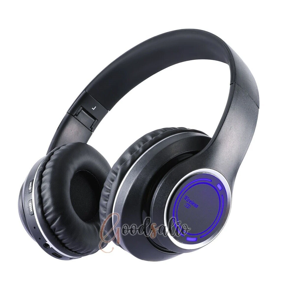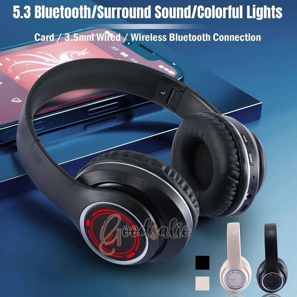 Headband Bluetooth HeadsetWireless Bluetooth Headset Over-Ear Headset Luminous ★SPECIAL TIPS: √ Ship within 24 hours Via USPS from NJ ,USA √ 100% New & Excellent Quality √ Professional Customer Service √ Strictly QC, Each set was fully tested before shipping √ Offer delivery with Tracking Number Product Features 1.Foldable Design: Headband Bluetooth Headset with foldable design, easier to put into a pocket, bag or other small storage space, can greatly reduce the occupied space. 2.Bluetooth 5.3 chip: The Over Ear Headset adopts Bluetooth 5.3 chip, faster and more stable connection, listening to songs and playing games more clearly. 3.Comfortable to The Ear: The Bluetooth Headset is made of soft protein leather, breathable and comfortable, even if you wear them for a long time, you won't feel booming head or discomfort. 4.High-Quality Sound Quality: Wireless Headset using acoustic cavity + digital enhancement technology, presenting surging three-dimensional sound, as in the concert scene. 5.Equipped with 3.5mm Audio Cable: When the Over Ear Wireless Headset is low on power or you want a more stable audio transmission, you can use the 3.5mm audio cable to connect the headset directly to audio devices (such as cell phones, computers, etc.) for wired transmission. Product Parameter Bluetooth Version: V5.3 Transmission Distance: 10 meters Battery Capacity: 400 mAh Charging Time: about 1.5 hours Standby Time: 80 hours Mode of Use: bluetooth/card/wire insertion Power Input: DC 5V Color: black Material: ABS Size: 18.5x18.5cm/7.28x7.28in Products Include 1x Earphone 1xUSB cable 1xAudio Cable