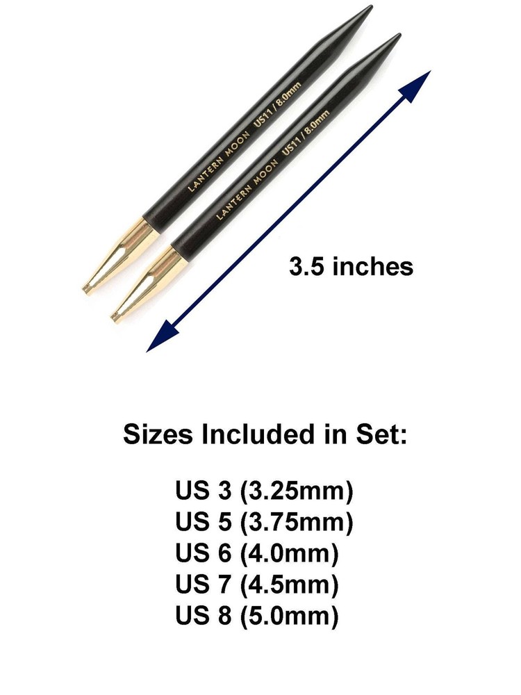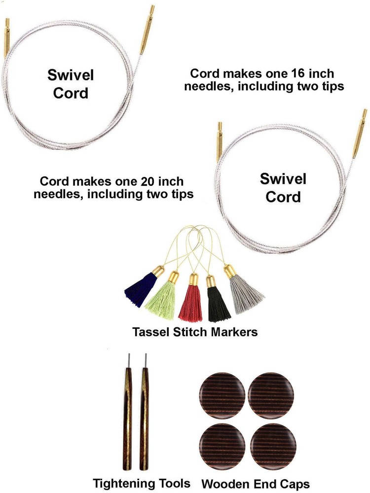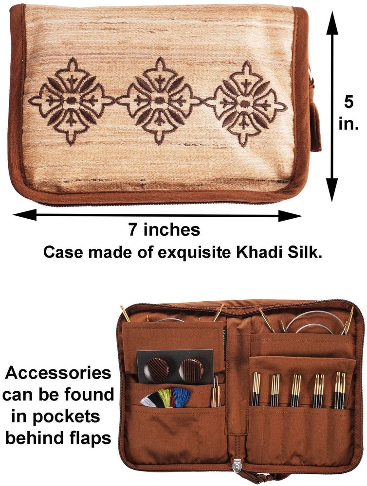 Includes 1 Heritage 4-Inch 5-Pair Interchangeable Circular Knitting Needle Set Handcrafted Ebony Sizes US 3, 5, 6, 7, 8, Silk Case, 2 Cords, 4 End Caps, 5 Markers and 1 Craft Project Bag. The highlight of the range is the elegant Ebony wood and the 24K gold finishing used in handcrafting all knitting needles and crochet hooks. Ebony is harvested in a careful and sustainable manner and is renowned for its smoothness, resilience and strength. It also one of the most expensive woods in the world. The richly colored cases are made of the exquisite Khadi natural silk, also used in elegant fashion apparel in India. The exterior motif is embroidered while inside the case you will find plenty of room for additional accessories. Craft Project Bag measures 13 x 16 inches, Includes a drawstring for easy closure and shoulder straps for easy carry-on and keeping projects on-the-go. Includes 1 Heritage 4-Inch 5-Pair Interchangeable Circular Knitting Needle Set Handcrafted Ebony Sizes US 3, 5, 6, 7, 8, Silk Case, 2 Cords, 4 End Caps, 5 Markers and 1 Craft Project Bag The highlight of the range is the elegant Ebony wood and the 24K gold finishing used in handcrafting all knitting needles and crochet hooks. Ebony is harvested in a careful and sustainable manner and is renowned for its smoothness, resilience and strength. It also one of the most expensive woods in the world. The richly colored cases are made of the exquisite Khadi natural silk, also used in elegant fashion apparel in India. The exterior motif is embroidered while inside the case you will find plenty of room for additional accessories. Craft Project Bag measures 13 x 16 inches, includes a drawstring for easy closure and shoulder straps for easy carry-on and keeping projects on-the-go.