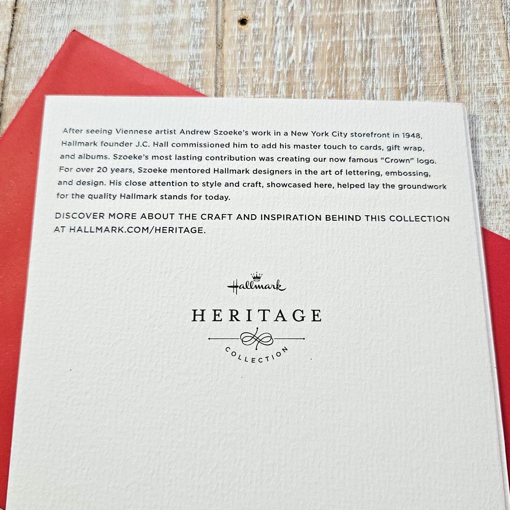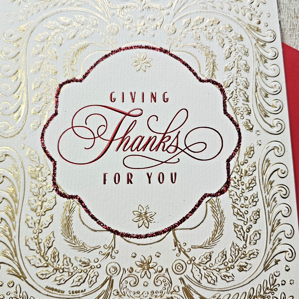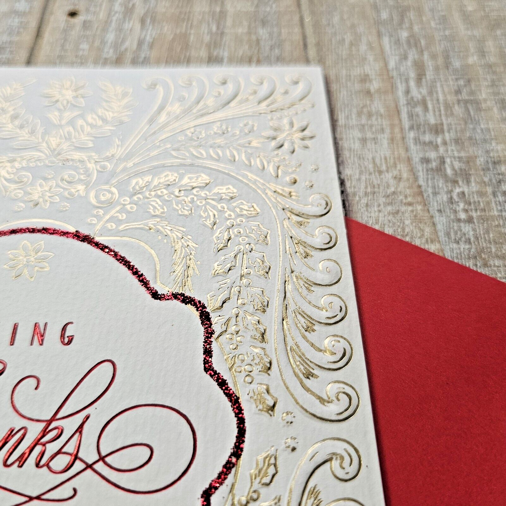 Hallmark Heritage Christmas Greeting Card White Gold Embossed Red Giving Thanks Full Size 5.5 x 8 inch card This listing is for a single card and matching envelope in new condition. Click here to add a personalized label to the inside of your card. Search thousands of cards for all occasions in our eBay Store . Our cards ship with limited tracking via USPS First Class. Standard delivery time is 5-7 days but may take up to 10 days.