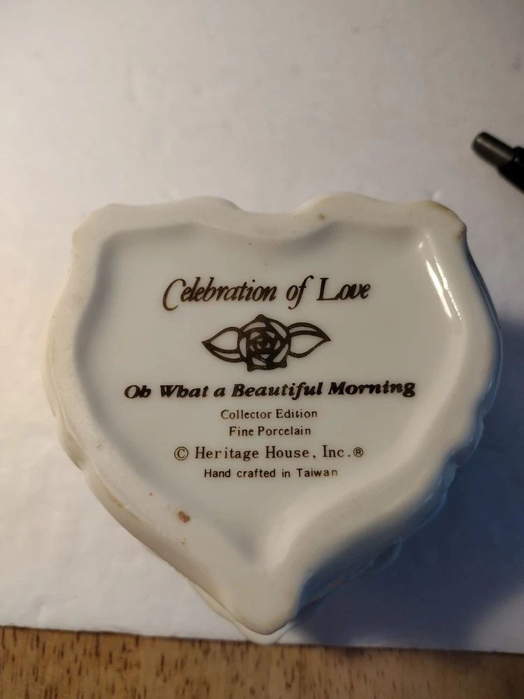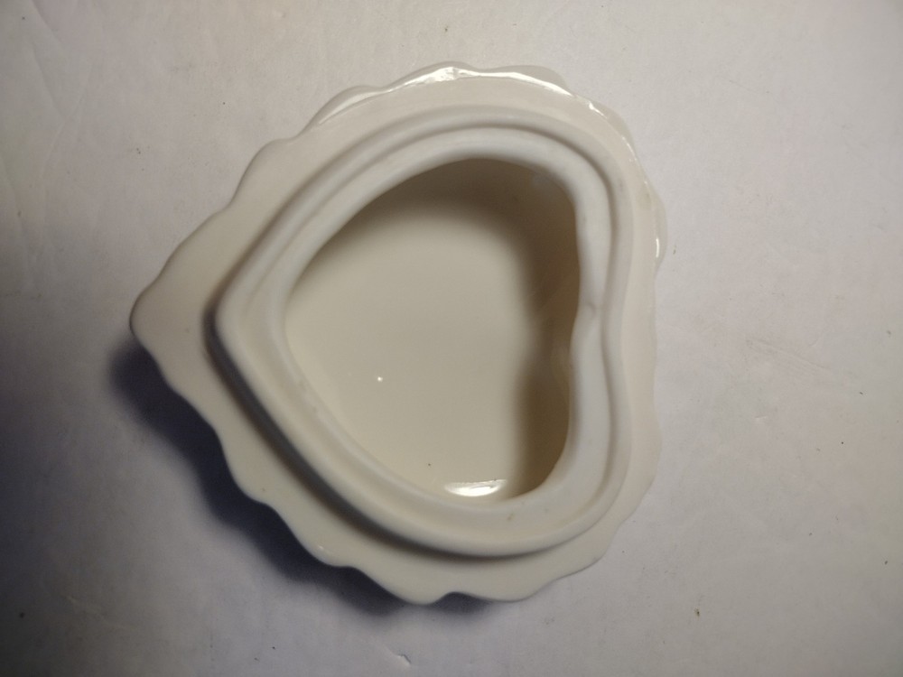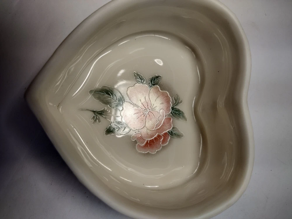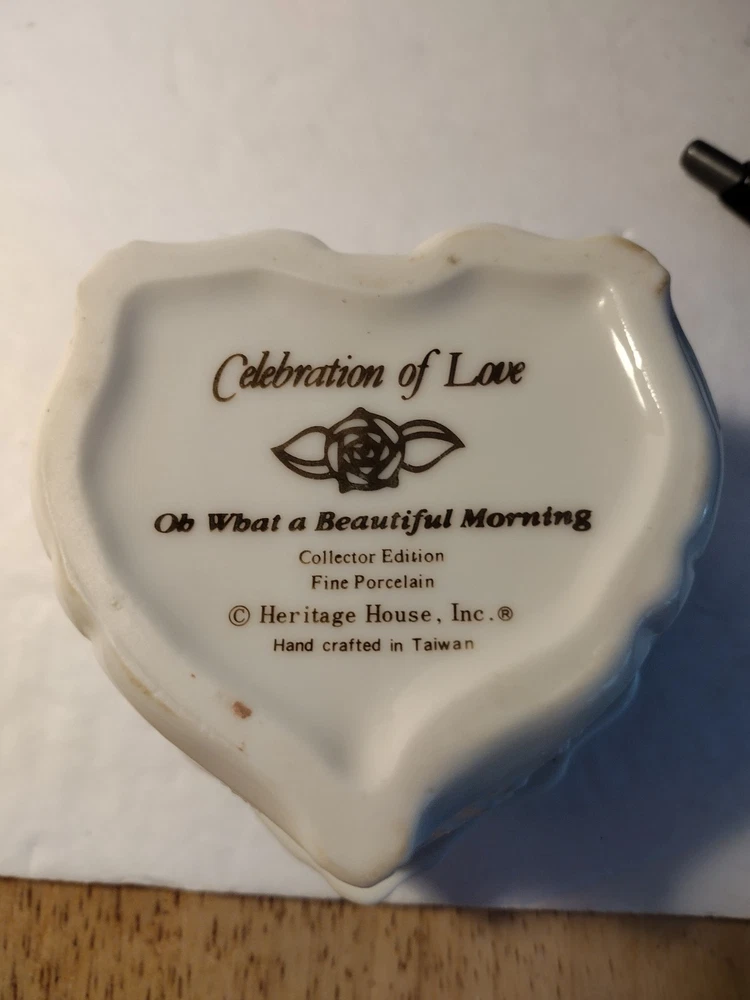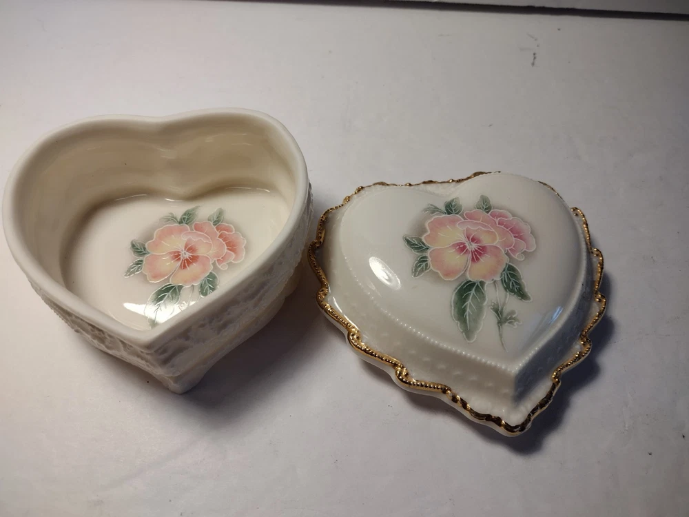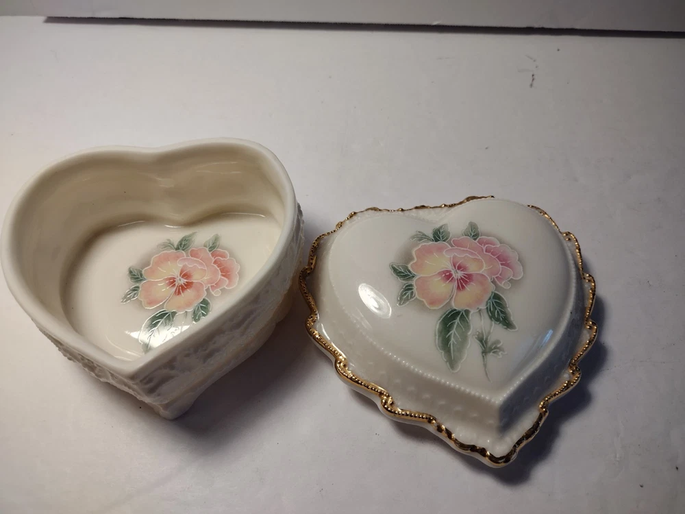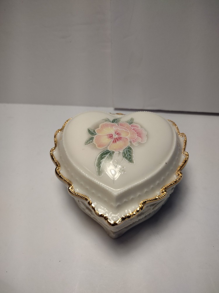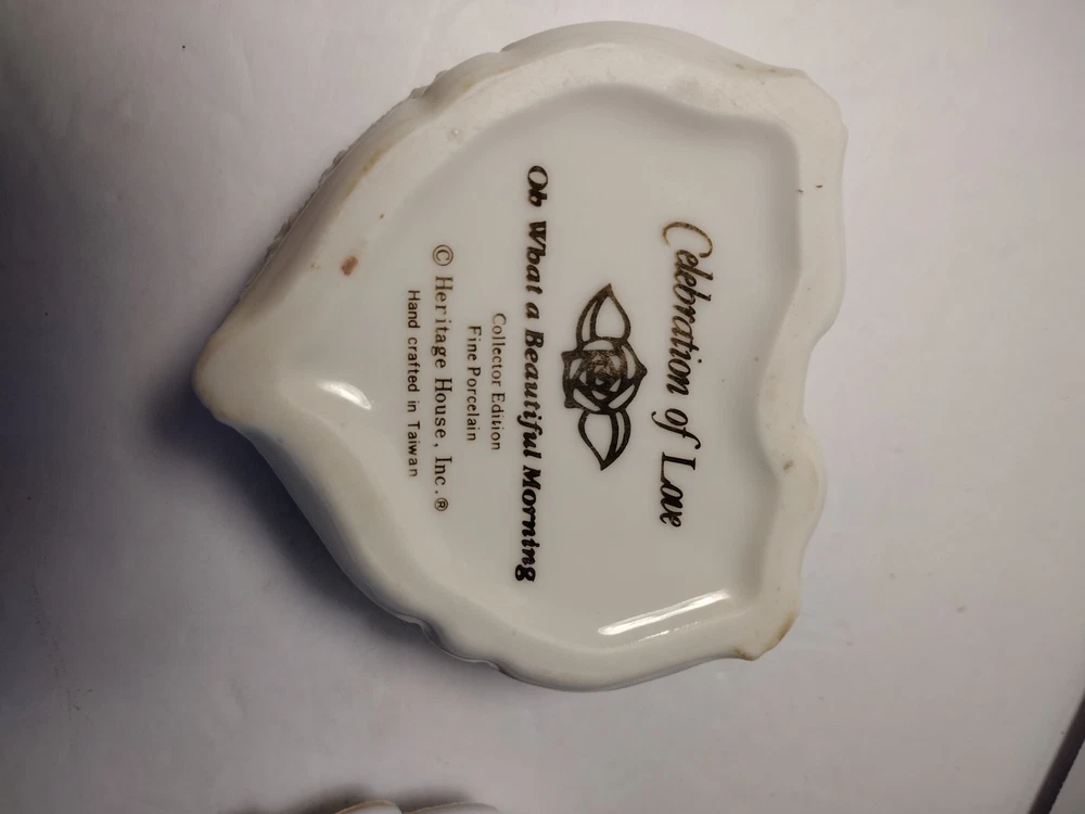 This Heritage House jewelry or ring dish is made of fine porcelain, measuring 3.5 inches in length and featuring a lid. Ideal for storing small items like jewelry or rings, this beautiful piece adds a touch of elegance to any space..