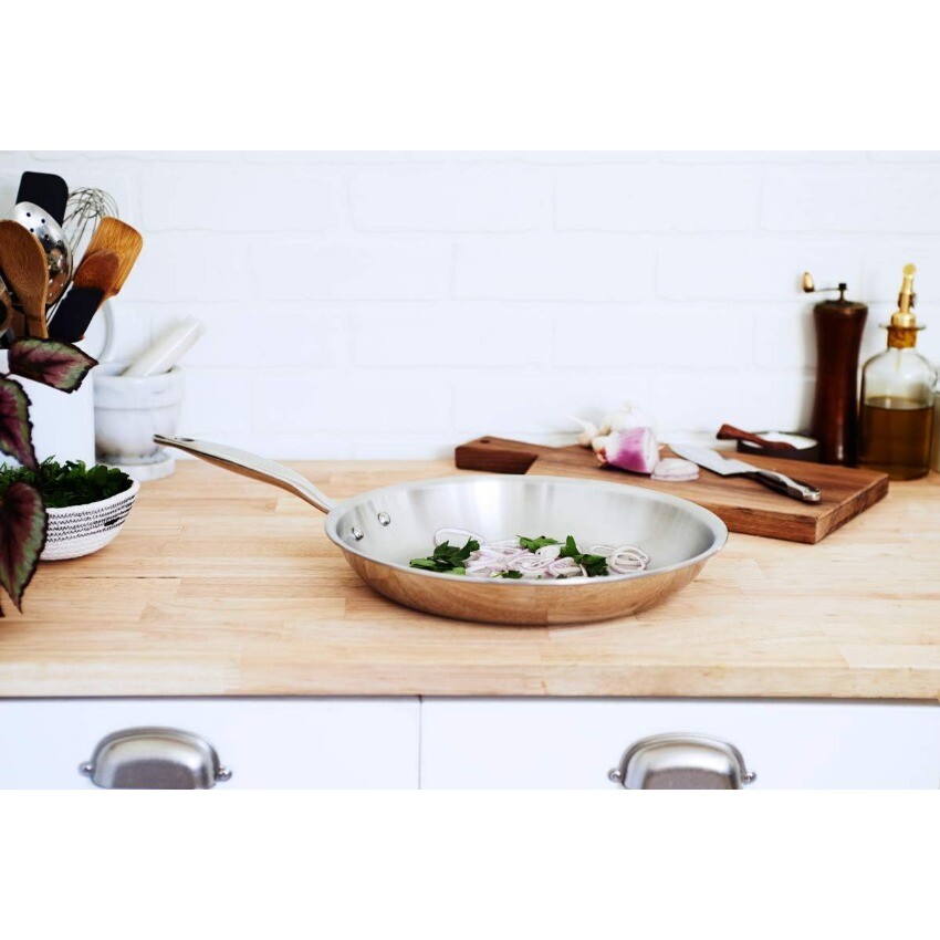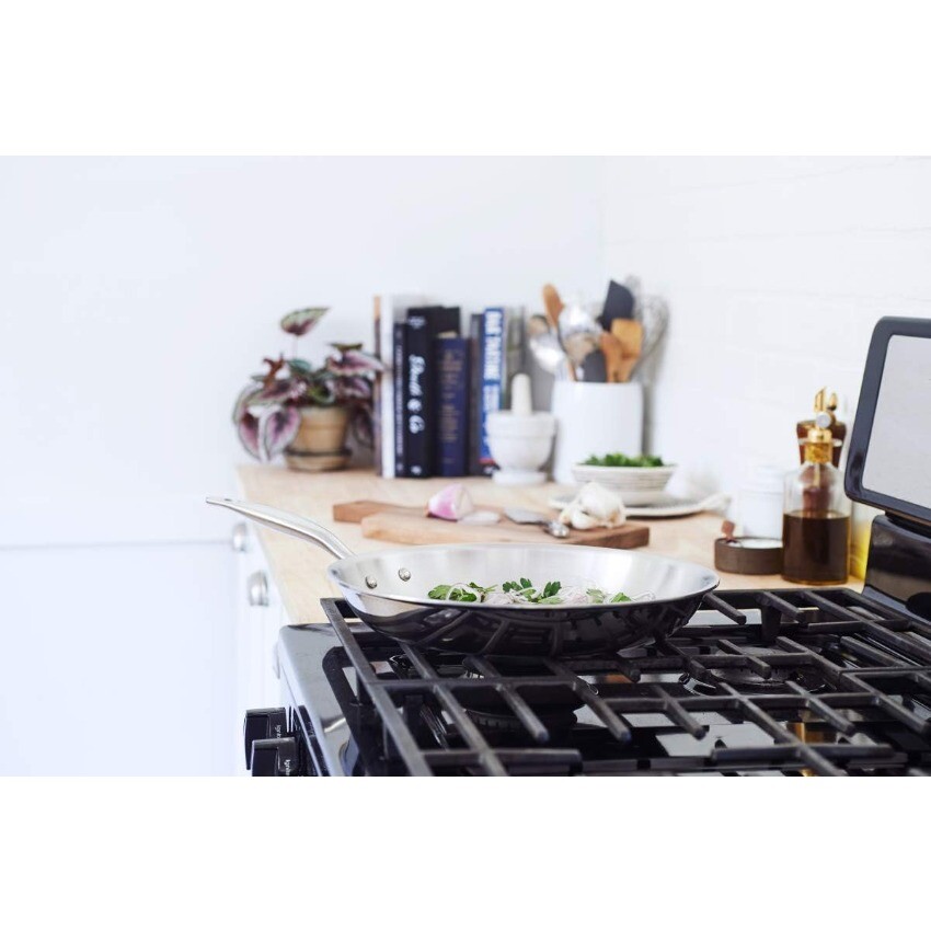 Package: 1X Heritage Steel 12 Inch Fry Pan | Made In USA | Titanium Series | 316Ti Skillet with Stay Cool Handle | Fully Clad Stainless Steel Pan with 5-Ply Construction | Induction Ready & Non Toxic Description: PROFESSIONAL PERFORMANCE: Built from thick 5 ply cladded stainless steel, our fry pans are built to heat up evenly and retain heat well. Fully cladded on both the base and sides, the entire pan performs predictably and reliably for all your cooking needs. AMERICAN MADE, LIFETIME WARRANTY: We’re a family-owned craft manufacturer obsessed with building great stainless clad cookware. It’s the only thing we’ve been making for over 40 years, so we’ve gotten pretty good at it. Our cookware is fully made in the USA with global materials and is backed by a lifetime warranty. EVEN COOKING AND EASY CLEANING: Our 5 ply fully clad construction includes three layers of aluminum that are sandwiched between protective layers of stainless steel, resulting in cookware that combines even heating with incredible durability. Use it on any stovetop (including induction), in the oven up to 800 degrees and it’s broiler safe. The handles are built to stay cool on the stovetop and rounded pan lips enable drip-free pouring NON-TOXIC WITH NO CHEMICAL COATINGS: We don’t use any type of chemical coatings on our cookware. It is made without any type of PFAS (PFOA, PTFE aka Teflon, PFOS, or other), ceramic sol-gel, nanoparticles, lead, cadmium, or any other chemically applied coating. You deserve the very best in your cooking surface, so we rely only on high quality clad stainless steel. No funny business or gimmicks, just tried and tested heritage materials. TITANIUM SERIES: This pan features a specialty 316Ti stainless steel cooking surface. The alloy is strengthened with molybdenum and titanium to better protect against salt pitting and metal leaching.