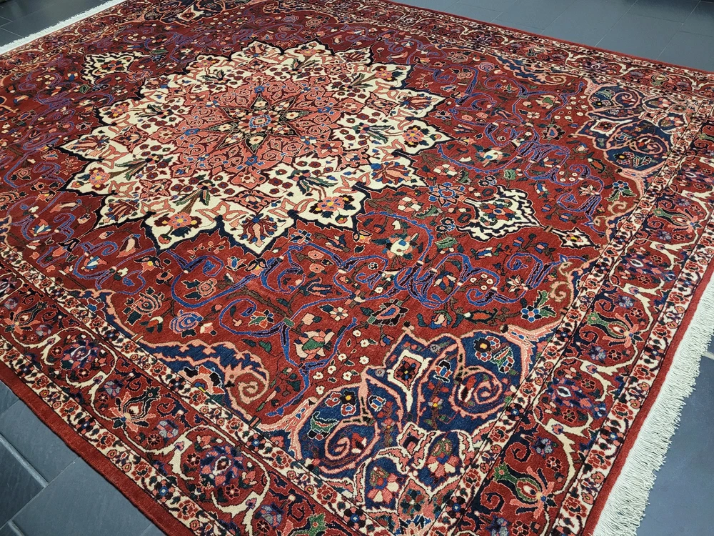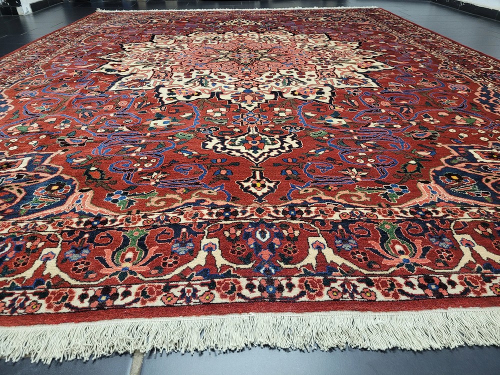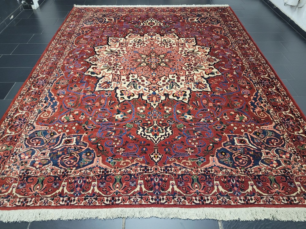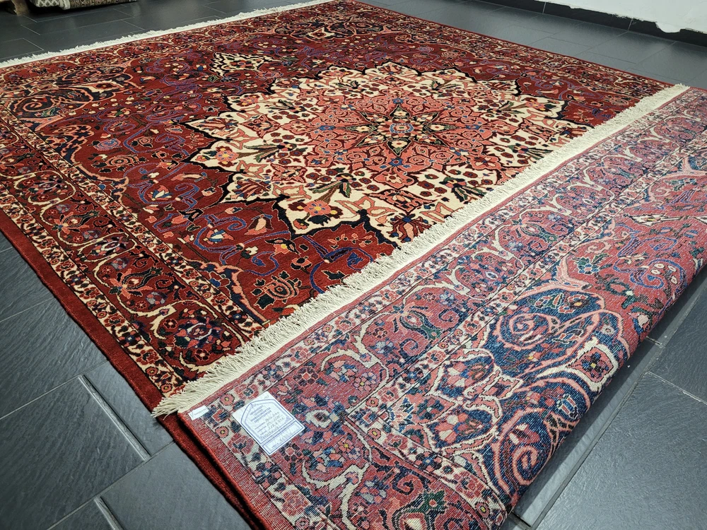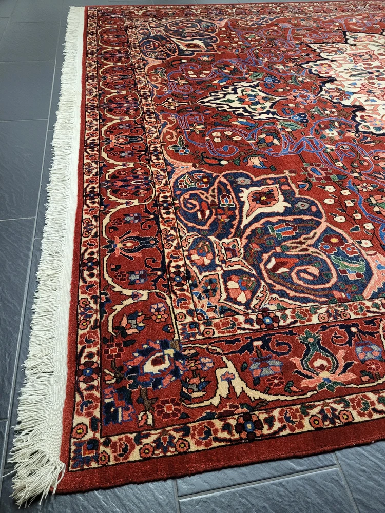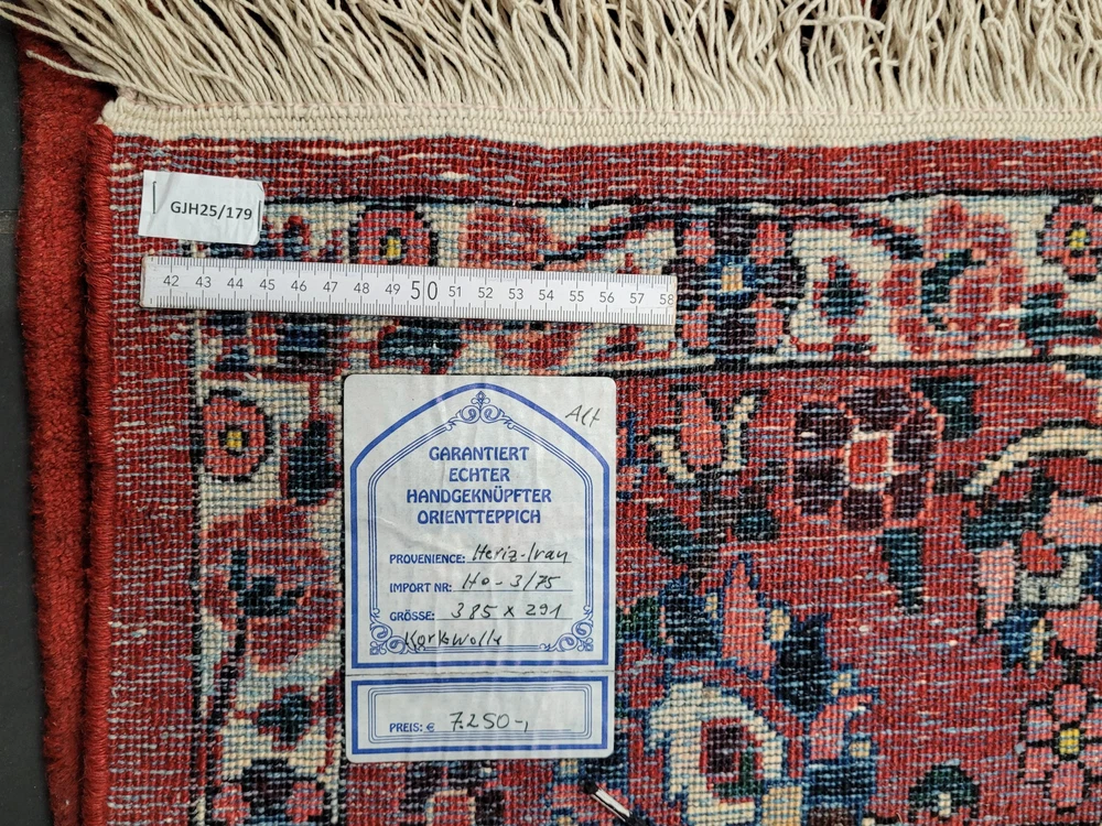Herzlich willkommen, angeboten wird ein eindrucksvoller Heriz Teppich aus feiner Korkwolle, handgeknüpft und von stattlicher Größe. Dieses Stück besticht durch sein großflächiges, sternförmiges Medaillon in der Mitte, das sich kontrastreich vom roten Fond abhebt. Umgeben ist das Medaillon von kraftvollen floralen Ornamenten, Blütenranken und geometrischen Elementen, die typisch für die Knüpfkunst aus dieser Region sind. Artikelnummer: GJH25/179 Maße: 383 × 291 cm Gewicht: ca. 46 kg Details: Material: Korkwolle, handgeknüpft Knüpfung: robust und dicht, langlebige Verarbeitung Farben: Rot, Elfenbein, Blau, Dunkelblau, Grün und Akzente in Schwarz Design: Großes, sternförmiges Medaillon mit feiner Ornamentik Reich verzierte Felder mit floralem Dekor und geschwungenen Mustern Bordüre mit stilisierten Blüten und geometrischen Elementen Verarbeitung: hochwertige Handarbeit, klar strukturierte Komposition, alt und charaktervoll Zustand: Sehr guter, gepflegter Zustand mit schöner Ausstrahlung. Die Bilder sind Teil der Zustandsbeschreibung. Versand: Wir versenden per GLS, UPS und DHL versichert weltweit.
