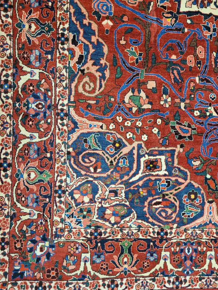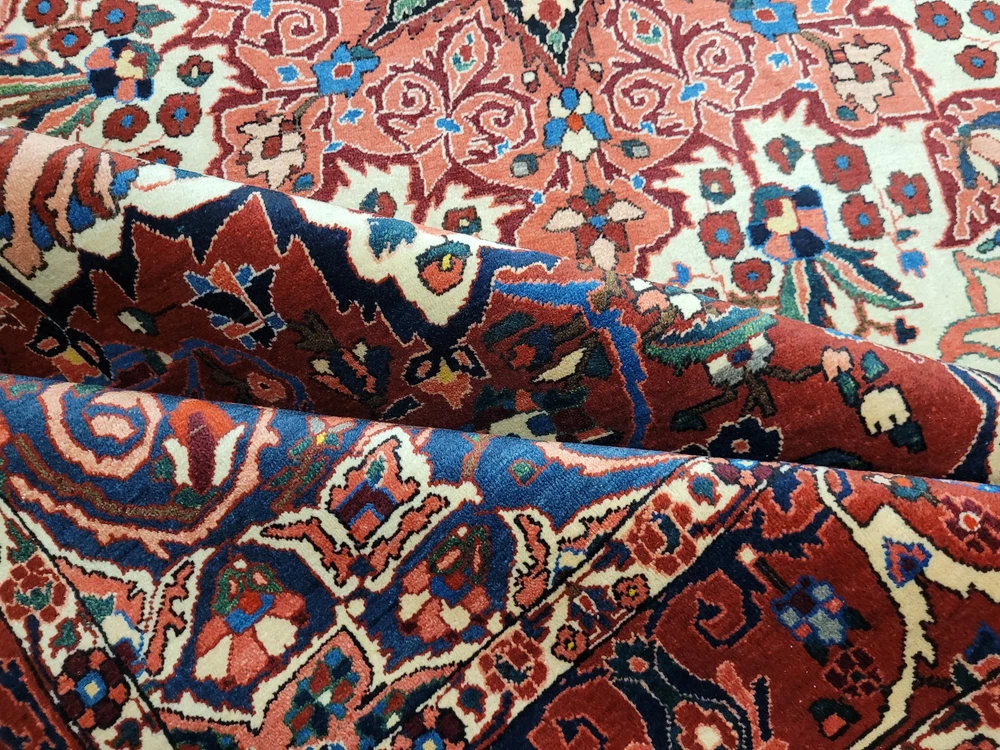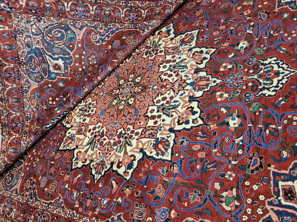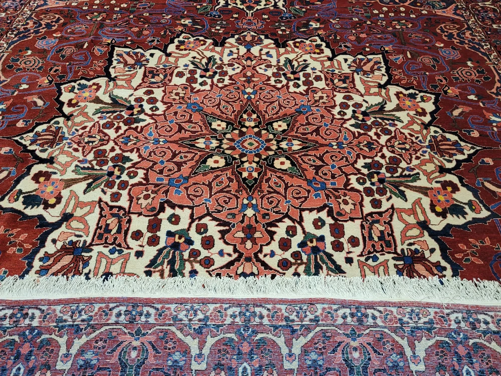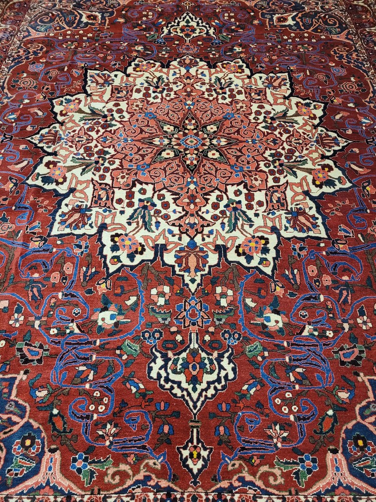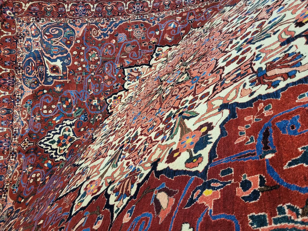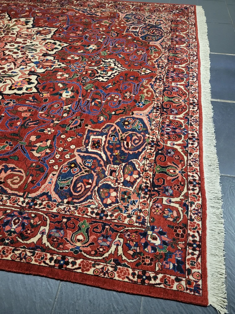 Herzlich willkommen, angeboten wird ein eindrucksvoller Heriz Teppich aus feiner Korkwolle, handgeknüpft und von stattlicher Größe. Dieses Stück besticht durch sein großflächiges, sternförmiges Medaillon in der Mitte, das sich kontrastreich vom roten Fond abhebt. Umgeben ist das Medaillon von kraftvollen floralen Ornamenten, Blütenranken und geometrischen Elementen, die typisch für die Knüpfkunst aus dieser Region sind. Artikelnummer: GJH25/179 Maße: 383 × 291 cm Gewicht: ca. 46 kg Details: Material: Korkwolle, handgeknüpft Knüpfung: robust und dicht, langlebige Verarbeitung Farben: Rot, Elfenbein, Blau, Dunkelblau, Grün und Akzente in Schwarz Design: Großes, sternförmiges Medaillon mit feiner Ornamentik Reich verzierte Felder mit floralem Dekor und geschwungenen Mustern Bordüre mit stilisierten Blüten und geometrischen Elementen Verarbeitung: hochwertige Handarbeit, klar strukturierte Komposition, alt und charaktervoll Zustand: Sehr guter, gepflegter Zustand mit schöner Ausstrahlung. Die Bilder sind Teil der Zustandsbeschreibung. Versand: Wir versenden per GLS, UPS und DHL versichert weltweit.