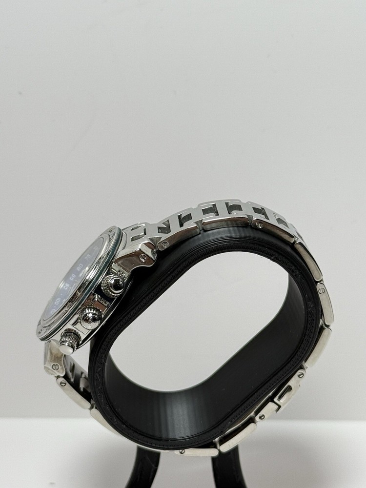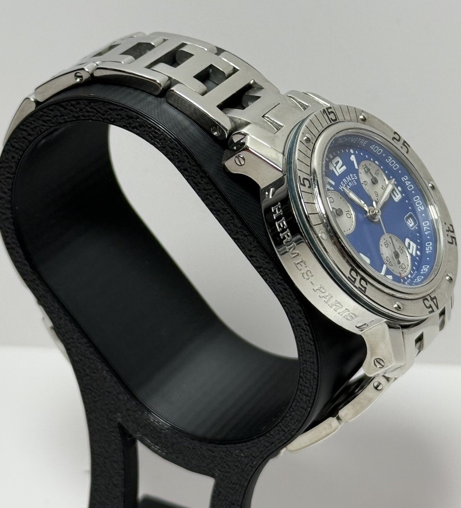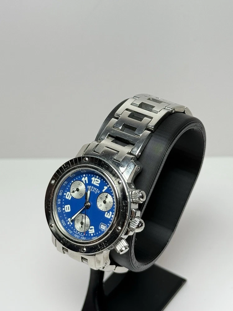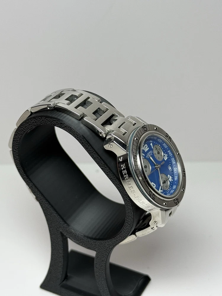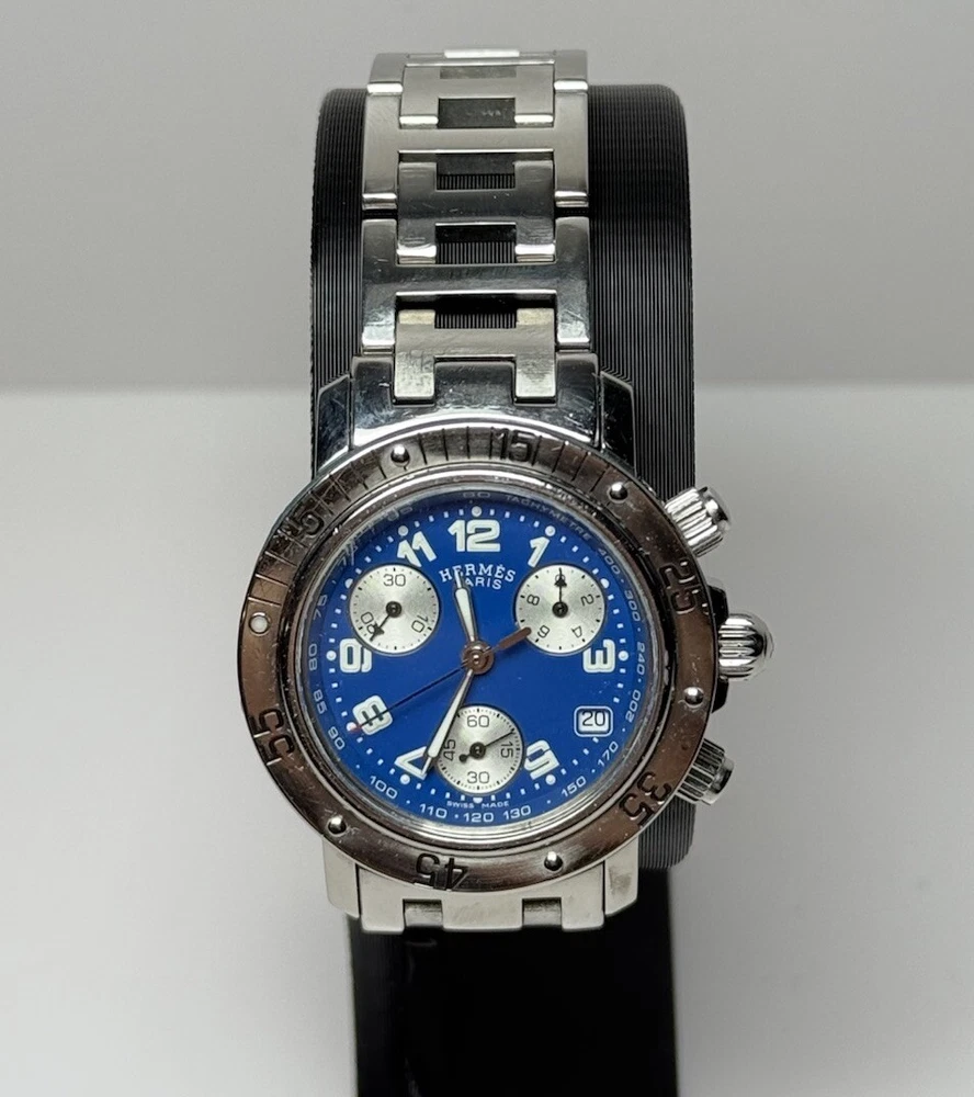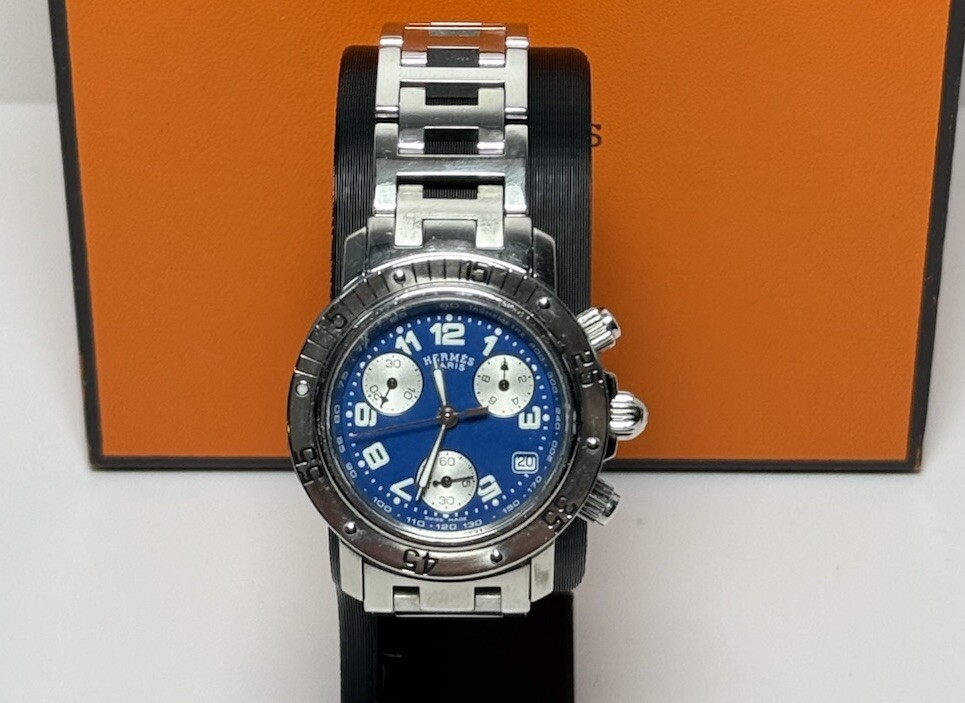 Hermès Clipper Ladies CL2.317 Diver Stainless Good condition, has a few minor scratch marks on the glass near 3 and 10 o'clock and on bezel near #5 (rotating part) Was cleaned and bracelet polished. The robber circle around the bezel is no longer present (cosmetic feature that was removed by original owner). Metal bracelet, fits up to 6.5" wrist circumference. No extra links. Comes with a box as pictured but nothing else. Guaranteed authentic, works well