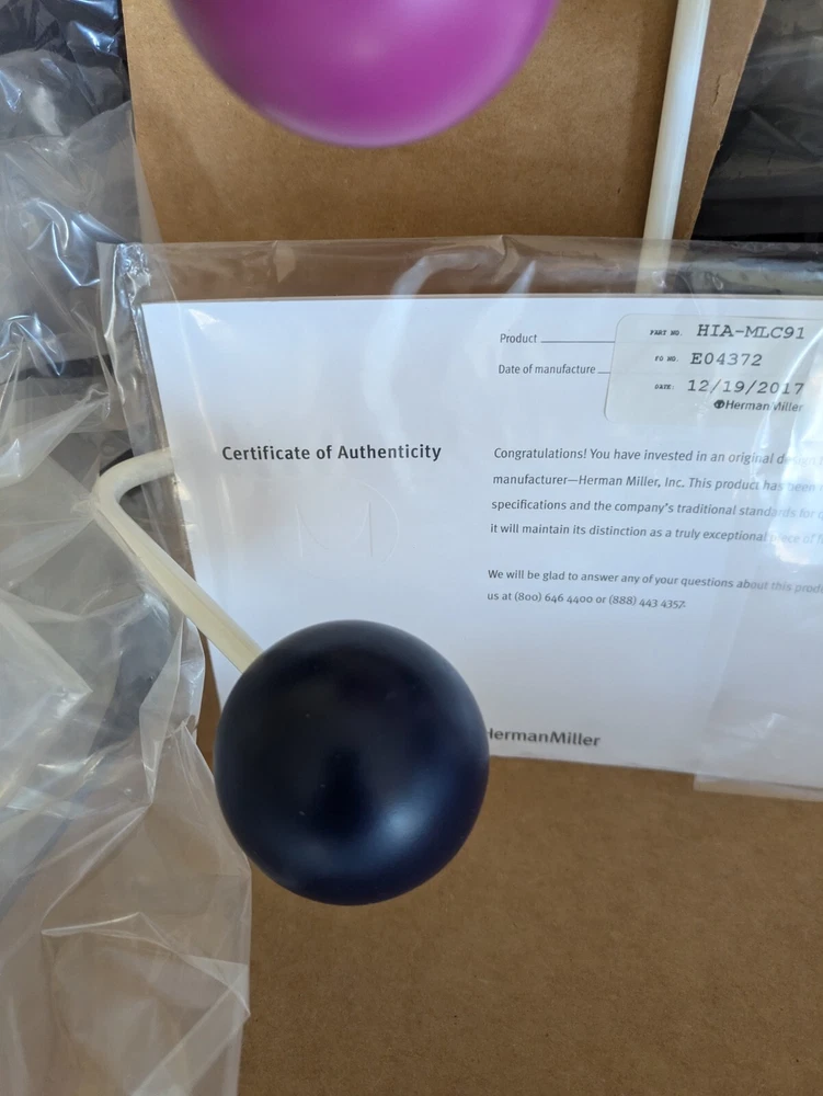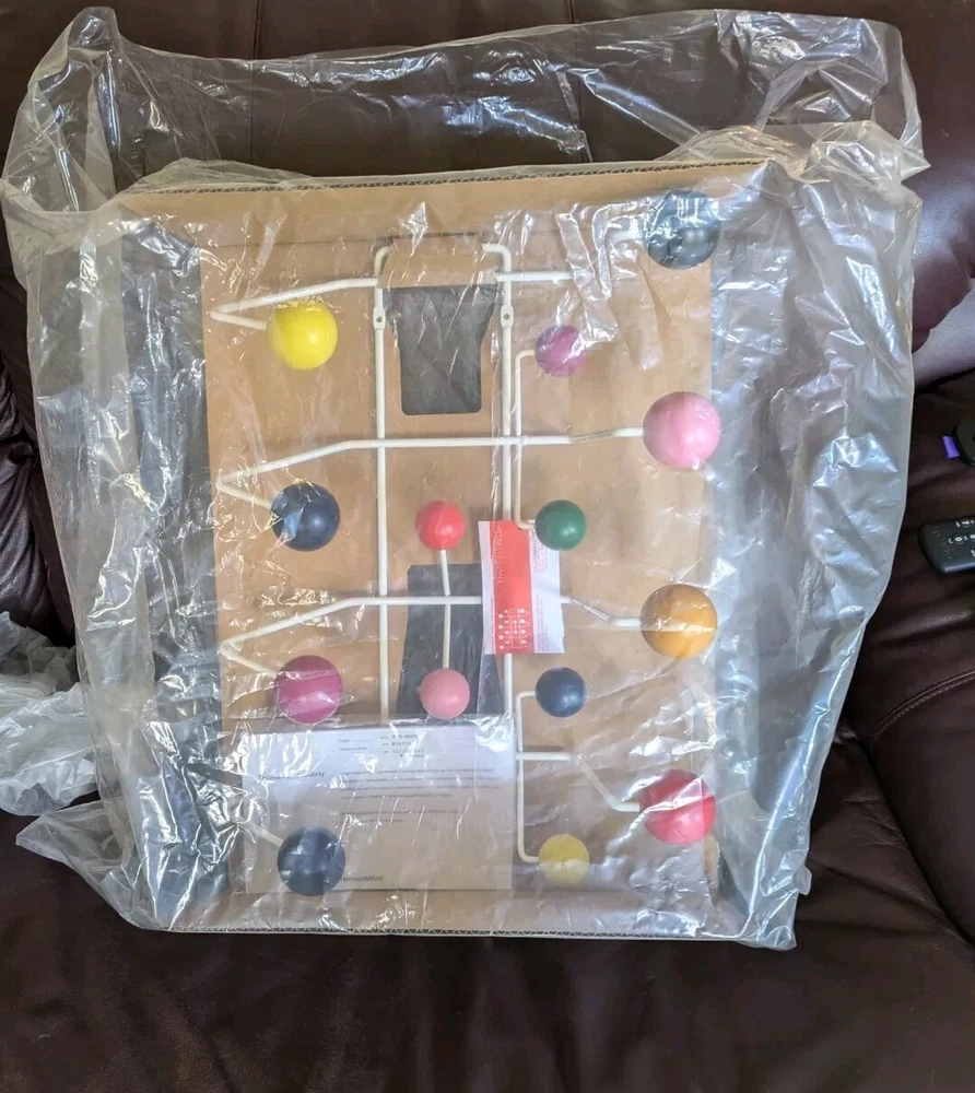 This Herman Miller Charles & Ray Eames Mid Century Modern Hang-It-All Wall Coat Rack is a stylish and functional addition to any home. It features a unique design that is both modern and eclectic, with a mix of wood and metal materials that create a sturdy and durable structure. The coat and hat racks are wall-mounted, making them easy to install and use. The multicolor design adds a pop of color to any room, while the United States manufacturing ensures high-quality construction. This coat and hat rack is perfect for those who want to add a touch of modern style to their home organization. Its sleek design and mix of materials make it a great choice for any home decor. Whether you need a place to hang your coats, hats, or other accessories, this Herman Miller Charles & Ray Eames Mid Century Modern Hang-It-All Wall Coat Rack is the perfect solution. The Eames Hang-It-All, originally released in 1953, exemplifies the Eameses' belief in taking pleasure seriously. Made with a sturdy steel frame and solid wood balls, this colorful coat rack was created using the same technique for simultaneously welding wires that Charles and Ray developed for their low tables and wire chairs. Includes eight large and six small hooks. Steel rod frame with a white powder-coated finish. Open Box