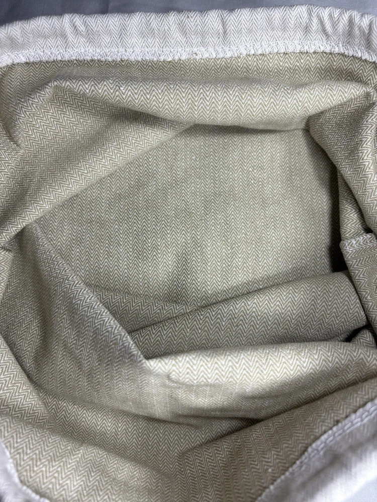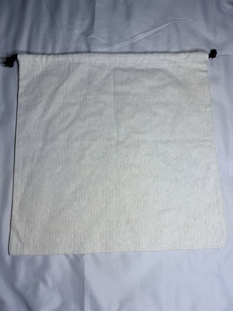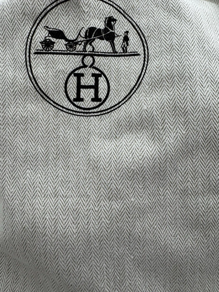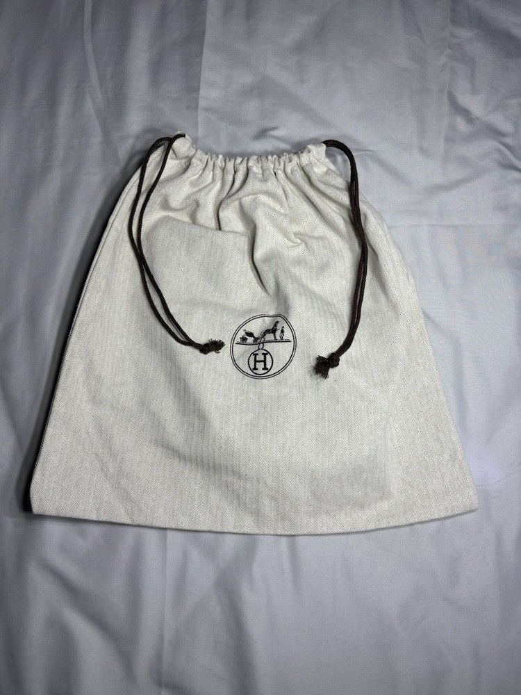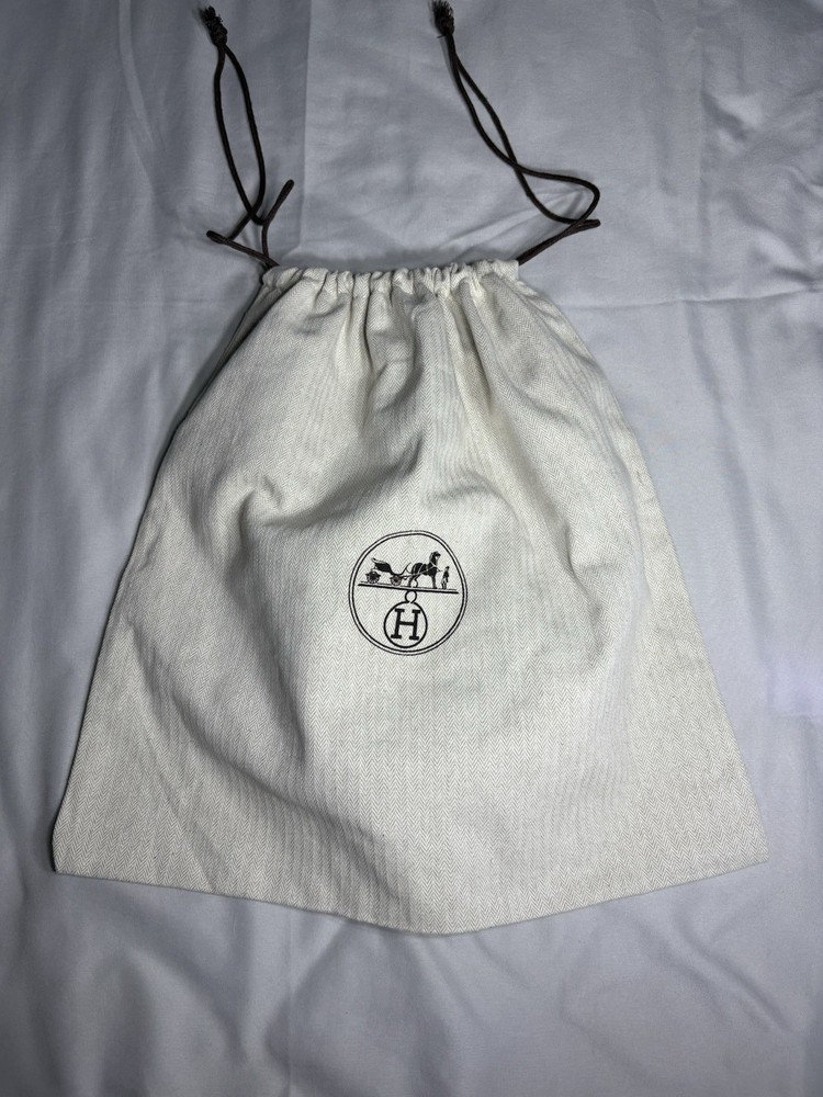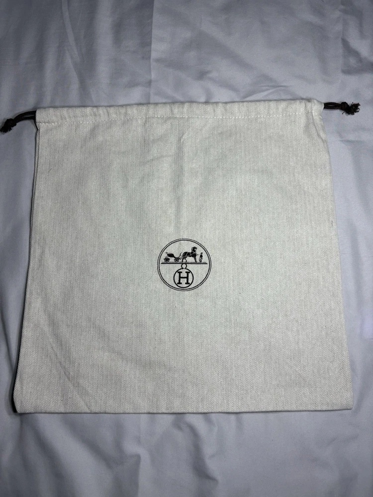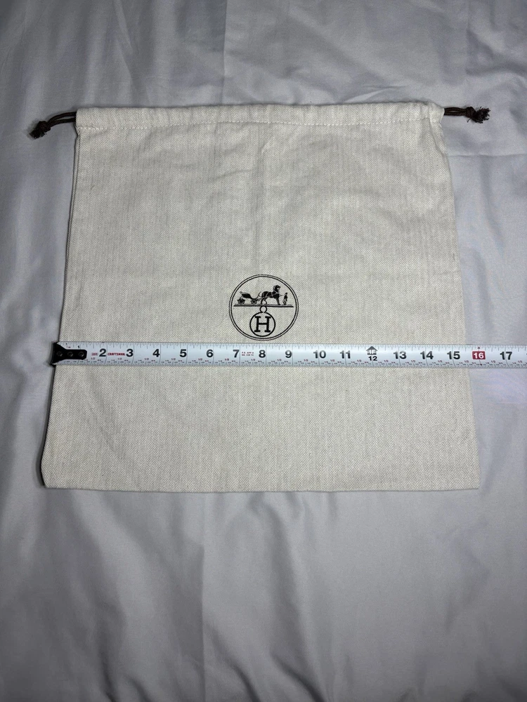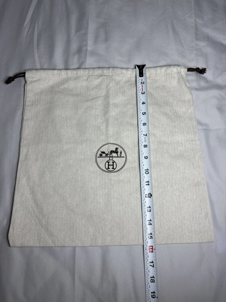 The Hermes Dust Bag Storage Pouch is a stylish and lightweight accessory designed for fashion-forward women. Made from canvas with a herringbone pattern, this beige pouch features the iconic Hermes logo as accents. This designer dustbag is perfect for storing small items or serving as a chic fashion statement. With its breathable material and compact size of 15x15, this pouch is a practical and fashionable addition to any wardrobe.