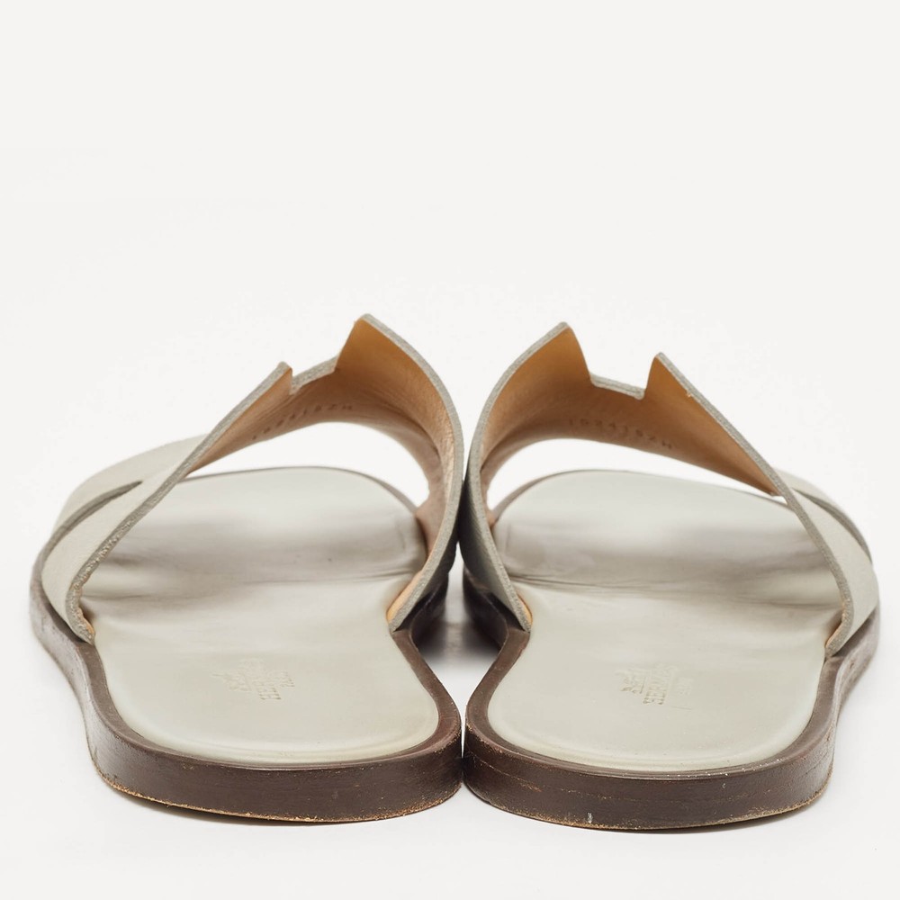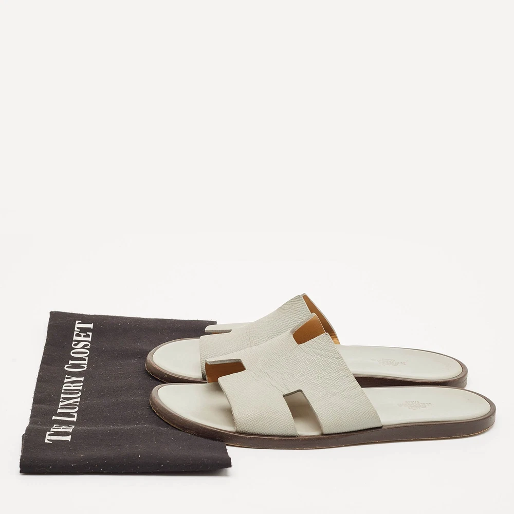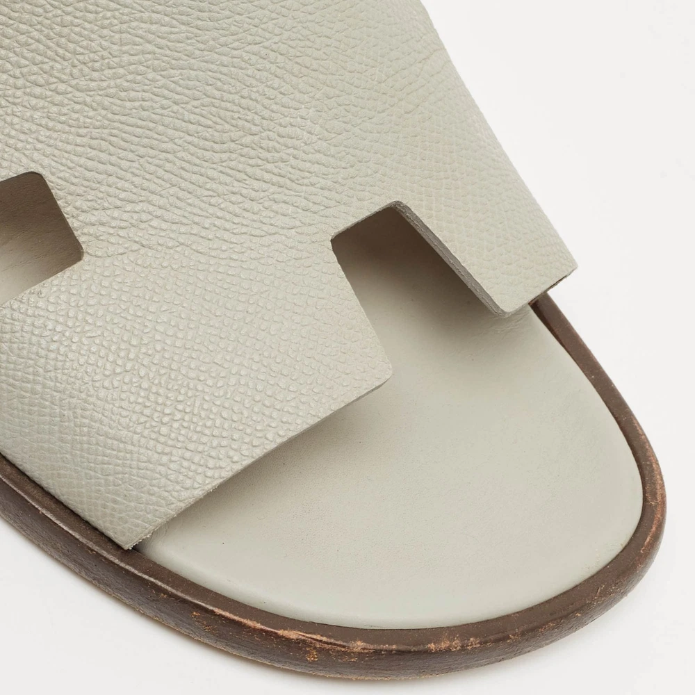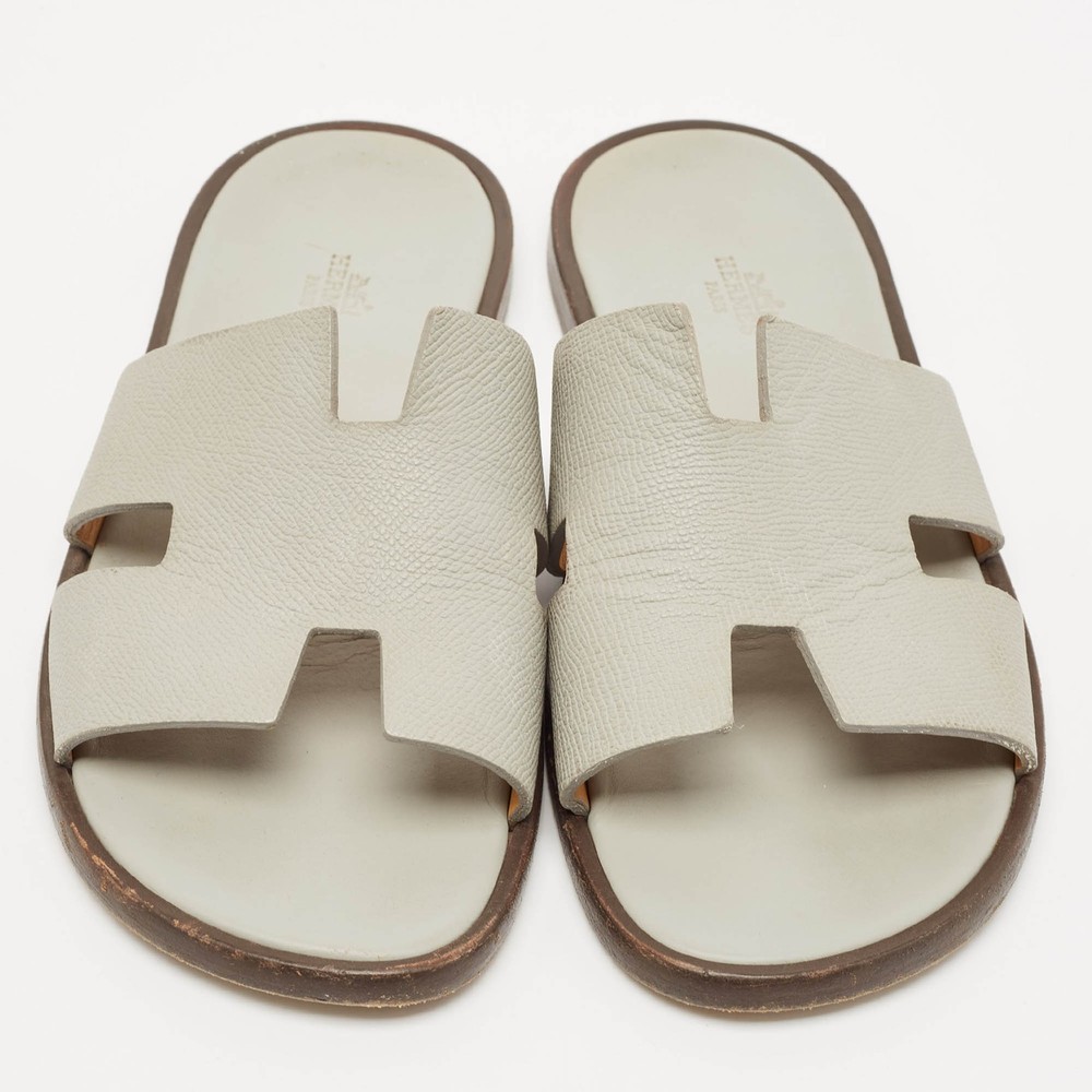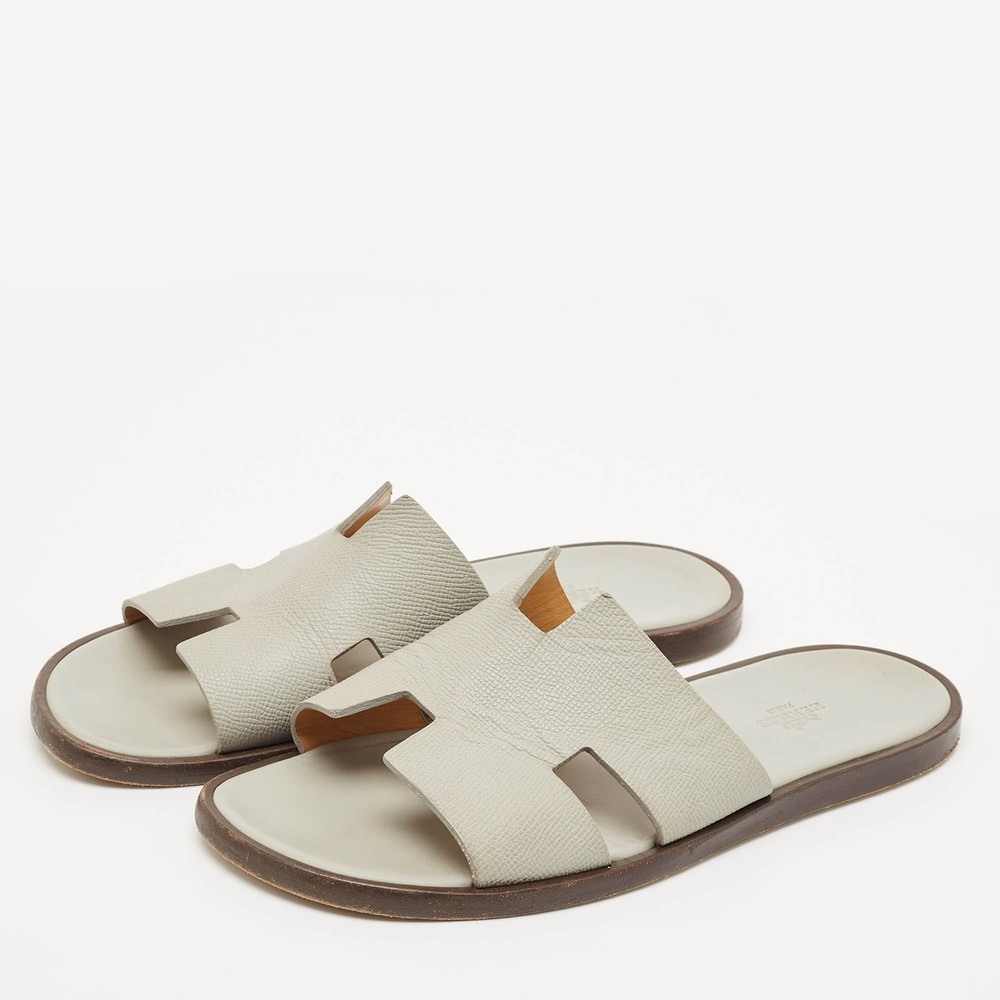Hermes is a brand that epitomizes art and all their designs have a luxurious blend of comfort and style. These grey Izmir slides have been crafted from leather in Italy and feature the iconic H on the vamp, making it easy to slip them on over all your casual outfits.Certified by The Luxury Closet - This item has gone through a detailed authentication process overseen by our experts. We offer a lifetime guarantee of authenticity on all our items. Import duties, taxes and charges are not included in the item price. These charges are the buyers responsibility. Please check with your country’s customs office to determine what these additional cost will be prior to buying. Our eBay Store About Us Contact Us Add to Favorite Sellers Hermes Grey Leather Izmir Flat Slides Size 41 $414.7 Hermes is a brand that epitomizes art and all their designs have a luxurious blend of comfort and style. These grey Izmir slides have been crafted from leather in Italy and feature the iconic H on the vamp, making it easy to slip them on over all your casual outfits. Product Details Brand Color Grey Dimensions Material Leather Size 41 Outsole Width Outsole Length Heel Height Includes Certified by The Luxury Closet This item has gone through a detailed authentication process overseen by our experts. We offer a lifetime guarantee of authenticity on all our items. How We Check The in-house team of experts at The Luxury Closet is highly trained to verify the authenticity and the condition of the luxury products. They ensure that only 100% authentic items are put on sale.The evaluation process is unique with its own mix of assessment criteria and differs according to the category. Each item is evaluated based on the following combination of hallmarks, hardware, stitching, symmetry, material, craftsmanship, stamping, codes, hologram stickers, and packaging. Our authenticators also check if the items have been modified or amended (e.g., aftermarket diamonds, replaced batteries, repaired bags, etc.) International Buyers Import duties, taxes and charges are not included in the item price. These charges are the buyers responsibility. Please check with your country’s customs office to determine what these additional cost will be prior to buying.