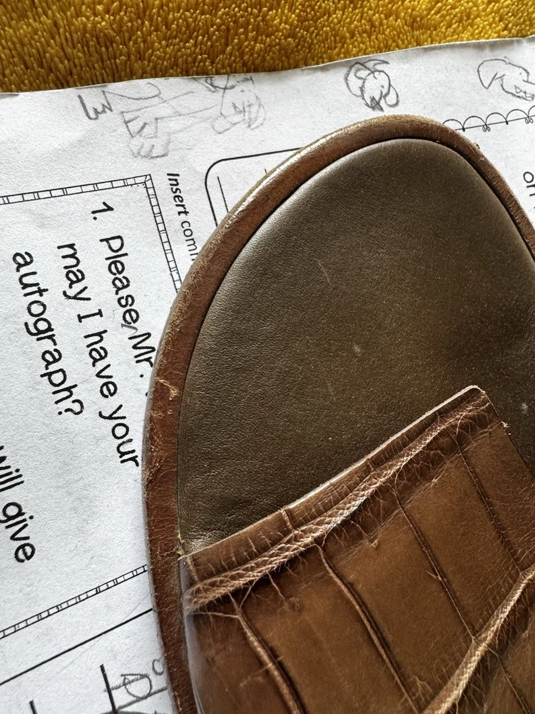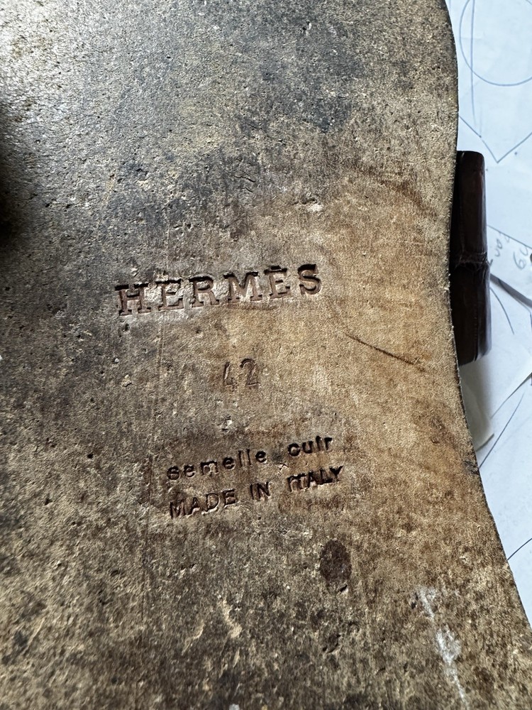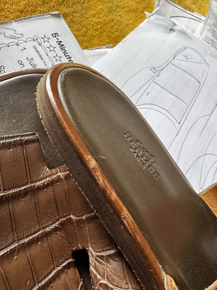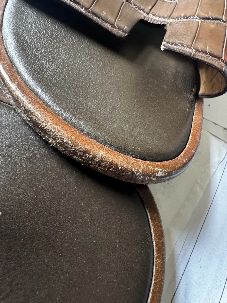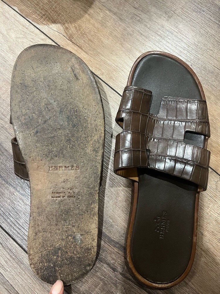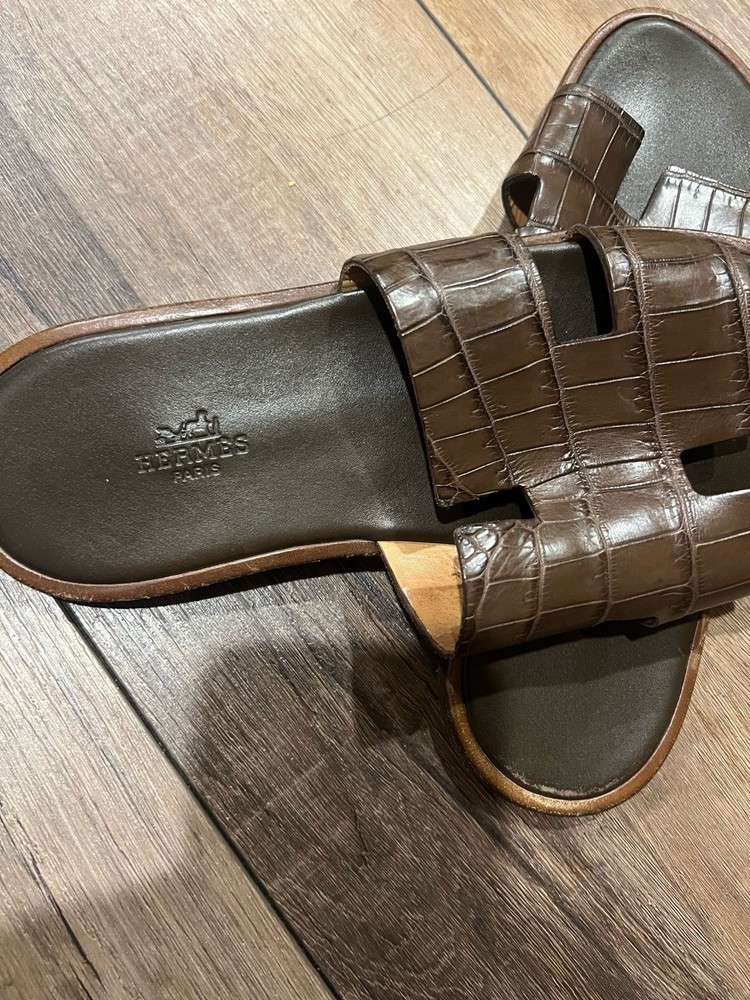 Used Hermes Crocodile Izmir Sandals Iconic H Cutout men's size US 9 Italy 42 slides in brown very rare new goes over $6k Please see all pictures and ask any questions before making a purchase. This is a used item. I can send you more images upon request. No return.