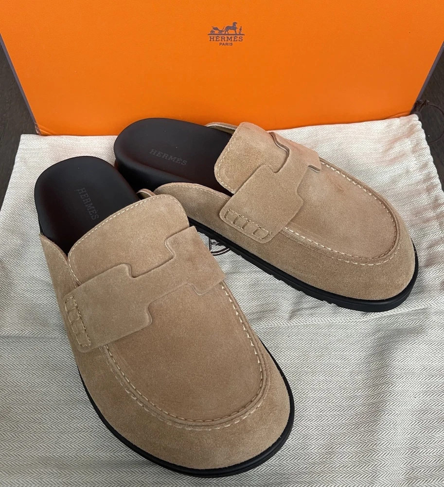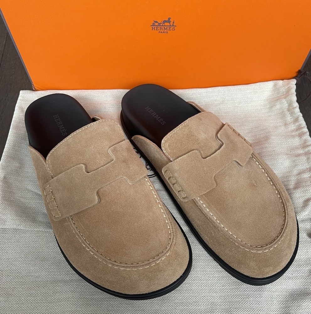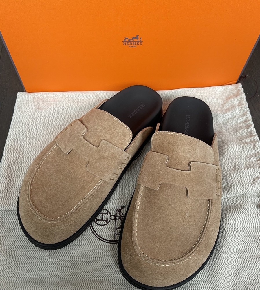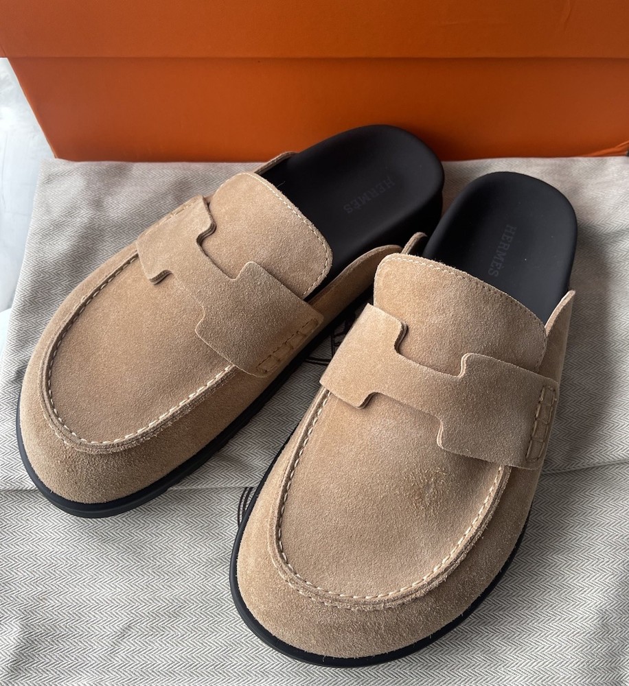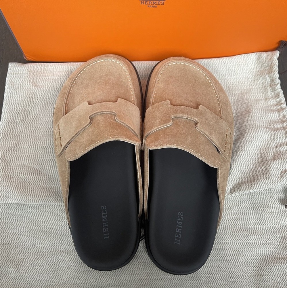women's suede mule loafers in beige, sized EU 39/US 8-8.5. Beautiful suede Hermès mules in a timeless neutral shade. Elegant and comfortable, perfect for both casual and elevated looks. There is a small, barely noticeable mark on the suede (please see photos). All photos are real and were taken by me. If you have any questions or would like additional pictures, please feel free to message me.
