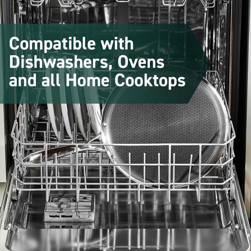 Package: 1X HexClad Hybrid Nonstick 12-Inch Griddle Pan, Stay-Cool Handle, Dishwasher-Friendly, Oven-Safe Up to 900°F, Induction-Ready, Compatible with All Cooktops Description: HexClad's patented hybrid tech utilizes tri-ply construction – aluminum between two layers of stainless-steel - laser-etched with our hexagonal nonstick surface to deliver the searing power of stainless, durability of cast-iron and easy cleanup of nonstick. Versatile enough to toast tortillas for huevos rancheros, or cook up French toast or even sear a steak, the Hybrid Griddle is ideal for cooking up anything needing a large flat surface to perfection. Use your HexClad cookware on any home cooktop or stovetop, including induction. Every piece is also scratch-resistant, dishwasher-friendly, and oven-safe up to 900°F. (Tempered glass lids are oven-safe up to 400°F, while stainless steel lids are oven-safe up to 900°F.) HexClad products that are sold by HexClad Cookware are backed by a lifetime warranty from manufacturer's defects. (Commercial and restaurant use excluded). Your purchase includes one HexClad 12-inch Griddle Pan. The 12-inch Griddle Pan measures approximately 12 inches in diameter, and 1 inch in height.