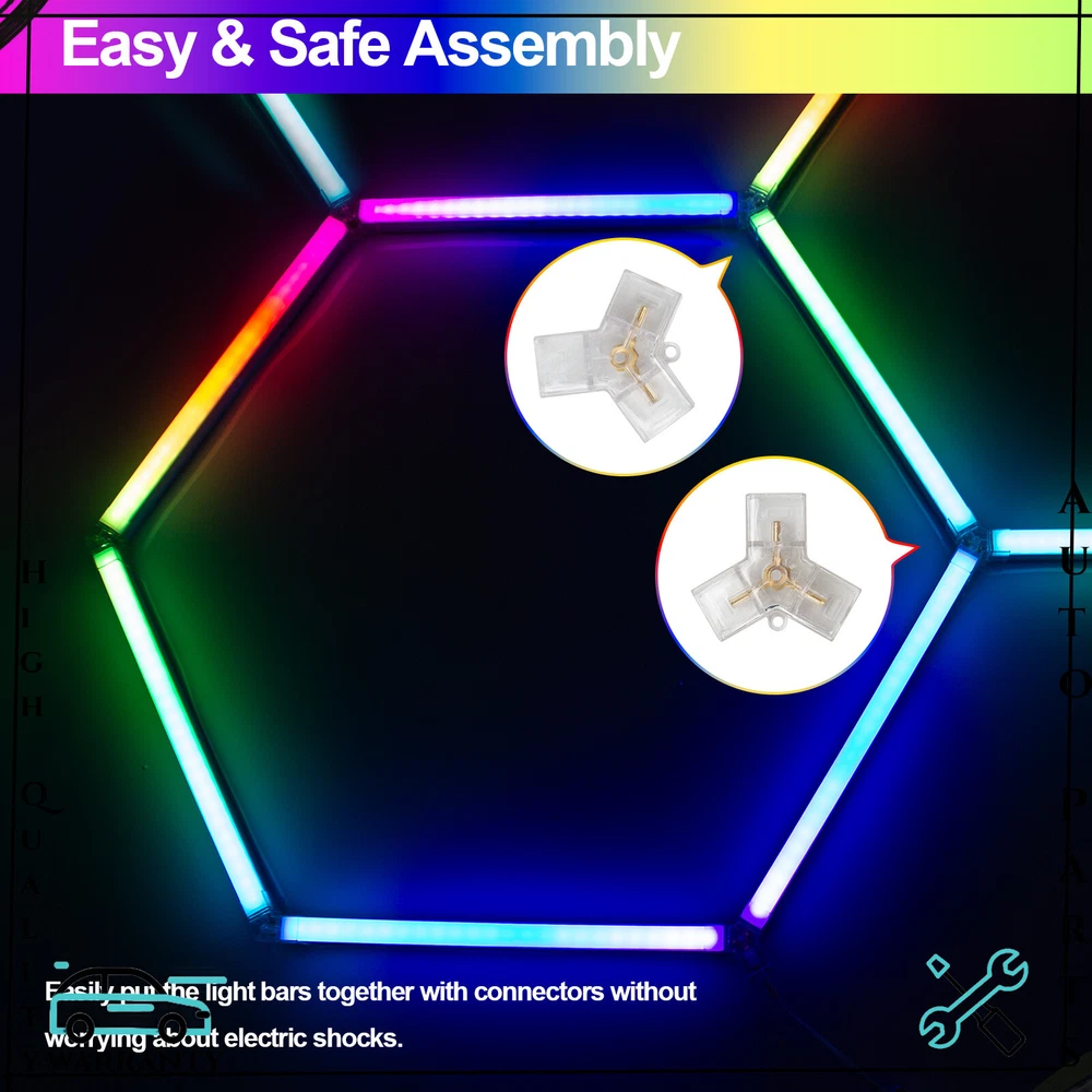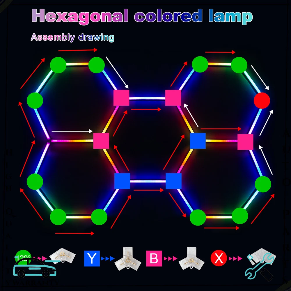 Description: LED hexagonal honeycomb light is easy to install, just insert both ends; DIY assembly method, can be assembled into various hexagons or rectangles according to your own preferences; It is usually used for lighting in garages, car washes, car repair shops, exhibition halls, shopping malls and other places to enhance the style and attract people. Industrial sense of fashion. This is a hexagon patterned garage light LED workshop lighting system can be mounted on the wall and ceiling with screws and zippers. The light spread from the pattern gives you a comfortable visual experience a pleasant viewing experience and illuminates an entire garage bay at the same time. This takes the idea of illuminating your space to a whole new level. Specification: Voltage: 110V-220V(Input) Power: 43W Lumen: 15950LM Color Temperature:6500K Material: Aluminum + PC Cover Product Size: 96.2 x 67.2 x 0.78 inches(L x W x H) Single Tube length: 460mm Warranty: 2 Years The remote is only red, green and blue. Product Included: The Power Cable: 1-end RGB Remote Controller: 1 piece 5 grids LED Hexagon Lights RGB Attention: Due to the different methods of measurement, the size has a slight error LED garage ceiling lights features: 1.The lamp tube is wider, 20mm, the light emitting surface is larger and brighter, wide range of lighting. 2. super bright: 110-120lm /w. High quality LED chips, much brighter. 3. high safety factor: built-in plug, it is difficult for fingers to touch the plug. 4. the led store lights installation is firmer than other stores and not easy to loosen. 5. DIY design, just provide us with the size and shape you want, and we will provide a design solution.