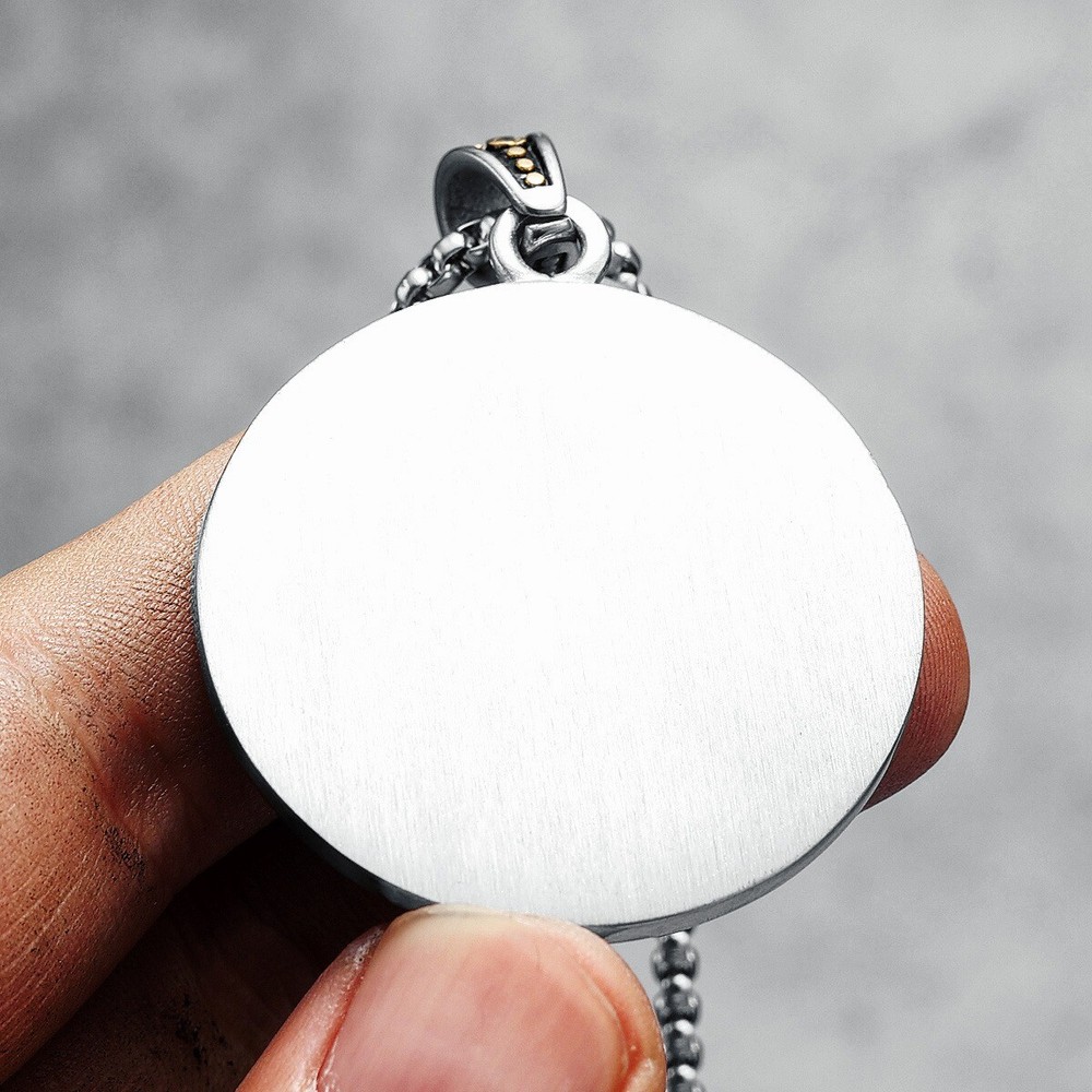 Diamond Clarity Grade: N/a Metal Purity: 316L Theme: Angels, Animals & Insects, Biker, Bohemian, Fashion & Costumes, Gothic, Halloween, Hip Hop, Love, Masonic, Religious, Punk, Retro, Skeletons & Skulls, Viking Certification: N/a Main Stone Creation: Unknown Main Stone Shape: Round Country of Origin: China Country/Region of Manufacture: China Material: Unknown Total Carat Weight: N/a Main Stone Color: N/a Main Stone Treatment: Unknown Metal: Stainless Steel Colored Diamond Intensity: N/a Diamond Color Grade: N/a Type: Necklace Style: Pendant, Chain Department: Men Wholesale: Yes Cut Grade: Excellent Setting Style: Prong Chain Type: Round Link Base Metal: Stainless Steel Main Stone: No Stone Necklace Length: 23 in Closure: Lobster Brand: Unbranded