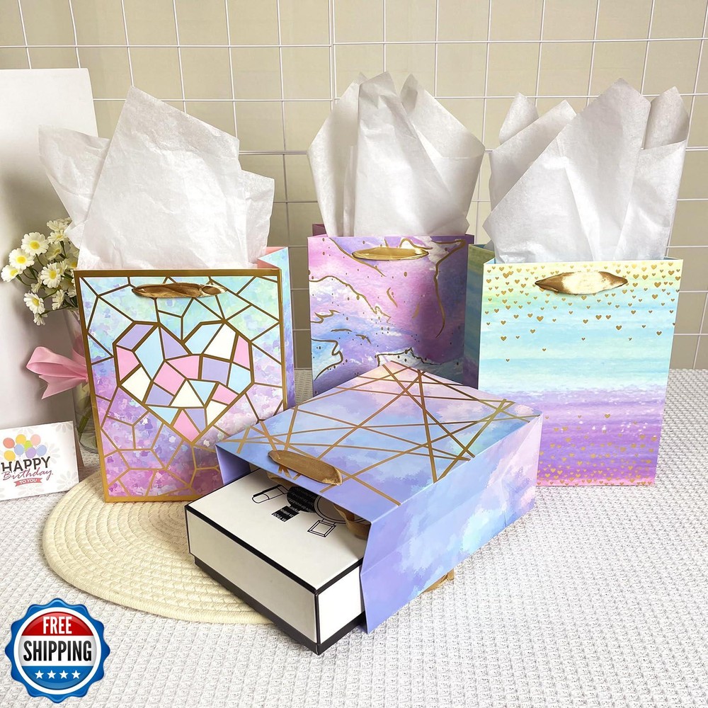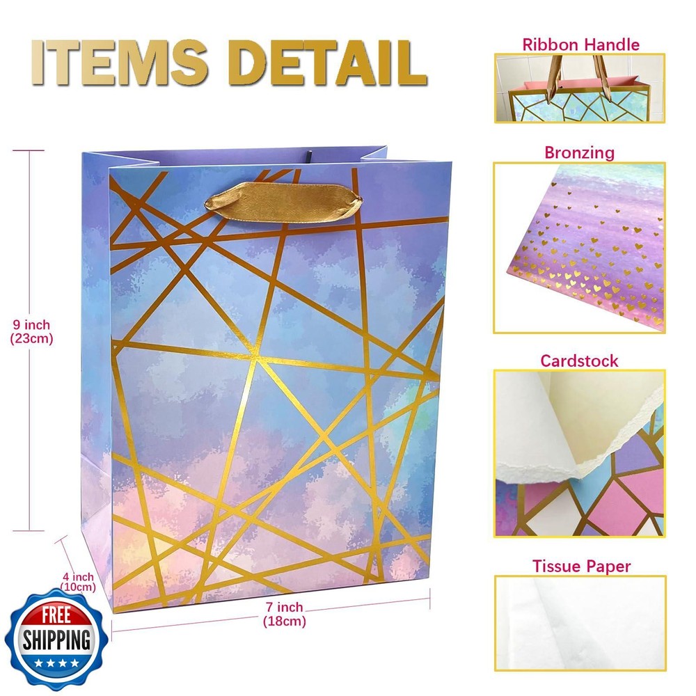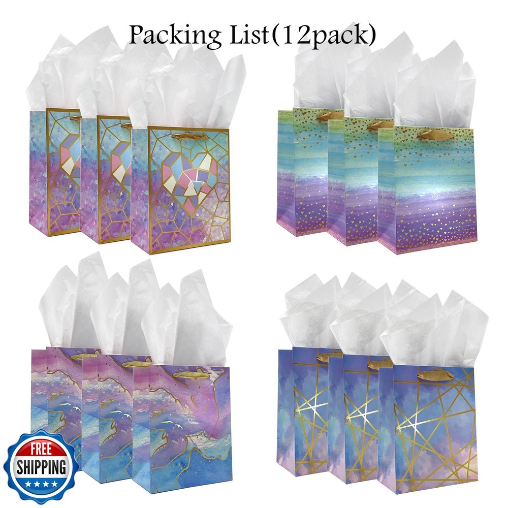 HiCivan 12 Pack-7"×4"×9" MediumandSmall Size Gift Bags with Tissue Paper - Ideal for Shopping, Parties, Wedding, Baby Shower and Birthday Gift Giving - from USA Small Business Brand Features Support Small Businesses: This product is from a small business brand in the USA, We will provide more reliable quality and sustainable services Stylish Design: The marble pattern is inlaid with shiny golden stripes, integrating simplicity and fashion. It is exquisitely printed with vivid colors, and it is finely crafted. The paper used is cardstock, making it durable Wide Uses: At parties, such as a baby shower or a bridal shower, paper tote bags can be filled with party favors for guests to take home. Wedding anniversaries, appreciation, proposal, Mother's Day, Valentine's, Thanksgiving, business, they are all ideal choices Gift Giving: Whether it's a birthday present, a holiday gift, or a token of appreciation, placing the gift inside a bag, perhaps with some tissue paper and a ribbon, adds an extra touch of elegance ITEMS SIZE: Each set includes 12 gift bags measuring 7"L×4"W×9"H, along with matching tissue paper (19.5"×27.5", 12 sheets). This thoughtful combination makes gifting effortless and adds an extra touch of charm to any present Shipping Free & Fast Shipping: We offer free shipping to most of the USA with a normal delivery time of 3-7 days. However, due to the current situation, additional delivery time (up to 3 weeks) may be required for some items. Alternative Carriers: We may use alternative carriers (e.g., USPS, FedEx, UPS) to ensure your package arrives safely and on time. Due to the use of multiple carriers, we are unable to provide a tracking number automatically. Handling Time: Orders are processed and shipped within 1-2 business days of receiving cleared payment. Shipping Restrictions: Shipping to Alaska, Hawaii, Puerto Rico, Guam, and other US territories may incur shipping charges or delivery restrictions. Please contact us before ordering, or your order can be refunded/cancelled. State Restrictions: Certain items may not be shipped to California due to state regulations. Contact for Tracking Updates: If you require tracking updates or have any concerns about the delivery of your order, please feel free to contact us, and we will be happy to assist you. Return Policy 30-Day Hassle-Free Returns: If you are not completely satisfied with your purchase, you can return the item for free within 30 days of receiving it for a full refund or exchange. Easy Return Process: Contact us, and we will provide you with a prepaid return shipping label and detailed instructions. No Restocking Fee: There are no restocking fees for returns. However, the buyer is responsible for return shipping costs if the return is not due to a seller"s error. Refund Processing: Refunds will be processed within 1 business day of receiving the returned item in its original condition. Feedback Your feedback is extremely important to us. We strive to provide the best products and customer service possible. If you are satisfied with your purchase, please take a moment to leave us a positive review. If you have any concerns or issues with your order, please contact us before leaving negative feedback. We are committed to resolving any problems and ensuring your satisfaction. Contact Us If you have any questions or concerns, please feel free to reach out to our customer support team. You can contact us through the eBay messaging system. We are available Monday to Friday, 9:00 am to 5:00 pm EST, and we will do our best to respond to your inquiry within 24 hours. Thank you for supporting our small family business!