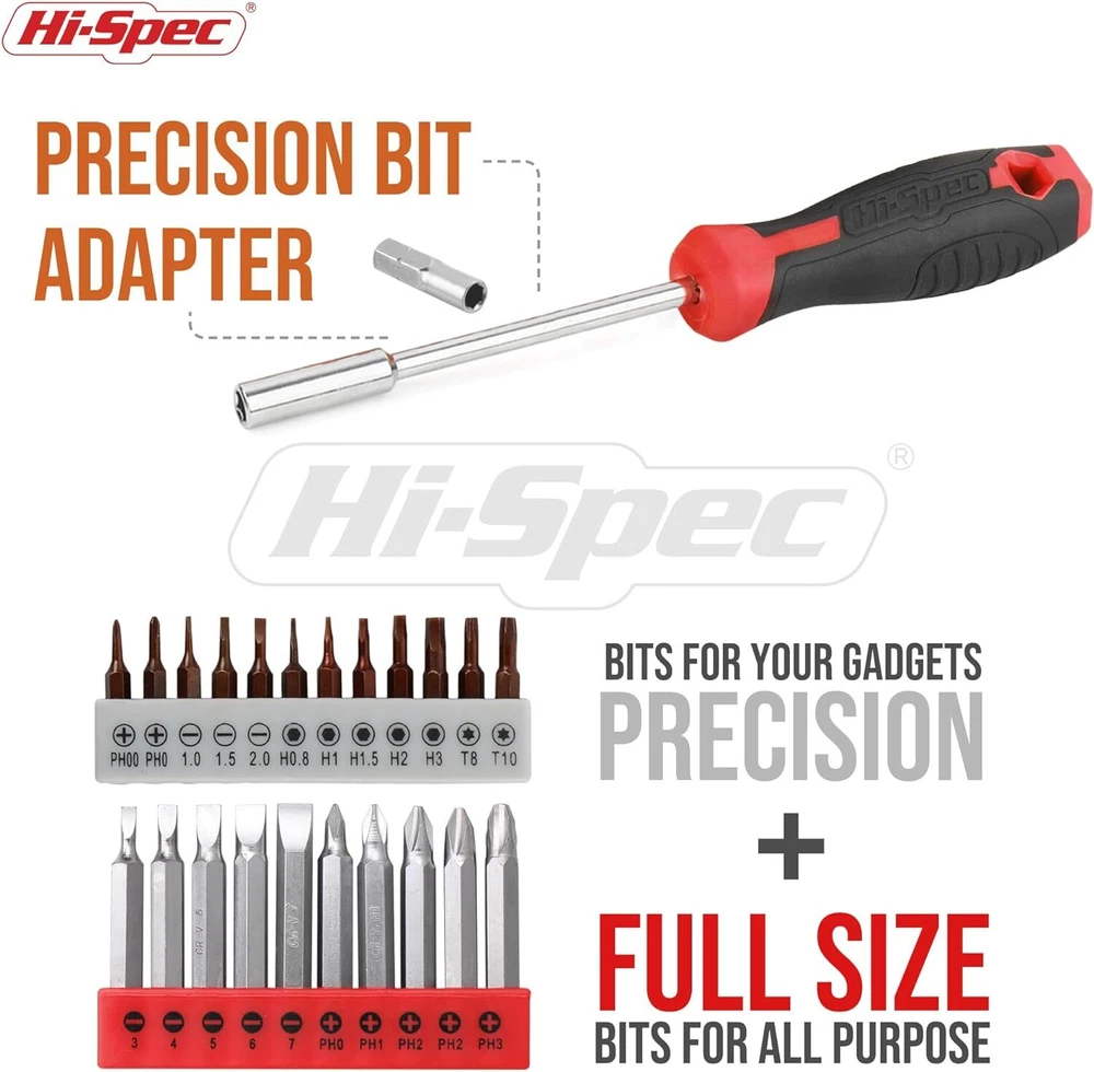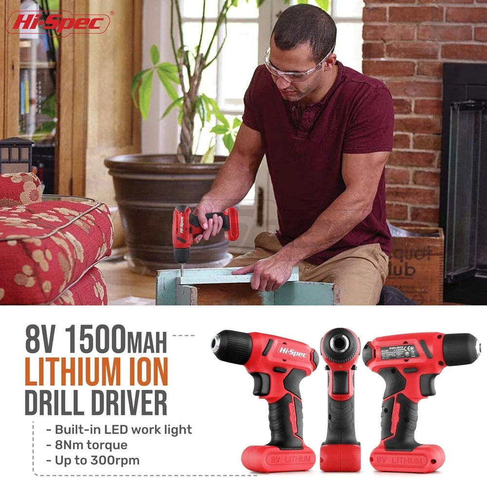 Hi-Spec 58pc Red 8V Electric Drill Driver & Household Tool Kit Set. A 8V, Product Details Brand: Hi-Spec Power Source: Battery Powered Maximum Rotational Speed: 300 RPM Voltage: 8 Volts Amperage: 1500 Milliamps Versatile 8V Drill Driver: Easily handle DIY screwdriving and light drilling in soft woods and plastics; 8Nm torque and a 300rpm variable-speed trigger provide control, while the built-in LED light helps in dimly lit spaces Compact & Lightweight Design: Weighing just 600g/1.3lb, it's easy to maneuver, reducing hand fatigue; USB-rechargeable 1500mAh Li-ion battery offers cordless convenience for quick home repairs Comprehensive Bit Selection: Includes full-sized and precision driver bits to handle a wide range of household screws; Durable S2 steel precision bits for electronics and gadgets; Long 50mm bits extend reach in tight spaces Handy Tools for Every Task: Hang pictures, measure spaces, and handle light repairs; the hammer’s rubber cap prevents tapping damage, the tape measure and spirit level ensure precise alignment, and the utility knife quickly cuts packaging and materials Project Ready: Whether new homeowners, DIY enthusiasts or students, tackle home improvement and decorating with confidence with tools for measuring, aligning, cutting, and securing; all neatly organized in a sturdy, fold-out toolbox, perfect for storage