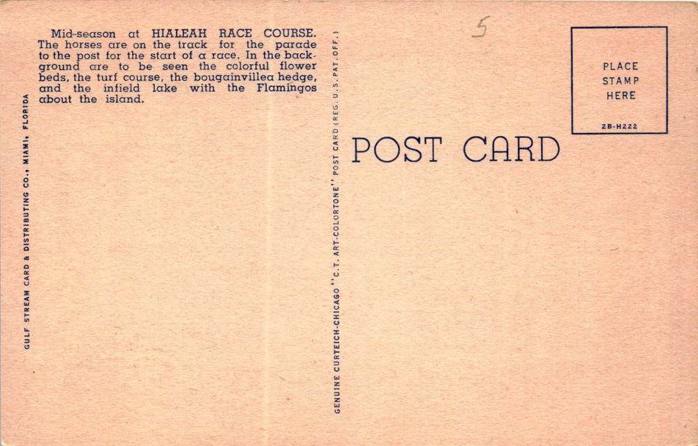 MAKE AN OFFER. THE MORE YOU BUY THE BETTER DEAL I WILL ACCEPT The postcard depicts a scene from mid-season at the Hialeah Race Course in Hialeah, Florida. The image shows horses on the track for a race, with colorful flower beds, a turf course, a bougainvillea hedge, and an infield lake with flamingos around the island in the background.