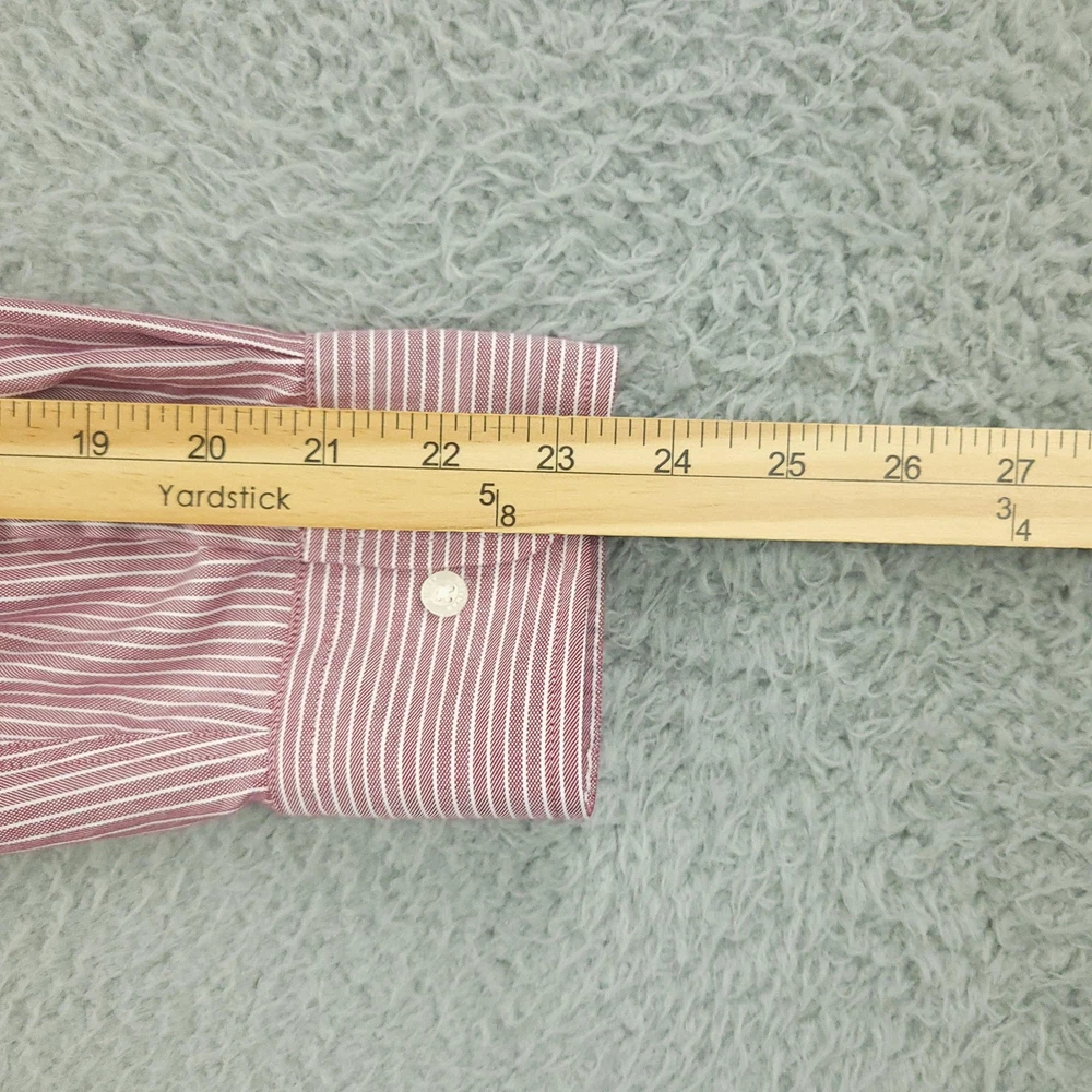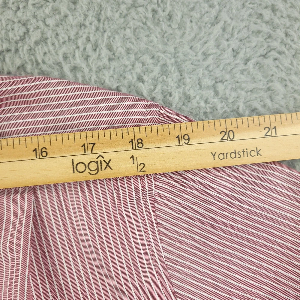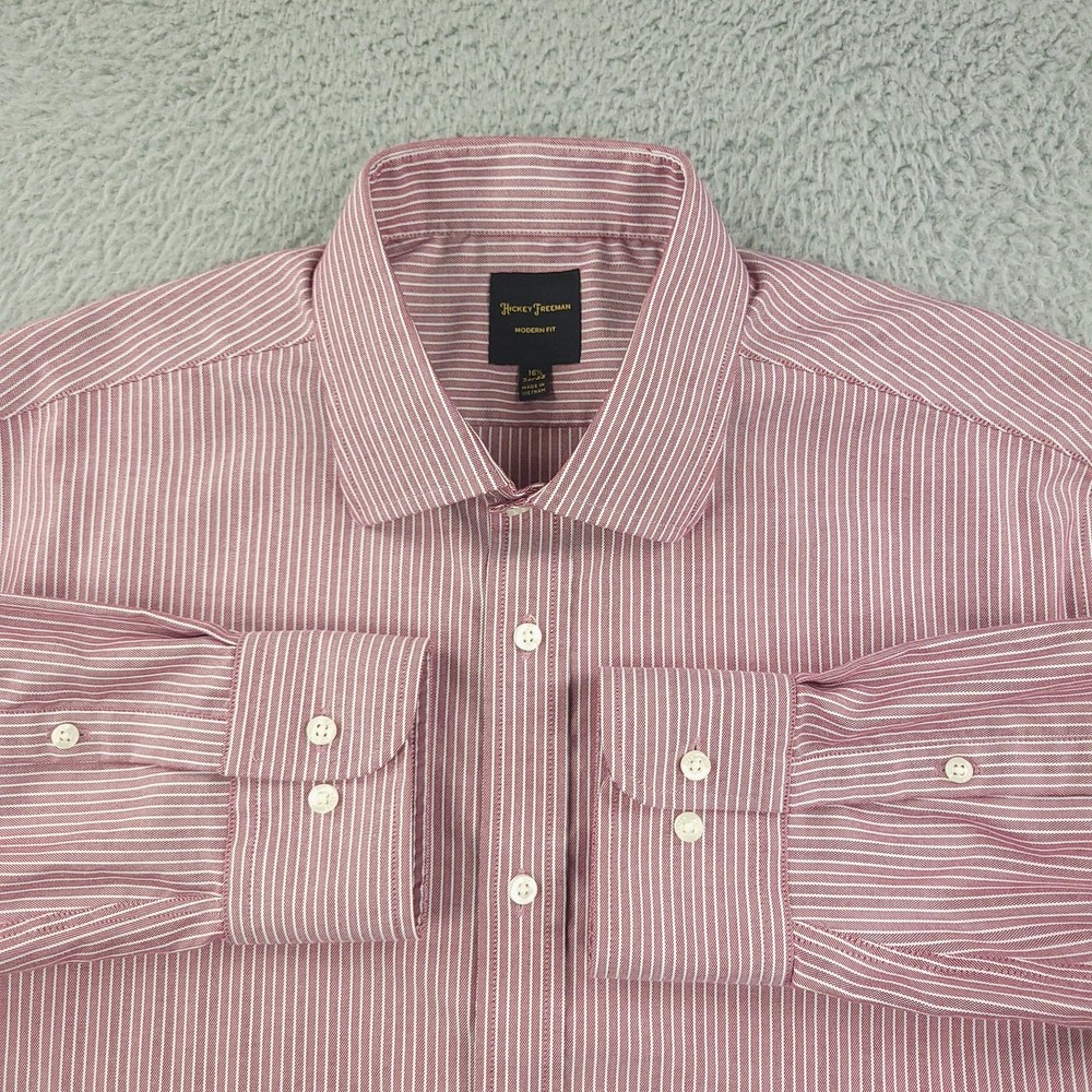 Brand: Hickey Freeman Style: Mens long-sleeve button-front dress shirt in a Modern Fit silhouette. Color/Pattern: Red and white vertical stripe. Size on tag: 16½ neck, 32/33 sleeve. Made in Vietnam. Details: Spread collar, button cuffs, curved shirttail hem, classic striped woven fabric suitable for business or smart-casual wear. Washed and dried with Fragrance Free Detergent & Dryer Sheets. Measurements are included in the photos, compare measurements with your item to ensure proper fit. (Measurements are done with the item lying flat). I ship next business day and all items include tracking. Items are added daily to my store Visit My Store Buy More & Save! Combined shipping for US customers - $1.99 for each additional item (Add items to shopping cart and discounts will automatically calculate during checkout)