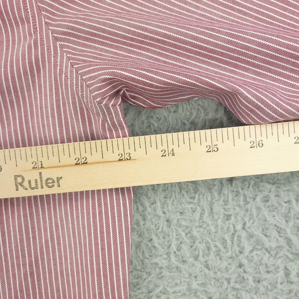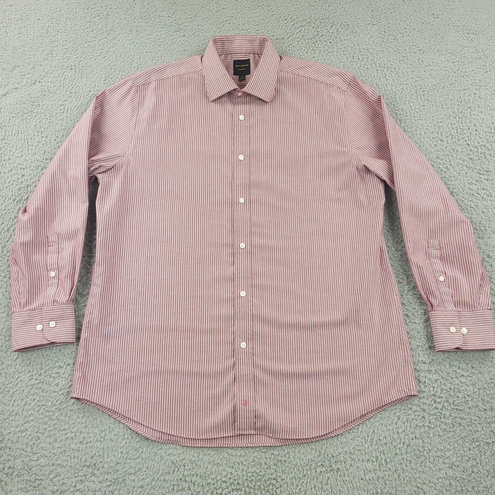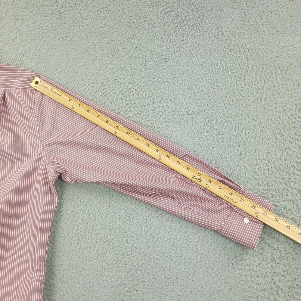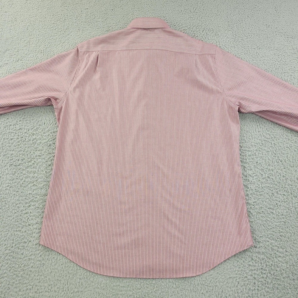 Brand: Hickey Freeman Style: Mens long-sleeve button-front dress shirt in a Modern Fit silhouette. Color/Pattern: Red and white vertical stripe. Size on tag: 16½ neck, 32/33 sleeve. Made in Vietnam. Details: Spread collar, button cuffs, curved shirttail hem, classic striped woven fabric suitable for business or smart-casual wear. Washed and dried with Fragrance Free Detergent & Dryer Sheets. Measurements are included in the photos, compare measurements with your item to ensure proper fit. (Measurements are done with the item lying flat). I ship next business day and all items include tracking. Items are added daily to my store Visit My Store Buy More & Save! Combined shipping for US customers - $1.99 for each additional item (Add items to shopping cart and discounts will automatically calculate during checkout)
