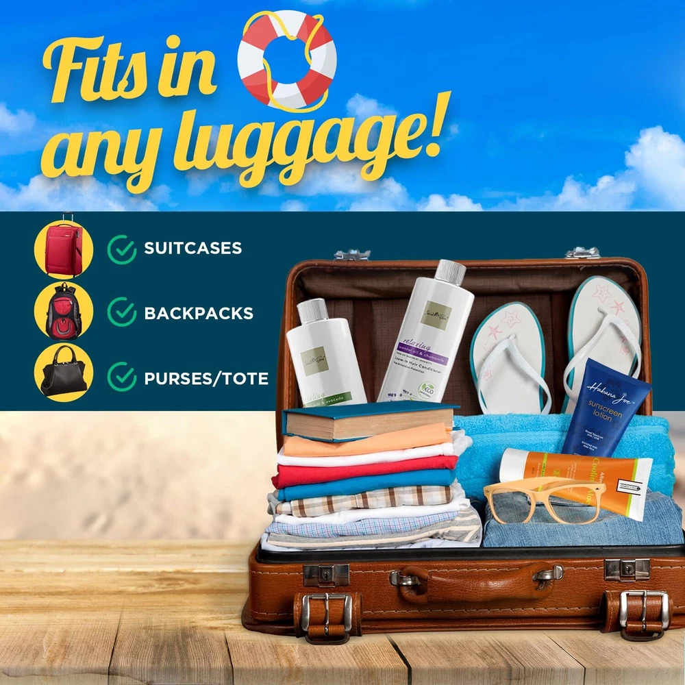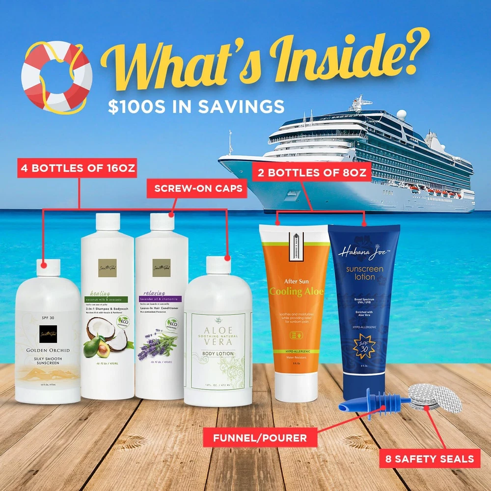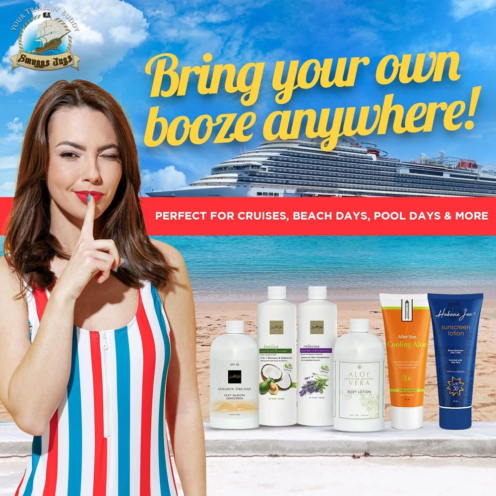 The new and convenient way to bring your favorite alcoholic beverage of choice to any event, anywhere, anytime. If you're going to a cruise, concert, festival, beach or anywhere where they do not allow you to bring your own alcohol, the disguised sunscreen lotion/shampoo flask kit just does the trick. They are reusable and leak proof with a unique design that will get you through virtually any security so you can save your spending money on yourself without having to pay for overpriced drinks. The flasks are made of FDA, HDPE, PETE, LDPE and BPA-Free food grade plastics and made for the specific use of holding alcohol beverages. As an added bonus we have included our detailed "Pack For Success" secrets, must do's and several don'ts, with where, how and why. Smuggle alcohol on your next cruise vacation, be a rum runner with ! Travel-Compatible Containers: This 6-pack of flasks is ideal for discreetly carrying beverages during cruises, sporting events, or beach vacations, with a total capacity of 80 ounces (2.2 liters). These containers are designed to complement your travel essentials seamlessly. Discreet Design: Featuring four 16-ounce and two 8-ounce bottles, each with professionally designed cosmetic labels, these flasks blend in with your toiletries. They are perfect for those seeking a discreet method to carry beverages. Easy to Use: Designed for simplicity, our flasks have wide-mouth openings and leak-proof screw-on caps for a spill-free experience. A bottle pourer is included for your convenience. Durable and Safe Materials: Constructed from FDA-approved food-grade HDPE and PETE plastics, our flasks ensure safety and durability. They come equipped with 12 safety seals, providing a secure, leak-proof experience suitable for passing through security checks. About : has been providing quality products for over 10 years. This product is designed to offer a reliable and enjoyable experience with practical features and durable materials.