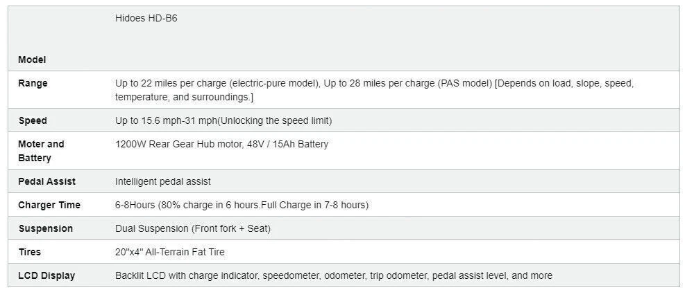 Foldable Electric Bike Adults 21 Miles Long Range Fast Commuter City E-Bike 750W 759.0 USD Free shipping Hidoes B10 Electric Bike 1000W 48V/13Ah Max Speed 28 MPH Adults Mountain E-Bike 999.0 USD Free shipping Electric Bike E-Bike 1200W 48V 18.2AH Adult Bicycles 26" Fat Tire Mountain Ebike 1299.0 USD Free shipping Product Description 无标题文档 💯【Powerful Motor & 5-Speed 】- Electric bike for adults equipped with a powerful 48V 1200W high-speed brushless motor, which adds stronger climbing ability and a top speed of 28MPH. With 5 level speed Gear, our ebike will take u anywhere freely whether it’s snow, beach, mountain or city roads. 💯【Larger Capacity Battery】- 48V 15Ah high-capacity battery can travel 28-34 miles per charge in pure e-bike mode and 34-58 miles in assisted bike mode. Long battery life takes you farther.The non-removable battery avoids the risk of theft. Ride it and enjoy your leisure time instantly. 💯 【Free-locking shock absorption】- Equipped with durable free-locking front suspension and under-seat shock-absorbing suspension, the Adult Electric Bike provides a smooth ride even on rough roads. The electric mountain bike comfortably adapts to all kinds of roads and has good shock absorption to effectively resist the impact on your body. Maximum load capacity is 330 lbs. 💯【LCD Display】- In this bicycle electric,you can easily keep track of the driving speed and mileage, as well as the remaining battery power at all times so you can avoid running out of power. The gear up/down buttons are used to set the gears, and the horn and light button on the handle provide further protection. 💯【Dual Disc Brake & Offroad Tire】- The electric dirt bike for adults is easy to ride uphill, downhill or pure acceleration. Dual front and rear disc brakes provide good braking capacity. The tires are made of anti-skid and anti-explosion materials. The tread pattern on the surface of the tires is anti-skid and wear-resistant, with strong grip and puncture resistance to ensure safe driving. 💯【Easy to Install & Considerate Service】- The ebike arrives 85% assembled. With detailed instructions and installation tools, you can easily complete the installation. We will provide half or 1 year warranty for different bicycle parts. Built to Accommodate A Generous Range of Rider Heights and Sizes. The Hidoes B16 electric bikes are some of the best ebikes on the market. They offer riders the superior performance, greater stability, and a longer lifespan than other electric bikes. In-house designers engineered the frame for enhanced ergonomics, solid handling, and an ideal fit for riders at the bottom end of our height recommendation range. The Hidoes electric bike is ideal for riders 5'3” to 6'5”, and up to 330lbs. Package Contents: 1 x Charger 1 x User Manual 1 x B6 Electric bike Our product: (1) Our product approved by CE/ROHS certificates and Samsung lithium battery be used on. (2) Every piece of spare part will be inspected before assembling and very piece of completed product will be tested before shipment. Contact US (1) Welcome to wholesale and purchase,If you have any question ,Please contact us first. We will reply you within 24 hours. (2)We will leave positive feedback to buyer as soon as buyer pays for the item.We hightly appreciate that you can contact with us before you leaving Negative feedback or Neutral feedback .We will offer help to resolve your problems as fast as possible. The item is UL 2849 certified with a link to the UL Product iQ