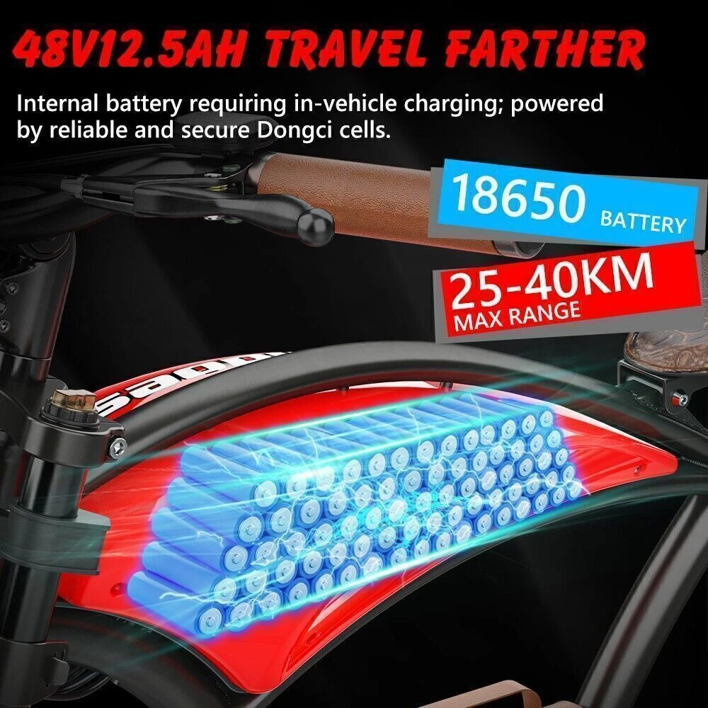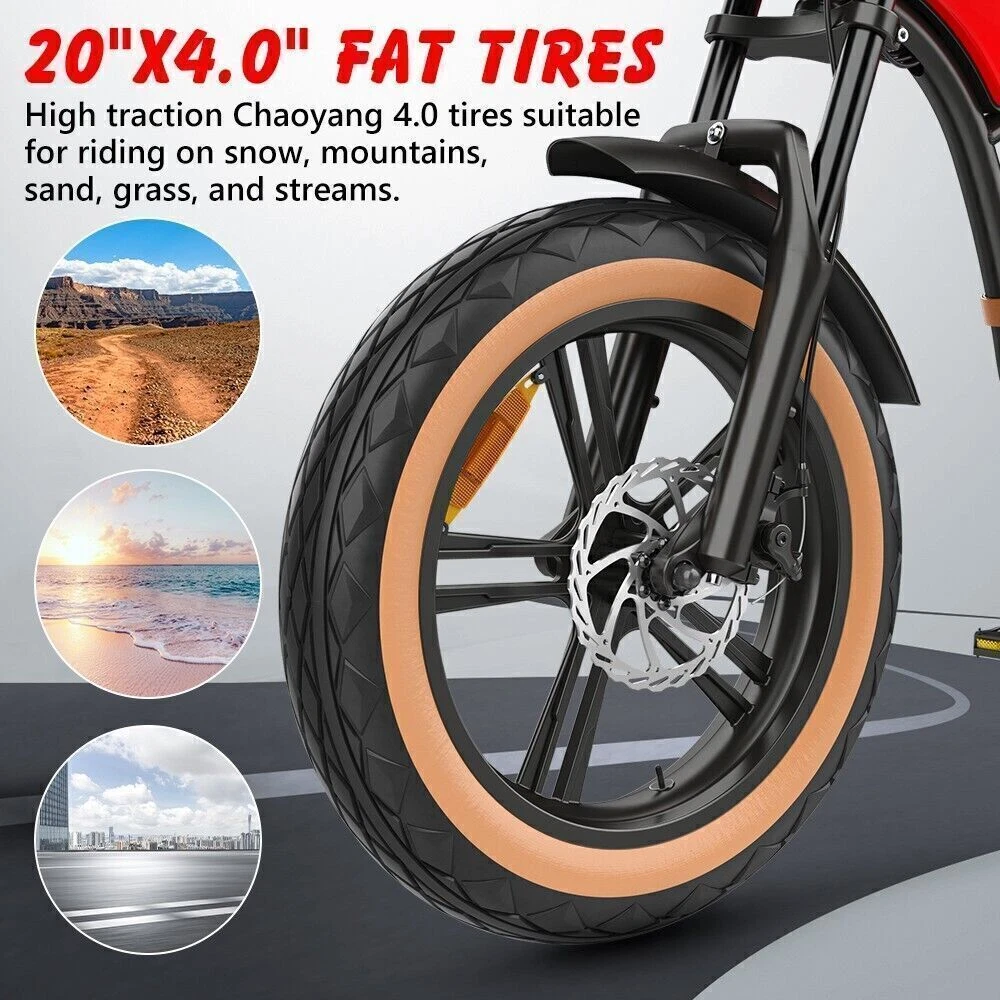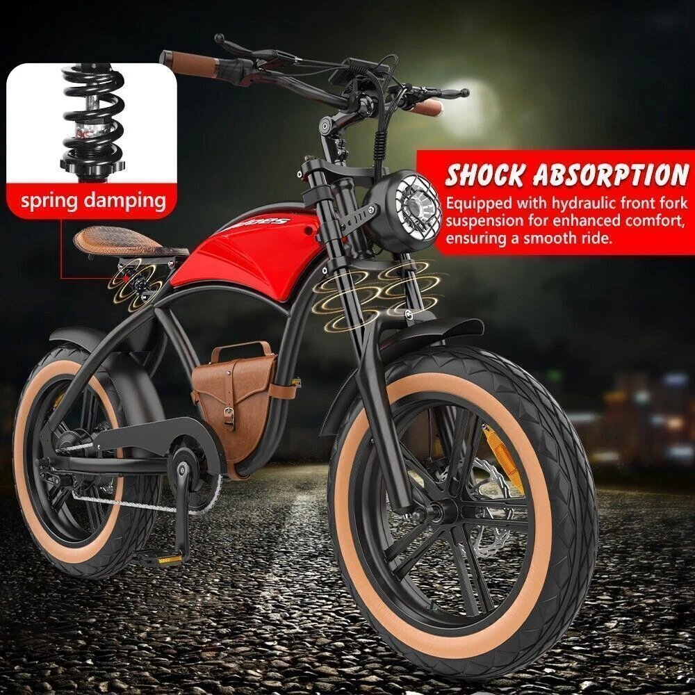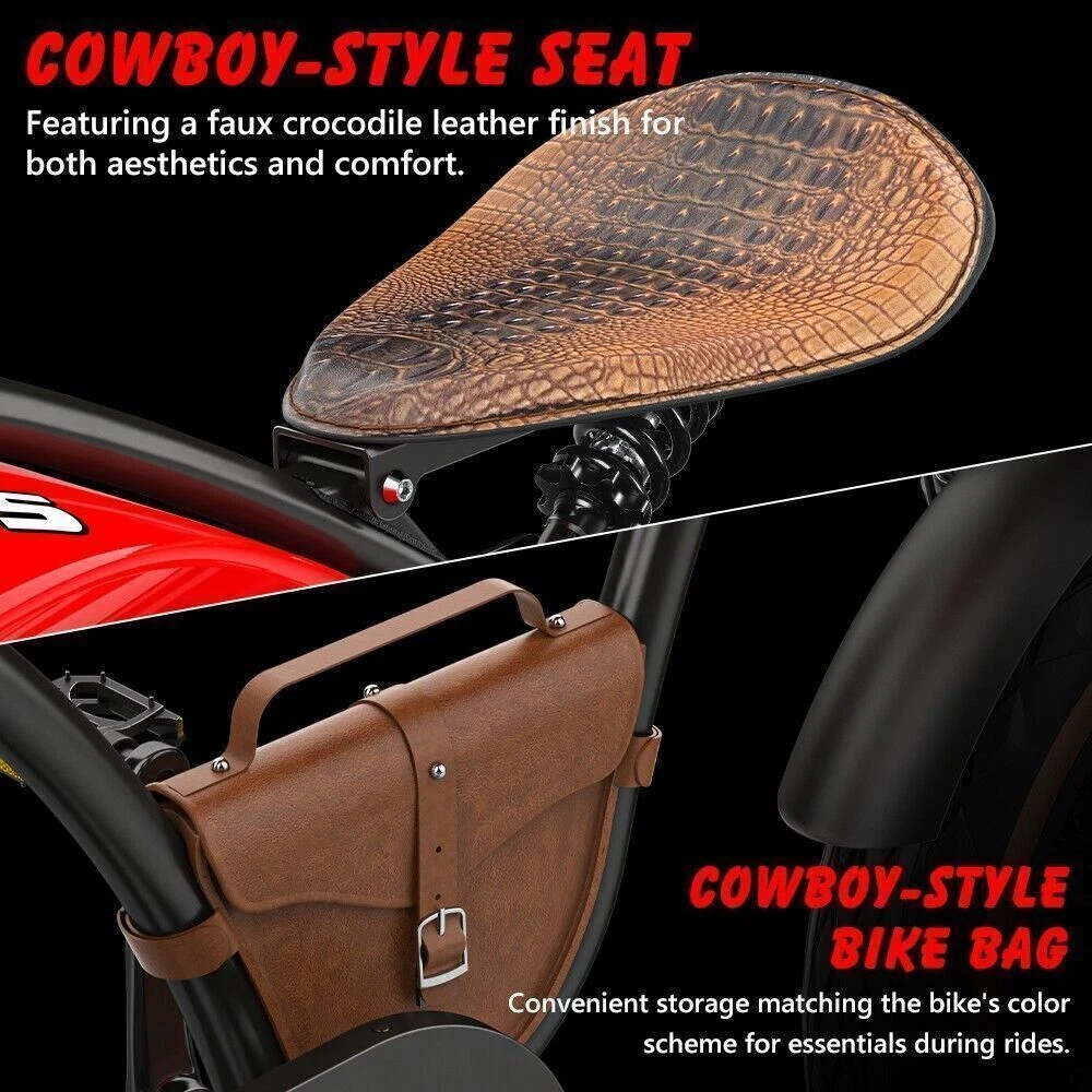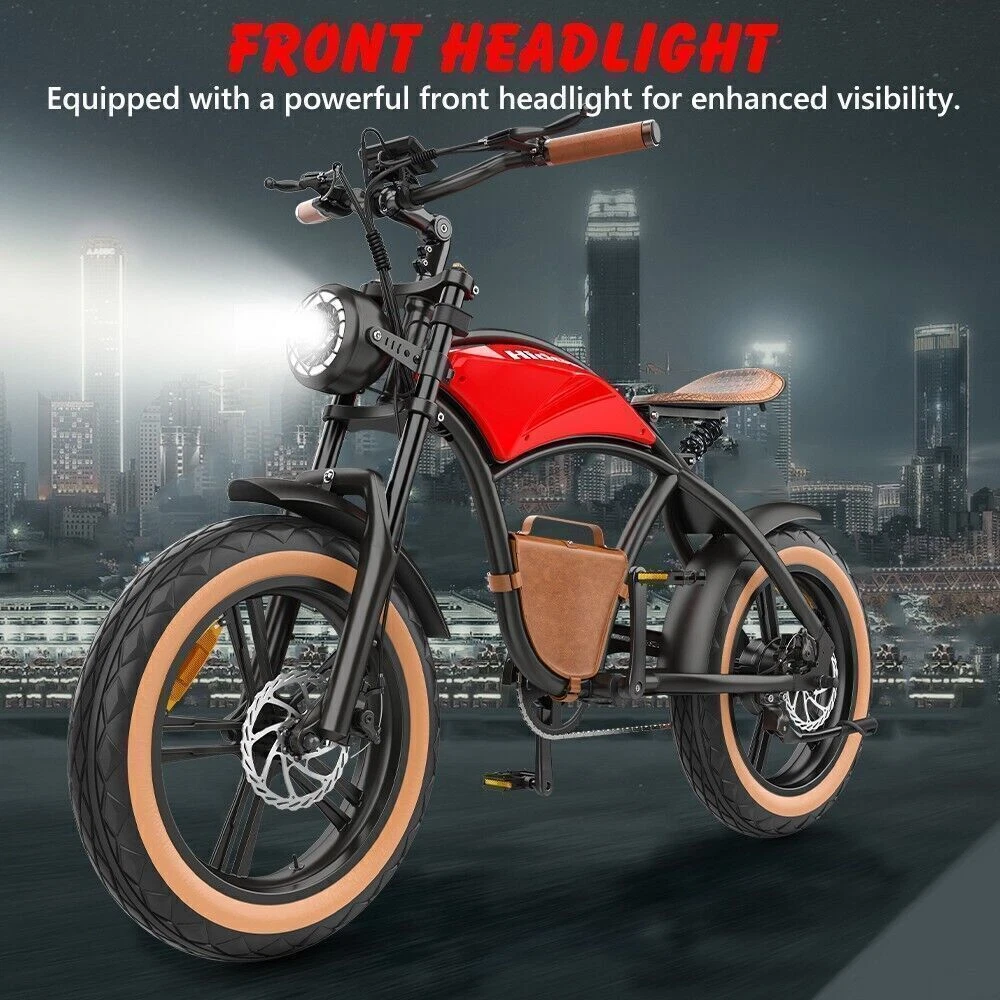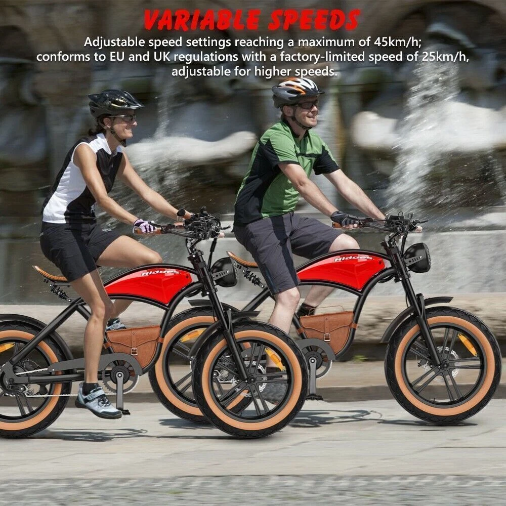 Maximum Range: Up to 30 mi Motor Type: Rear Hub Motor Suspension Type: Full Suspension (Front & Rear) Maximum Speed: 28 mph Features: Display, Fenders, Front Light, Lithium Ion Battery, Pedal Assist Color: Black, Red, Brown Handlebar Type: Cruiser Bar Voltage: 48 V Charging Time: 6-8 Hours gtin13: Does not apply Motor Power: 1000 W Brake Type: Disc Brake - Mechanical Number of Speeds: 5 Speed Brand: HIDOES Department: Unisex Adults Wheel Size: 20 in UPC: Does not apply Material: Aluminum Alloy Tire Type: Fat Tires Country/Region of Manufacture: China Manufacturer Warranty: 6 Months Frame Size: Large Bike Type: E-City Bike