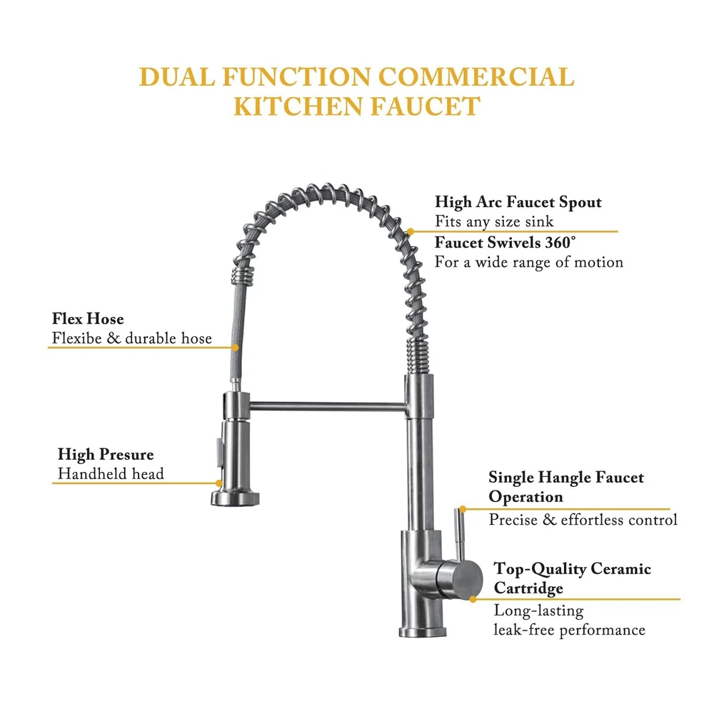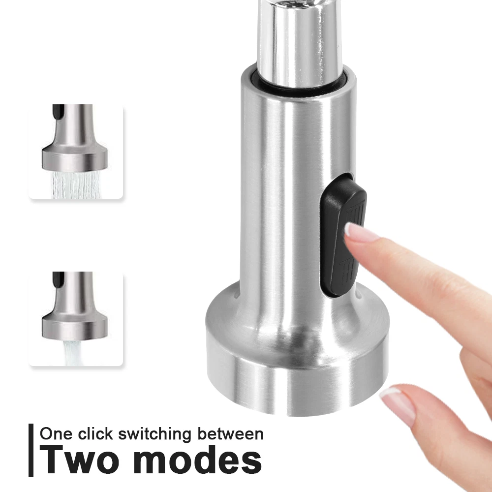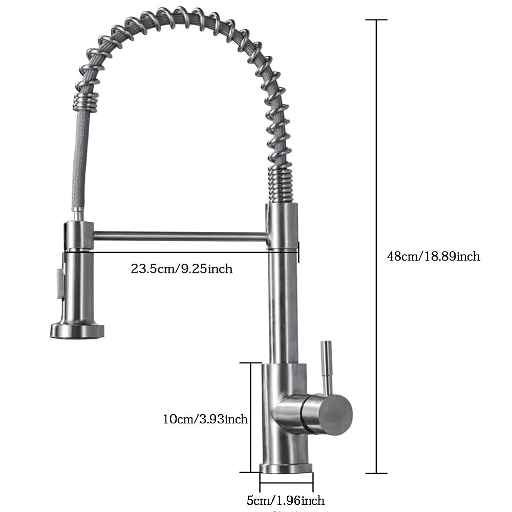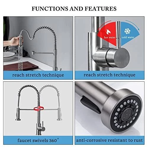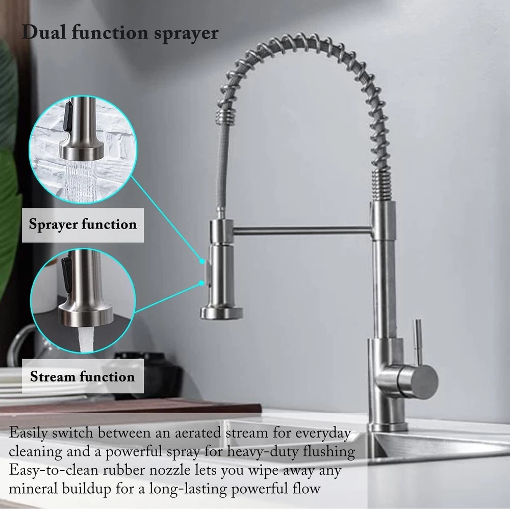 Pull-Out Design - PLEASE NOTE: Hoses are US size, converters are required in other countries. Kitchen faucet design make your kitchen room simple and fresh, easy to match most sink. The flexible spout offers a wide range of motion allowing you to direct water wherever you need it. High quality- Black pull-out spring kitchen, pull down kitchen faucet made up of sturdy solid stainless steel with a maximum valve body thickness of 2.4 cm. Flexible operation, crack resistant and sturdy, can withstand greater water pressure, not easy to break and leak. Multifunctional Use - Our matte black kitchen faucet has two water outlet functions, faucet for kitchen sink uses a kitchen faucet with pull down sprayer high-quality arc sprayer head, and a high arc 360-degree swivel spout supplies full range washing access. Modern Kitchen Faucet --Our sink faucet features the latest handle and kitchen faucet with pull-down sprayer head, Making the kitchen sink faucet overall look more upscale. Easy to Install--Pull down the hose altogether preinstalled in the faucet for the kitchen sink to save much time under the sink, no require a plumber, RV kitchen faucet finish DIY installation less than 30 minutes. The kitchen faucet with pull-down sprayer is the ideal kitchen faucet for your convenient life! High-Quality Pull-Down Kitchen Faucet: Made of high quality stainless steel material, our faucet is very strong and sustainable, this is a sturdy kitchen sink faucet. Convenient and Easy to Use: With its 360-degree pull-down feature, our faucet makes it easy to wash dishes, rinse vegetables, and fill pots with ease. Sleek and Modern Design: Our faucet's sleek and modern design will complement any kitchen decor and add a touch of elegance to your space. 360 Degree Rotate Spout Our kitchen faucet features a 360-degree swivel design, allowing you to easily adjust the water flow and direction to suit your needs. Flow modes STREAM MODE --- Filling water to pots and pans. SPRAY MODE --- Perfect for baby or dog shower. Sturdy Construction Our faucet has undergone multiple tests to ensure its durability and longevity, making it a reliable addition to your kitchen. Versatile Design: Our faucet's sleek and modern design makes it a versatile addition to any kitchen decor, while its high-quality construction ensures it will last for years to come. Superior Performance: Our faucet delivers superior performance, with a smooth and consistent water flow that makes it easy to wash dishes, rinse vegetables, and more. Specification Type:Kitchen Faucet Material : Stainless Steel Finish Type : Brushed nickel Handle material : Metal Spout Height : 8.5 Inches Handle Location : Left/Right/Center Spout Reach : 8.5 Inches Installation Method : Single-Hole Deck-Mount Flow Rate : 1.8 Gallons Per Minute Number of Handles : 1 Package include: Kitchen Faucet Mounting Accessories A pair of Water Line Hoses
