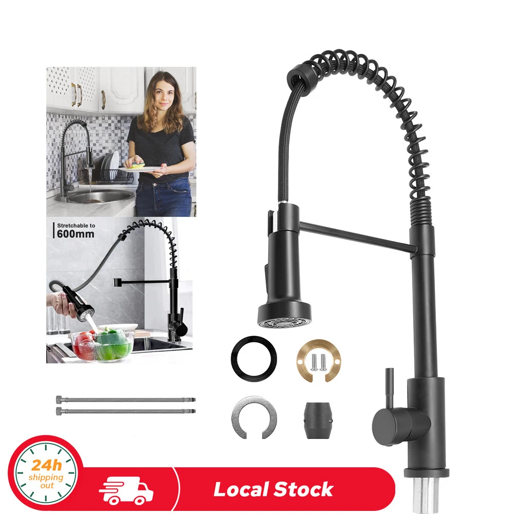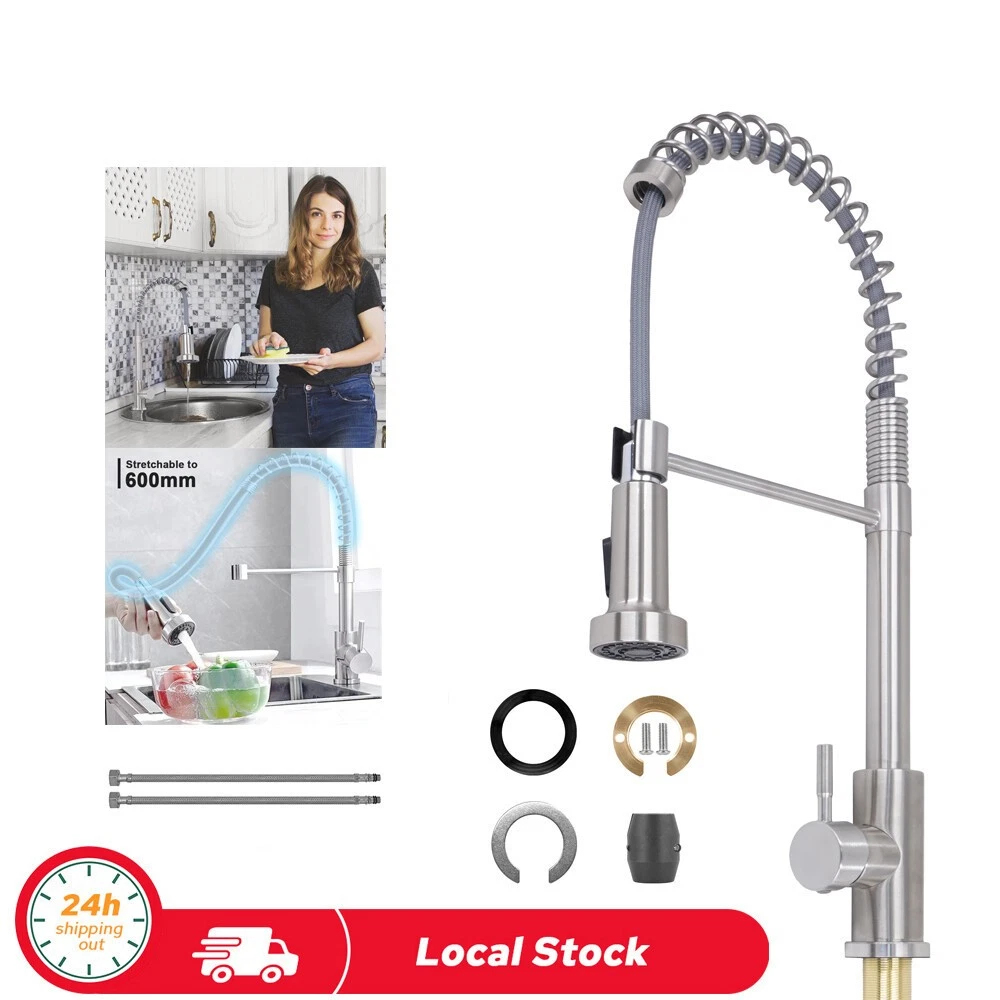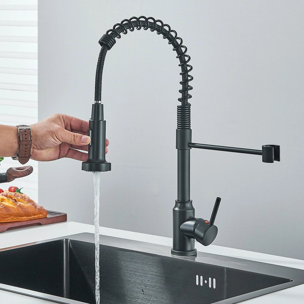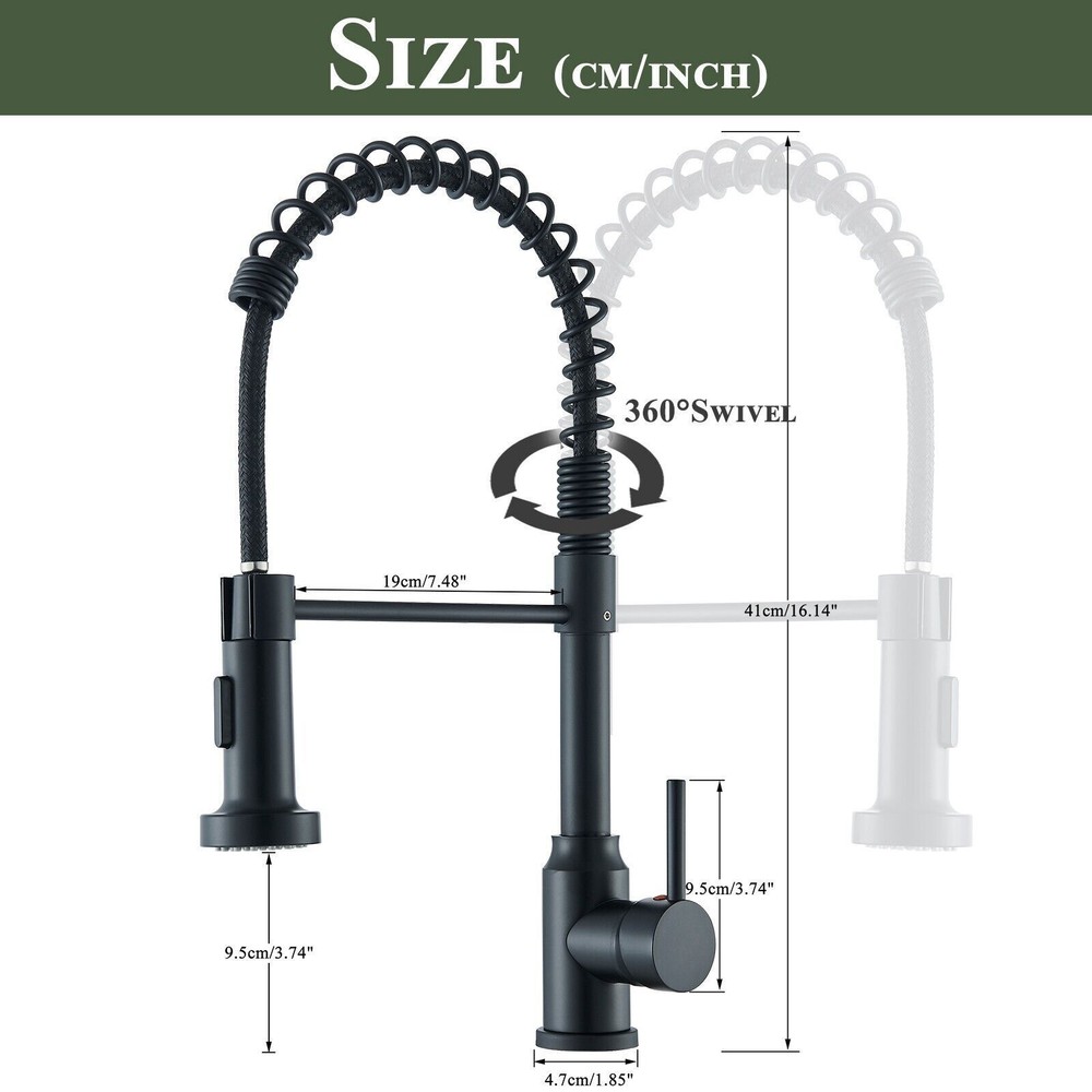 Pull-Out Design - PLEASE NOTE: Hoses are US size, converters are required in other countries. Kitchen faucet design make your kitchen room simple and fresh, easy to match most sink. The flexible spout offers a wide range of motion allowing you to direct water wherever you need it. High quality- Black pull-out spring kitchen, pull down kitchen faucet made up of sturdy solid stainless steel with a maximum valve body thickness of 2.4 cm. Flexible operation, crack resistant and sturdy, can withstand greater water pressure, not easy to break and leak. Multifunctional Use - Our matte black kitchen faucet has two water outlet functions, faucet for kitchen sink uses a kitchen faucet with pull down sprayer high-quality arc sprayer head, and a high arc 360-degree swivel spout supplies full range washing access. Modern Kitchen Faucet --Our sink faucet features the latest handle and kitchen faucet with pull-down sprayer head, Making the kitchen sink faucet overall look more upscale. Easy to Install--Pull down the hose altogether preinstalled in the faucet for the kitchen sink to save much time under the sink, no require a plumber, RV kitchen faucet finish DIY installation less than 30 minutes. The kitchen faucet with pull-down sprayer is the ideal kitchen faucet for your convenient life! High-Quality Pull-Down Kitchen Faucet: Made of high quality stainless steel material, our faucet is very strong and sustainable, this is a sturdy kitchen sink faucet. Convenient and Easy to Use: With its 360-degree pull-down feature, our faucet makes it easy to wash dishes, rinse vegetables, and fill pots with ease. Sleek and Modern Design: Our faucet's sleek and modern design will complement any kitchen decor and add a touch of elegance to your space. 360 Degree Rotate Spout Our kitchen faucet features a 360-degree swivel design, allowing you to easily adjust the water flow and direction to suit your needs. Flow modes STREAM MODE --- Filling water to pots and pans. SPRAY MODE --- Perfect for baby or dog shower. Sturdy Construction Our faucet has undergone multiple tests to ensure its durability and longevity, making it a reliable addition to your kitchen. Versatile Design: Our faucet's sleek and modern design makes it a versatile addition to any kitchen decor, while its high-quality construction ensures it will last for years to come. Superior Performance: Our faucet delivers superior performance, with a smooth and consistent water flow that makes it easy to wash dishes, rinse vegetables, and more. Specification Type:Kitchen Faucet Material : Stainless Steel Finish Type : Brushed nickel Handle material : Metal Spout Height : 8.5 Inches Handle Location : Left/Right/Center Spout Reach : 8.5 Inches Installation Method : Single-Hole Deck-Mount Flow Rate : 1.8 Gallons Per Minute Number of Handles : 1 Package include: Kitchen Faucet Mounting Accessories A pair of Water Line Hoses