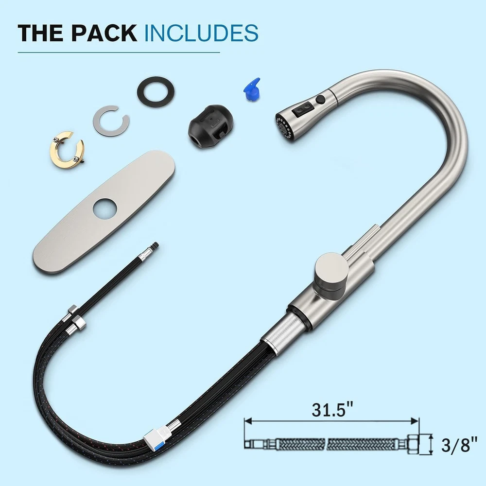 Special Feature: Pull Down Sprayer, Water Saving System, Built In Water Filter, 36 Brand: Does not apply Handle Material: Stainless Steel Item Weight: 3.87 pounds Spout Height: 8.25 Inches Number of Pieces: 1 Country of Origin: China Installation Type: Centerset Item Package Quantity: 1 Recommended Uses For Product: Kitchen Special Features: Pull Down Sprayer, Water Saving System, Built In Water Filter, 36 Batteries Required?: No Material: Stainless Steel Included Components: ['Deck Plate', 'Instruction Manual', 'Mounting Accessory'] Number of Handles: 1 UPC: 313052441449 Hose Length: 11.8 Inches Handle Type: Lever Spout Reach: 7.13 Inches Finish: Brushed Mounting Type: Deck Mount Is Electric: No Hole Count: 3 Type: Does not apply Manufacturer: Directly Handle Location: Center Maximum Flow Rate: 1.8 Gallons Per Minute Part Number: B097XCCWMJ Style: Classic Batteries Included?: No Finish Type: Brushed Item model number: B097XCCWMJ Model Name: B15-INCH HIGH ARC PULL DOWN SPRAYER KITCHEN FAUCET Product Dimensions: 7"D x 9.84"W x 14.8"H Spout Design: High Arc Size: Middle Valve Type: Cartridge Valve Color: Brushed Nickel 15.5-Inch Warranty Type: extended gtin13: 313052441449