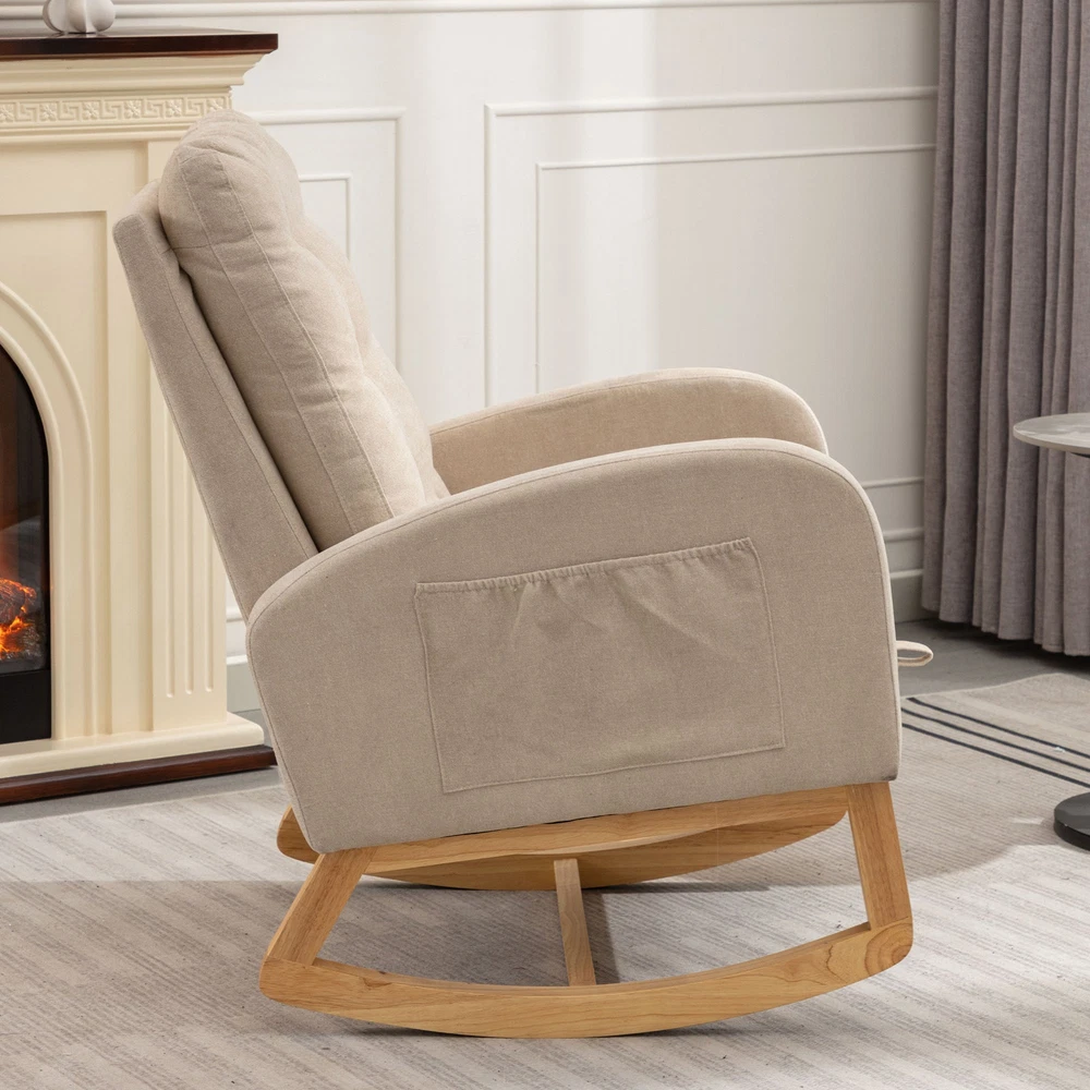 Specifications Place of Origin #originPlace# Main Color Beige Main Material Foam+Spring Dangerous Goods #dangerFlag# Dimensions & Weights Assembled Length (in.) 26.77 Assembled Width (in.) 38.36 Assembled Height (in.) 39.76 Weight (lbs) 46.30 Product Features A high backrest and cozy Armrest ergonomic chair can give you strong support for your whole body This rocking chair is a great addition to any room in your home, especially a living room bedroom, or nursery. This indoor rocking chair with a thick cushion seat and back provides you incredibly soft sitting experience and relieve your fatigue. Upholstered Rocking Chair Comfortable Living Room Rocker Lounge Armchair with Solid Wood Base High-Back Porch Rocker Nursery Rocker w/Side Storage Pocket This rocking chair with footrest,let your feet get some rest Description