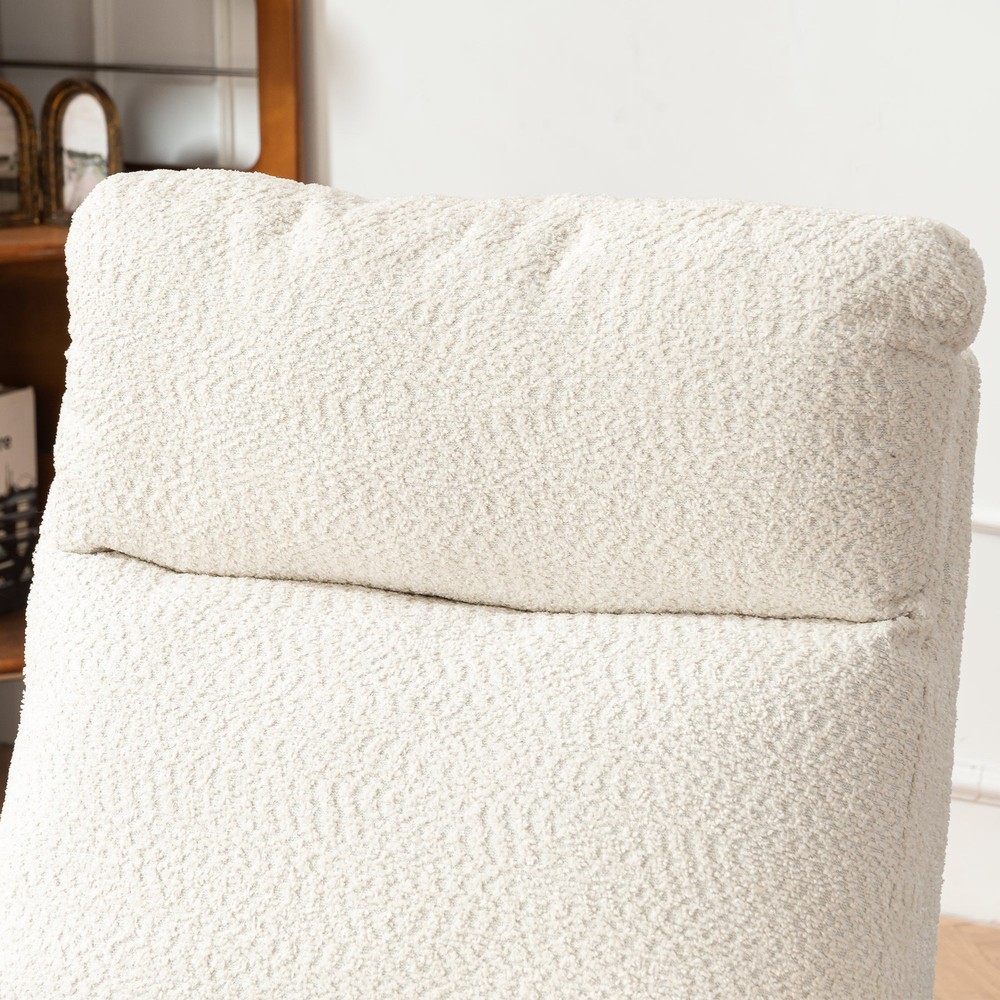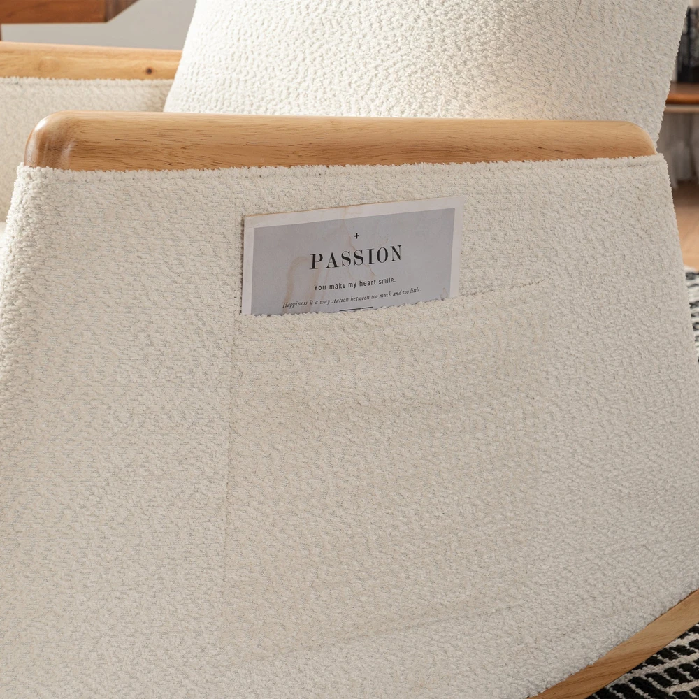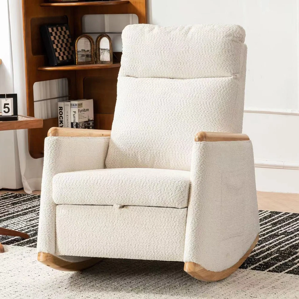 This rocking chair is a dream for relaxation! The high back and thick cushioning provide amazing support, while the smooth rocking motion is so soothing. The added footrest and side storage pocket are super convenient. Sturdy wood base and cozy beige upholstery make it perfect for any room—living room, nursery, or porch. Lightweight yet durable, it’s easy to move around. Absolutely love how comfortable it is after a long day!