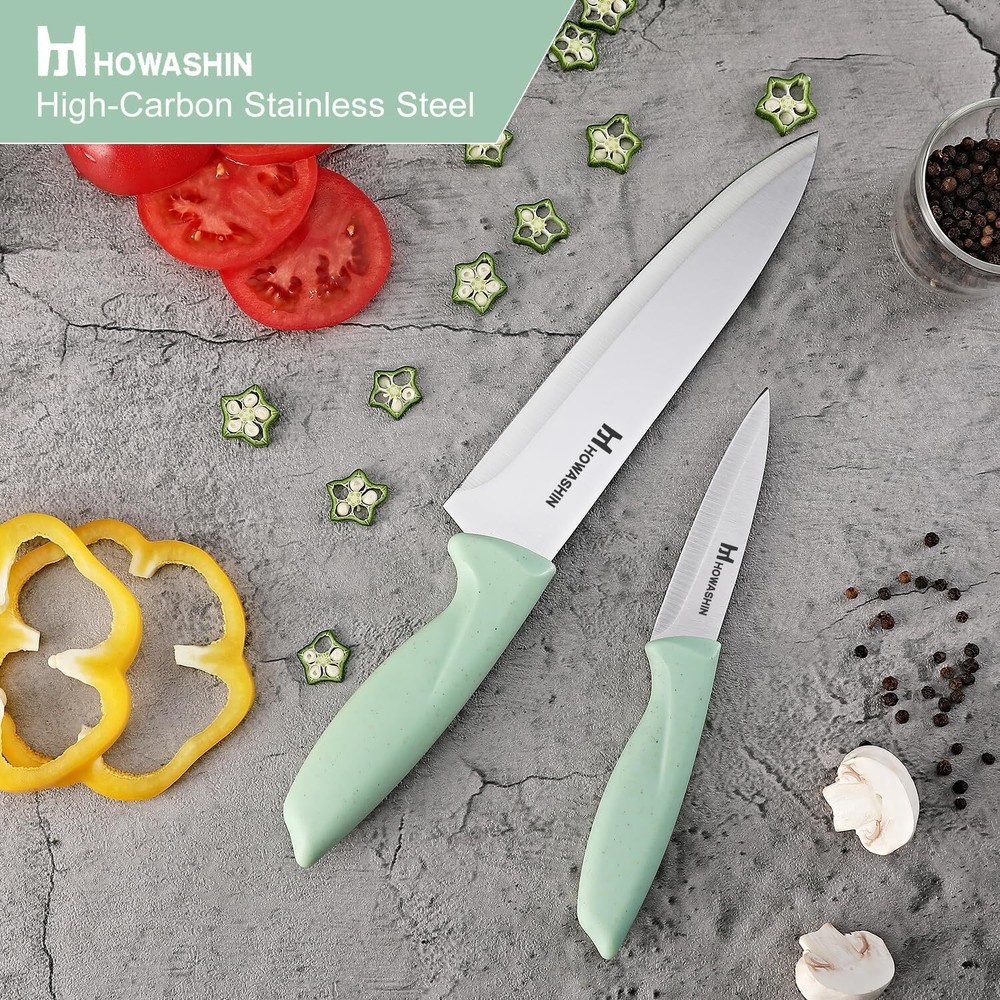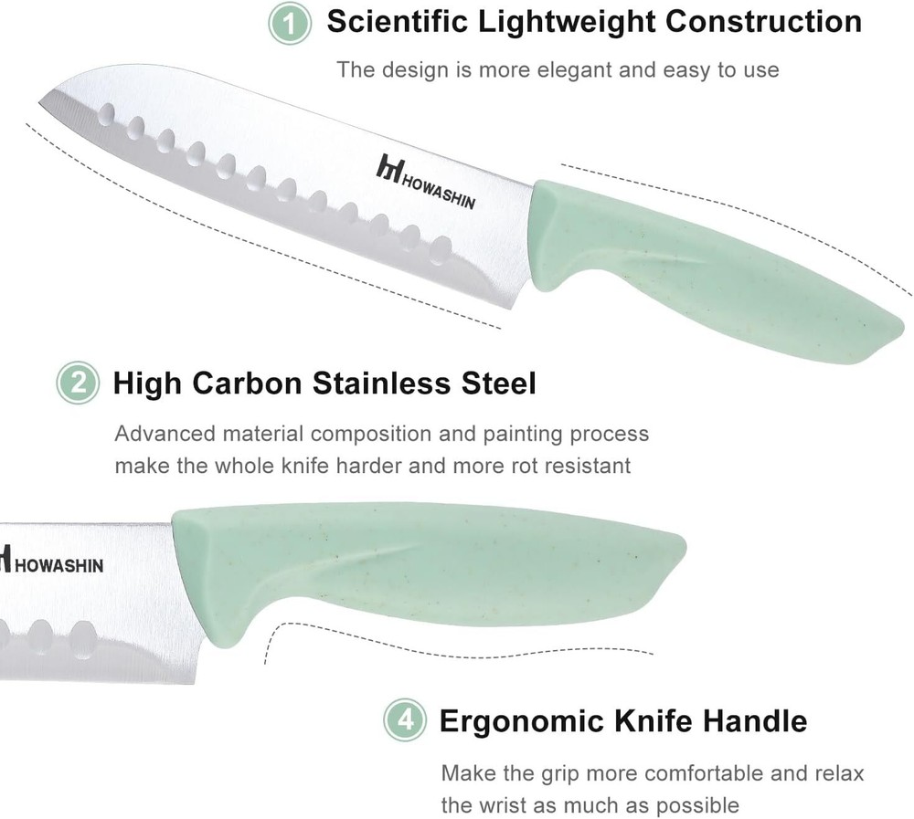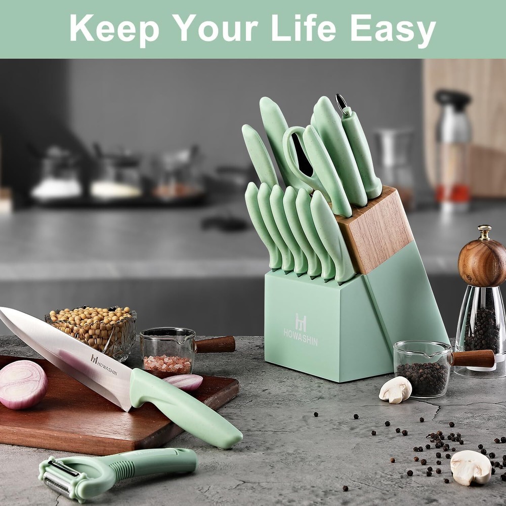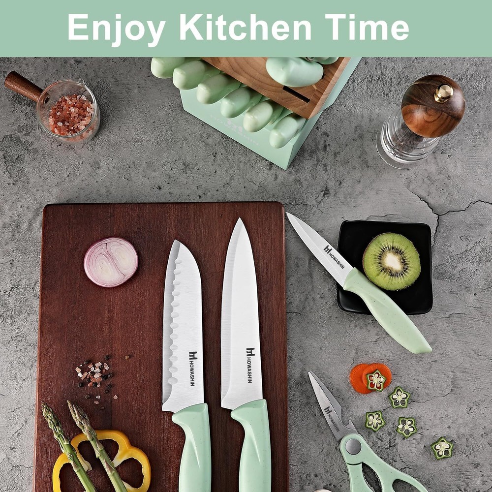 Product Description Knife Set With Block,15Pcs Knives Block Set,High Carbon German Stainless Steel Knife Set With Sharpener,Scissor and Peeler,Green Knife Block Set 【❥Professional 15Pc Knife Block Set】1*8" Chef Knife, 1*8" Bread Knife, 1*8" Slicing Knife, 1*7" Santoku Knife, 1*5" Utility Knife, 1*3.5" Paring Knife, 6*5"Paring Knife,5'' Kitchen Scissors,1 * Knife Sharpener and 1*Block Set. This professional-grade cutlery set easily handles all your kitchen tasks and needs, for every home chef or professional chef, this versatile kitchen knife set for chopping, dicing and slicing 【❥Sharp, Durable, Tough】The blade is made of 3Cr13Mov high-carbon stainless steel, with exquisite laser lines on the blade surface. Hand polishing gives the blade better durability while enhancing the knife's hardness, flexibility and corrosion resistance. After repeated forging, the strength is high. Rockwell hardness: 56±2 HRC 【❥Comfortable and Stable Handle】The handle is composed of environmentally friendly wheat and orange straw material. The handle is designed according to advanced ergonomics, greatly reducing the pressure on the wrist and providing the most comfortable holding conditions. This handle is more stable, balanced, tough, beautiful and easy to clean. 【❥Suitable for a variety of usage environments】Fifteen kinds of kitchen knives and accessories can meet the needs of cutting meat, cutting bone, cutting vegetables, cutting fruit and peeling, etc., can also be used in family kitchens, outdoor activities, restaurant production, etc., to meet the different needs of different groups of people, greatly improve the efficiency of use. 【❥Exquisite and high-end gift box】The knife set is packed in a luxurious gift box, and the high-end and environmentally friendly packaging makes the gift box look very high-end. Great gift for parents and friends on many festivals like Mother's Day, Father's Day, Thanksgiving, Christmas, New Year, Easter and birthdays. About Us We are a reputable seller with many years of experience selling on eBay. Our goal is to provide high-quality products and excellent customer service. Shipping Items will be shipped within 1-3 business days when we received payment. (Orders are not processed on weekends & holidays) Tracking information will be sent once item is shipped. Delivery time depends on destination and other factors Item is shipped to ebay address. Leaving correct address can minimize delay. For international shipping and shipping to Guam, Hawaii and Alaska, Please contact us before placing the order. International buyers please note: Import duties, taxes and charges are not included in the item price or shipping charges. These charges are buyer’s responsibility. We will try our best to reduce the risk of the custom duties. Local pick-up is unavailable at the moment. Contact Us We reply any email messages within 1 business / working days(off-duty at weekend). If you do not get a response from us, then please check your junk or spam mailbox. Our Business hours: Mon-Fri 9:00-18:00, UTC/GMT +8 hours. Please contact us either by clicking "contact seller" in the "purchase history" section or simply click "ask a question" at the bottom of this page. If you are unsatisfied with our item or service, please contact us before leaving any feedback. We are committed to resolve all issues in a friendly and satisfactory manner.