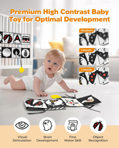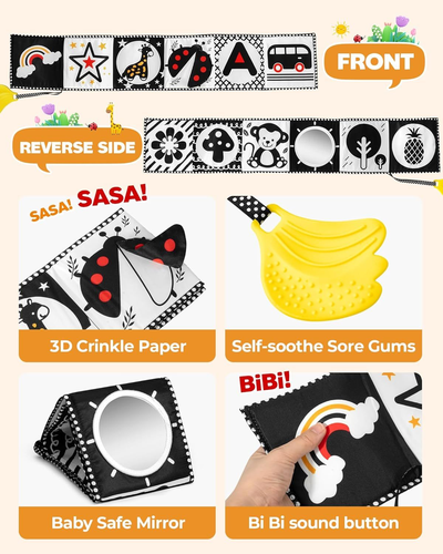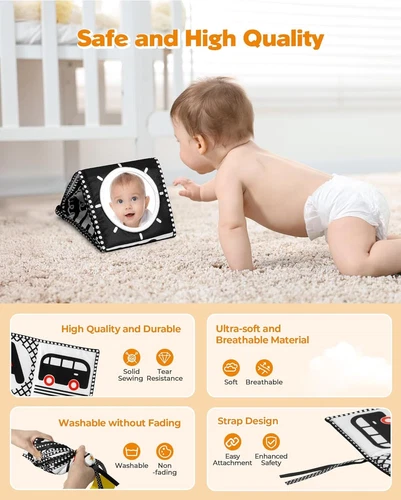 Black and White High Contrast Baby Toys 0-6 6-12 Months, Soft Book with Teether, Newborn Infants Tummy Time Toys, 0-3 3-6 Month Sensory Visual Stimulation, Montessori Learning Essentials LuxeFusion Product Description Features Visual Stimulation Design: Features a high-contrast black-and-white design that stimulates visual development. The baby safe mirror and 3D wing elements enhance visual and tactile experiences, capturing your baby’s attention and sparking curiosity Perfect Tummy Time Toy: Designed for Tummy Time to help babies explore their surroundings while on their stomachs. Supports fine motor skill development, helps prevent flat head syndrome, and strengthens arm and leg muscles for crawling Multi-Functional Interactive Experience: Delight your baby with the playful bi-bi sound button and crinkle paper in the 3D wings. These features create a symphony of sounds that enhance interaction and make playtime even more engaging Safe and BPA-Free Teether: Comfort your baby with the BPA-free teether, designed to soothe teething pain while adding an extra layer of play. Safe, soothing, and enjoyable for growing little ones Thickened Sponge Material: Made with thickened sponge material, the toy stands upright, is durable, and resistant to tearing. Non-toxic materials and meticulous stitching ensure long-lasting use and safety Great Gift for Newborns: Celebrate new arrivals with this high-contrast black-and-white baby book. It’s ideal for brain development, sensory play, tummy time, and car seat fun. A thoughtful gift that supports every stage of early growth Product Details Product Dimensions: 0.5 x 0.06 x 1.6 inches Item Weight: 3.52 ounces Item model number: YECW Manufacturer recommended age: 0 - 1 years Release date: August 9, 2024 Manufacturer: SHANTOU SHANGSILE TOYS CO., LTD Material: 100% POLYESTER Color: multicolored Brand: melican Material Type Free: BPA Free Item dimensions L x W x H: 0.5 x 0.06 x 1.6 inches 🚚 Free Shipping All orders ship free and fast to your doorstep. 🔁 Easy Returns Satisfaction guaranteed. 30-day returns, no questions asked. 💬 24/7 Support Contact us anytime; we’re here to help, day or night. Brought to you by LuxeFusion – Quality you can trust.