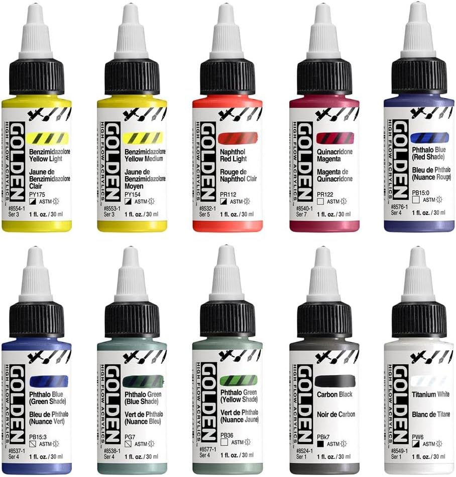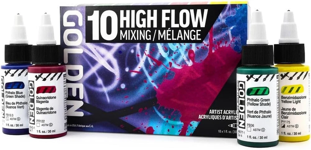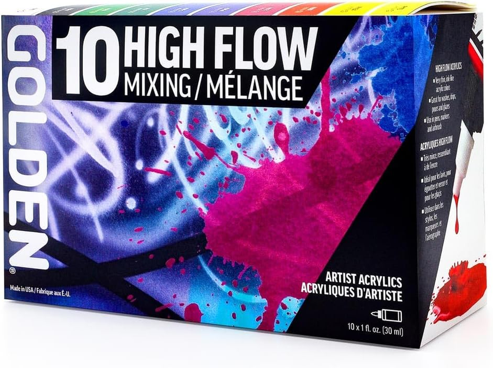 Store New Arrivals Add to Favorite View Feedback Contact High Flow Acrylics by GOLDEN, High Flow Mixing Set, 10 Colors, Professional Acrylic Paint Description Item model number 0000929-0 Part Number 0000929-0 Style Set Item Volume 10 Fluid Ounces Item Package Quantity 1 Color Multicolored Product Dimensions 2.38 x 5.94 x 4 inches Warranty Description No Warranty Item Weight 14.6 ounces Batteries Included? No Coverage Medium Batteries Required? No Package Information Bottle Special Features Washable Size 10 fl oz Paint Type Acrylic A warm and cool choice of each primary color in addition to other key colors allows the artist to mix an extensive range of colors with a limited palette Includes: Benzimidazolone Yellow Light, Benzimidazolone Yellow Medium, Naphthol Red Light, Quinacridone Magenta, Phthalo Blue (Red Shade), Phthalo Blue (Green Shade), Phthalo Green (Blue Shade), Phthalo Green (Yellow Shade), Carbon Black, and Titanium White PROFESSIONAL QUALITY colors combine the durability of acrylics with the versatility of ink, great for drawing, staining, dripping, pouring, calligraphy, color washes and spraying EXCEPTIONAL UTILITY – Formulated with flow improvers and retarders so colors are ready to use in dip pens, refillable markers or airbrushes with no thinning required. Made in the USA with globally sourced materials by an employee-owned company with more than 40 years of experience making paint for professional artists HIGH FLOW ACRYLICS are an ultra-thin paint with ink-like consistency that provide incredible versatility. They can go directly from bottle to airbrush, refillable marker or dip pen and work great for drawing, staining, dripping, pouring, calligraphy and color washes. High Flow offers a palette that includes many single-pigment colors, as well as Fluorescent and Iridescent colors. While it acts like an ink, it’s an acrylic so it's compatible with other GOLDEN Acrylic colors and mediums. ABOUT US We offer the best prices around on high quality products. Our E-store includes media such as books, movies, music and games while offering electronics, toys, sporting apparel, clothing, tools, general home, garden items and more. SHIPPING We are always working hard to ensure your package arrives as soon as possible. Please understand that some factors like weather, high postal traffic, and the performance of shipping companies are outside of our control. We offer free shipping to the lower 48 states and ship within 2 business days of payment, usually sooner. We do not accept P.O. Boxes. Please provide a physical address. RETURNS We offer a 30-Day Return Policy on items which you are not completely satisfied with. You have the option for a full-refund or an exchange of the item. No returns are available on items shipped outside of the USA. PAYMENT We accept PayPal. CONTACT US This page content is yet to come Please ad us to your favorite seller and visit again later Thank You CUSTOMER SATISFACTION We try our very best to make sure every customer is completely satisfied. If there's a problem, message us! We're happy to help.