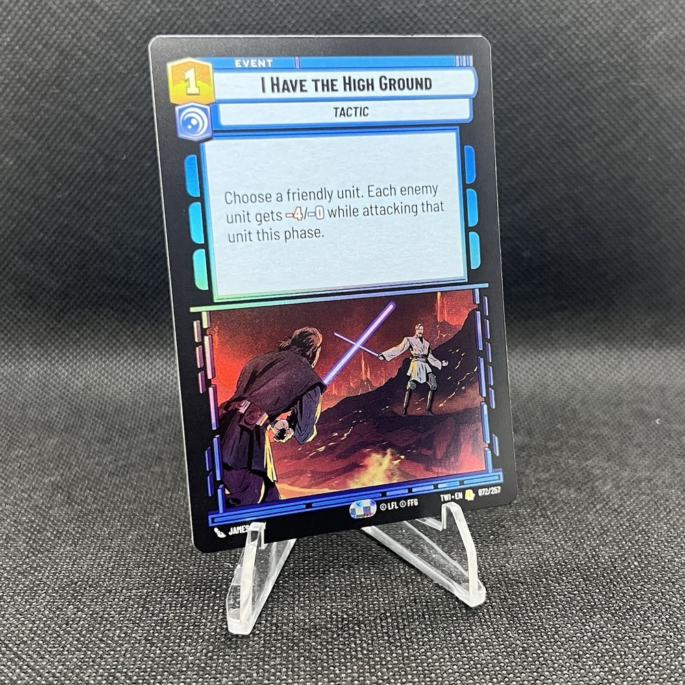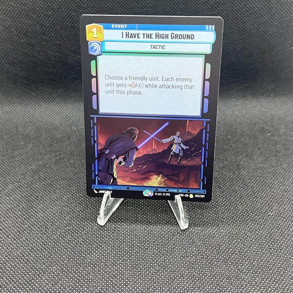 Elevate your Star Wars CCG collection with the "I Have the High Ground (Foil)" card from the Twilight of the Republic set. This rare tactical foil card, featuring the strategic prowess of Anakin Skywalker and the wisdom of Obi-Wan Kenobi, is a must-have for any serious player or collector. With its stunning foil finish, this card brings a shimmering touch to your deck or display. Crafted with quality card stock and produced in the United States, this English language card is suitable for ages 8 and up. As card number 072/257 from the unlimited series, it holds a special place in the Star Wars universe, reflecting the intricate lore and adventure that has captivated fans for years.