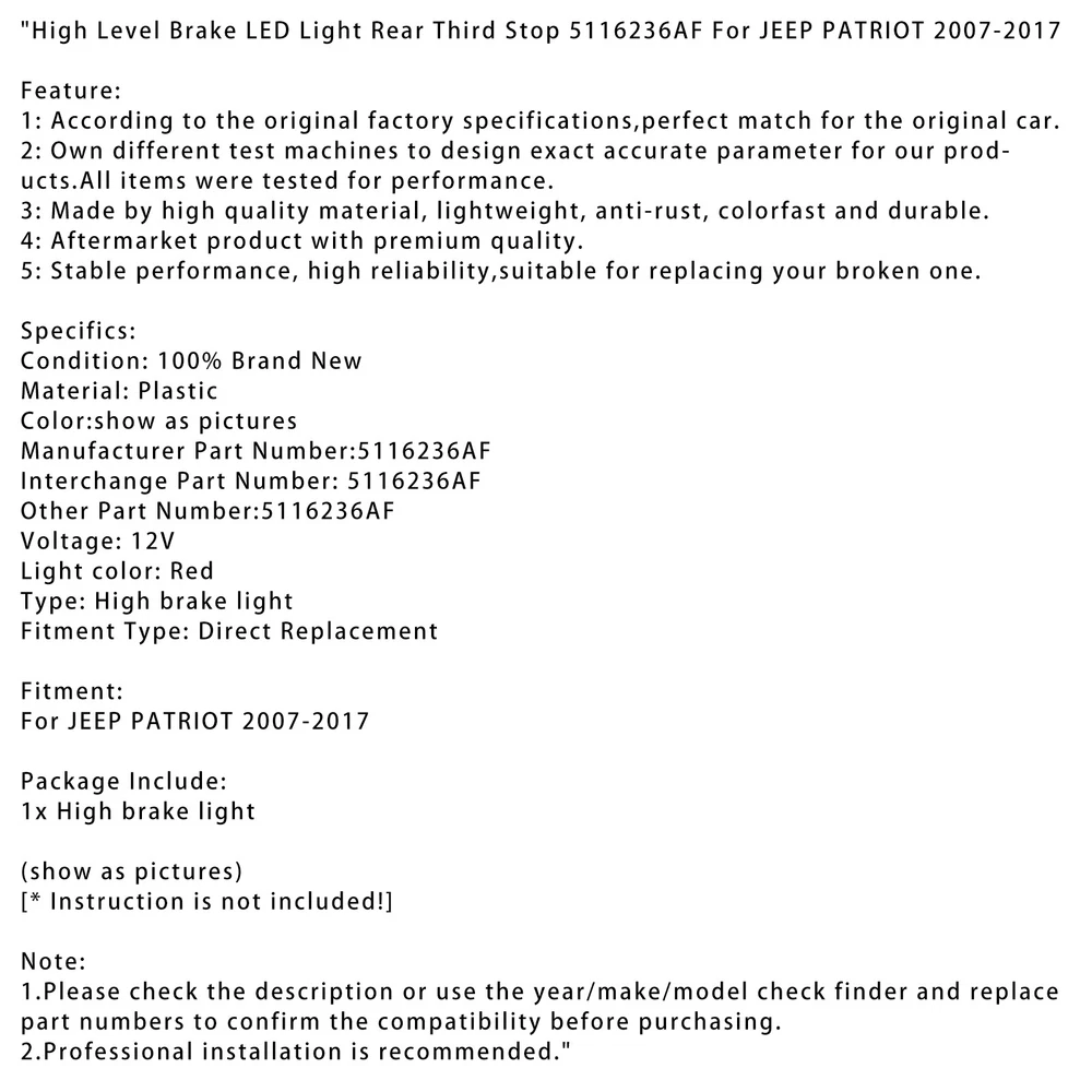 NEW-00004 High Level Brake LED Light Rear Third Stop 5116236AF For JEEP PATRIOT 2007-17 DESCRIPTION High Level Brake LED Light Rear Third Stop 5116236AF For JEEP PATRIOT 2007-2017 Feature: 1: According to the original factory specifications,perfect match for the original car. 2: Own different test machines to design exact accurate parameter for our products.All items were tested for performance. 3: Made by high quality material, lightweight, anti-rust, colorfast and durable. 4: Aftermarket product with premium quality. 5: Stable performance, high reliability,suitable for replacing your broken one. Specifics: Condition: 100% Brand New Material: Plastic Color:show as pictures Manufacturer Part Number:5116236AF Interchange Part Number: 5116236AF Other Part Number:5116236AF Voltage: 12V Light color: Red Type: High brake light Fitment Type: Direct Replacement Fitment: For JEEP PATRIOT 2007-2017 Package Include: 1x High brake light (show as pictures) [* Instruction is not included!] Note: 1.Please check the description or use the year/make/model check finder and replace part numbers to confirm the compatibility before purchasing. 2.Professional installation is recommended. About Us Shipping Terms Of Sale Contact Us Areyourshop has committed to do our utmost to serve more vehicles models with the most competitive products both in price and service, including headlights, foglights, taillights,headlight assembly, etc., aiming at the largest group of customers. Paired with our fast shipping and satisfaction guarantee, we’re able to ensure that all the customers can get the product when they need it. Customer Satisfactory 1.We back our commitment with superb service, 100% full money back and a customer satisfaction guarantee. 2.I am here and ready to assist you with any questions or concerns you might have before or after the purchase. 3.My goal is to make sure you are a happy customer and pleasant shopping with us. Feedback If you are satisfied with the purchase and our total service, your comment is very important in our business success. Please take a minute to leave us a positive feedback with an overall Detailed Selling Rating (DSR) of 5. Our eBay account setup auto feedback, so eBay system gives you automatically Positive feedback back after your positive feedback left. If you plan to give us a neutral/negative feedback Or open ebay/paypal case, please write to us immediately so that we can do our best to resolve your problem. United States Buyers Parcel will via USPS or UPS from us United States warehouse Shipping Time Usually ,Parcel will be delivered 2-7 working day include Handling time. Sometimes shiping time may has a little delay, such as Bad wether,Holidays We stand behind everything that we sell and will do everything possible to assure you are satisfied. When you receive your purchase if you are not 100% satisfied, please sent me ebay message and we will do our best to make you happy. If you still want to return your purchase, simply ship the item(s) back to us and we will refund your original purchase price and the original shipping charge. Buyers are responsible for the postal cost of returning the items. We must be notified of the intent to return your item within 30 days of receiving the item. Items returned must be in the same condition that they were received. How to return 1,Please ask us for return address . 2,Shipping back the package . The RMA#(Return Merchant Authorization Number = Your ebay ID) must be clearly written on the return package ,Otherwise the package will be refused. 3,Sent us the return tracking number. 4,All returns will be inspected prior to a credit being issued. If you have any questions, welcome to send us ebay message. We strive to answer all questions and resolve any problems as quickly as possible. Business Hours: HongKong Time GMT+8:00 Monday-Saturday 9:00-17:00 About Us About Item All items sold by us are being described to the best of our abilities, as accurate as possible, and with utmost conscientiousness on our part. However, to avoid any potential oversights, I respectfully request your assistance in helping us to make this a mutually satisfactory transaction by THOROUGHLY reviewing item description and photos, and asking all questions PRIOR TO BIDDING. Customer Satisfactory 1.We back our commitment with superb service, 100% full money back and a customer satisfaction guarantee. 2.I am here and ready to assist you with any questions or concerns you might have before or after the purchase. 3.My goal is to make sure you are a happy customer and pleasant shopping with us. Feedback If you are satisfied with the purchase and our total service, your comment is very important in our business success. Please take a minute to leave us a positive feedback with an overall Detailed Selling Rating (DSR) of 5. Our eBay account setup auto feedback, so eBay system gives you automatically Positive feedback back after your positive feedback left. If you plan to give us a neutral/negative feedback Or open ebay/paypal case, please write to us immediately so that we can do our best to resolve your problem. Shipping United States Buyers Parcel will via USPS or UPS from us United States warehouse Shipping Time Usually ,Parcel will be delivered 2-7 working day include Handling time. Sometimes shiping time may has a little delay, such as Bad wether,Holidays Terms Of Sale We stand behind everything that we sell and will do everything possible to assure you are satisfied. When you receive your purchase if you are not 100% satisfied, please sent me ebay message and we will do our best to make you happy. If you still want to return your purchase, simply ship the item(s) back to us and we will refund your original purchase price and the original shipping charge. Buyers are responsible for the postal cost of returning the items. We must be notified of the intent to return your item within 30 days of receiving the item. Items returned must be in the same condition that the