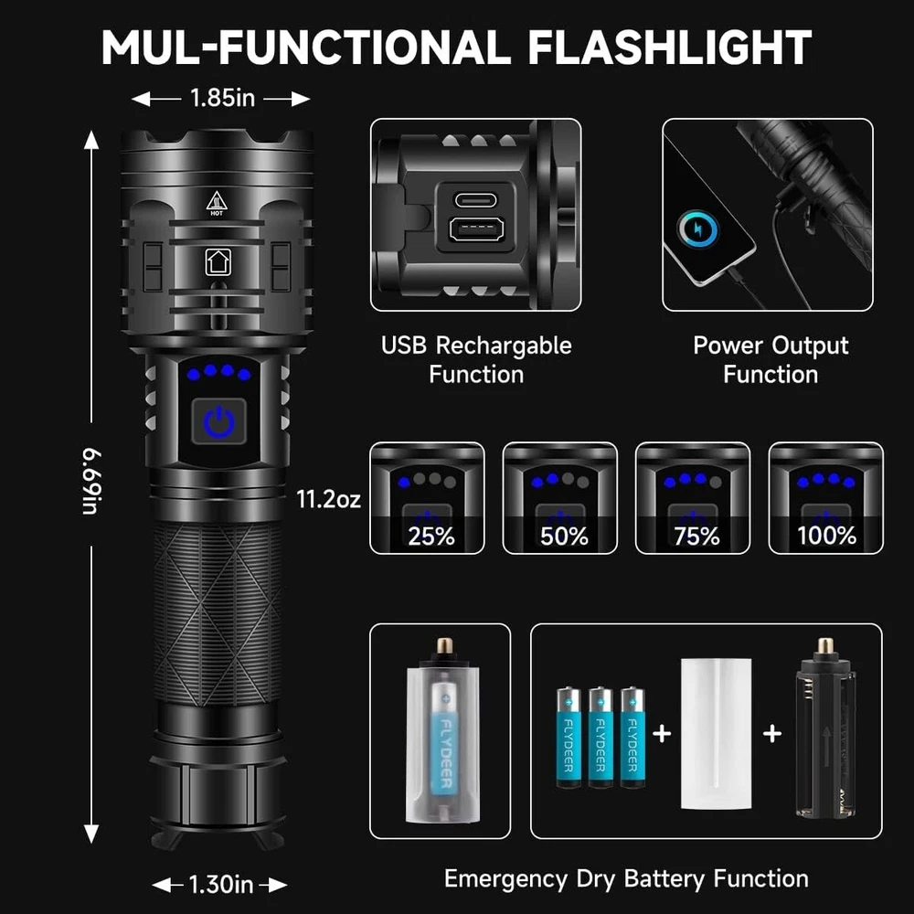 High Power 990000L Tactical Flashlight - Adjustable Modes, USB Rechargeable ‹ › ‹ › ‹ › ‹ › ‹ › ‹ › ‹ › ‹ › ‹ › High Power 990000L Tactical Flashlight Adjustable Modes, USB Rechargeable Features: Unmatched Brightness: Equipped with a cutting-edge P70.2 LED chip, this flashlight produces an astounding 990,000 lumens of bright light, illuminating an expansive area of up to 1300 ft² or reaching distances of 1500 ft . Long-lasting Performance: Thanks to its upgraded 5000mAh battery , the tactical flashlight offers an incredible 12 hours of continuous use on a full charge, empowering you for extended adventures without worry. Rapid Charging: The flashlight features a Type-C fast-charging port for unprecedented efficiency in recharging, complemented by four power indicators for easy monitoring of battery levels. Versatile Modes: Enjoy five lighting modes including high, medium, low, strobe, and SOS, to adapt your light output to any situation. Adjustable Focus: Easily switch between a floodlight setting for wide-area illumination and a spotlight for long-range visibility by adjusting the flashlight's head. Durability & Multi-functionality: Robust Build: Constructed from aviation-grade aluminum alloy, this tactical flashlight is designed to withstand the elements with an IP67 waterproof rating and shatter-resistant capabilities. Multi-functional Design: Comes equipped with a USB output port to charge your electronic devices, a head cusp designed for safety hammer use, and a dry battery function for emergency situations. What’s Included: 1 * LED Tactical Flashlight 1 * Rechargeable Battery 1 * Type-C Charging Cable 1 * Dry Battery Fix Bracket 1 * Carrying Lanyard 1 * Protective Packing Box Why Choose the High Power Tactical Flashlight? In a world where reliability meets functionality, the High Power 990000L Tactical Flashlight stands out as an essential companion for all your adventures. Whether you're navigating through dark trails, ensuring safety during emergencies, or simply illuminating your surroundings while camping or hiking, this flashlight delivers unparalleled brightness and adjustability. It's not just a flashlight; it's your trusted partner in innovation and safety. Order the High Power Tactical Flashlight today and shine a light on your adventures with confidence! Shipping Free & Fast Shipping - We offer free shipping to most of the USA with a normal delivery time of 3-7 days. However, due to the current situation, additional delivery time (up to 3 weeks) may be required for some items. Alternative Carriers - We may use alternative carriers (e.g. USPS, FedEx, UPS, etc.) to ensure your package arrives safely and on time. Due to the use of multiple carriers, we are unable to provide a tracking number automatically. Handling Time - Orders are processed and shipped within 1-2 business days of receiving cleared payment. Shipping Restrictions - Shipping to Alaska, Hawaii, Puerto Rico, Guam, and other US territories may incur shipping charges or delivery restrictions. Please contact us before ordering, or your order can be refunded/cancelled. State Restrictions - There may be restrictions based on your state of purchase. For example, certain items may not be shipped to California due to state regulations. Contact for Tracking Updates - If you require tracking updates or have any concerns about the delivery of your order, please feel free to contact us, and we will be happy to assist you. Return 30-Day Hassle-Free Returns - We want you to be completely satisfied with your purchase. If you are not, you can return the item within 30 days of receiving it for a full refund or exchange. Easy Return Process - To start a return, simply contact us and we will provide you with a prepaid return shipping label and detailed instructions. Restocking Fee - There are no restocking fees for returns. However, the buyer is responsible for return shipping costs if the return is not due to a seller's error. Refund Processing Time - Refunds will be processed within 5 business days of receiving the returned item in its original condition. Payment We accept all major credit cards, PayPal, and Apple Pay for your convenience. Your payment information is secure and encrypted to ensure a safe and seamless transaction. Please complete your payment within 3 days of purchase to avoid any delays in shipping. Feedback Your feedback is extremely important to us. We strive to provide the best products and customer service possible. If you are satisfied with your purchase, please take a moment to leave us a positive review. If you have any concerns or issues with your order, please contact us before leaving negative feedback. We are committed to resolving any problems and ensuring your satisfaction. Contact Us If you have any questions or concerns, please feel free to reach out to our customer support team. You can contact us through the eBay messaging system. We are available Monday to Friday, 9:00 am to 5:00 pm EST, and we will do our best to respond to your inquiry within 24 hours. Thank you for supporting our small family business! UPC: Not Set Voltage: 5V Item Height: Rechargeable Flashlights Item Length: Rechargeable Flashlights Item Weight: 11.2 ounces Item Width: Not Set Model: Not Set Lumens: 990000 lumens Number of LEDs: 1 Unit Quantity: 1 Features: Rechargeable,Waterproof,Adjustable light modes,Adjustable focus,USB output port,Safety hammer feature,Dry battery function Material: Aluminum,Aviation grade aluminum alloy Brand: Unbranded Type: Flashlight Lighting Technology: LED Power Source: Battery Operating Range: 1500 feet MPN: Not Set Battery Technology: Li-Ion Number of Batteries: 1 Color: Black Country/Region of Manufacture: Not Set IP Rating: IP67 Operating Time: More Than 10 Hours Number of Lights: 1-3 Unit Type: oz Personalize: Not Set